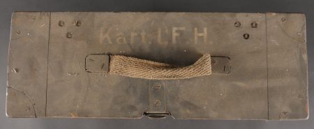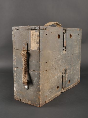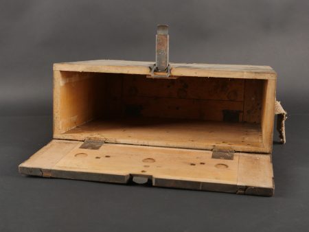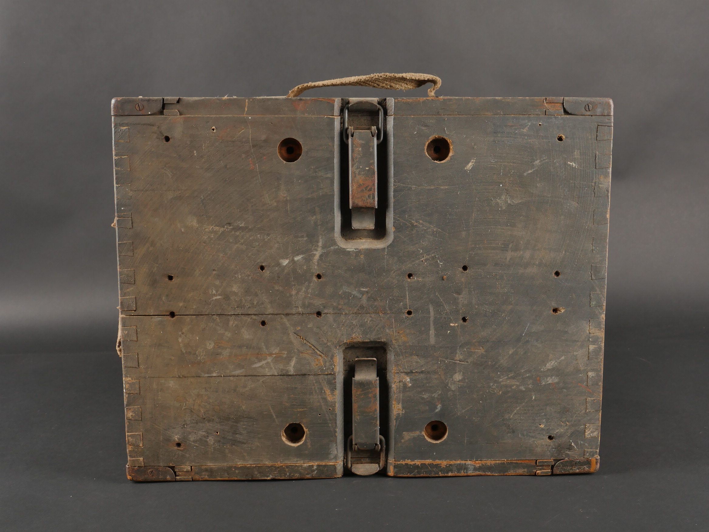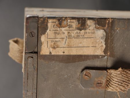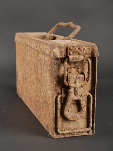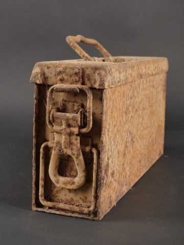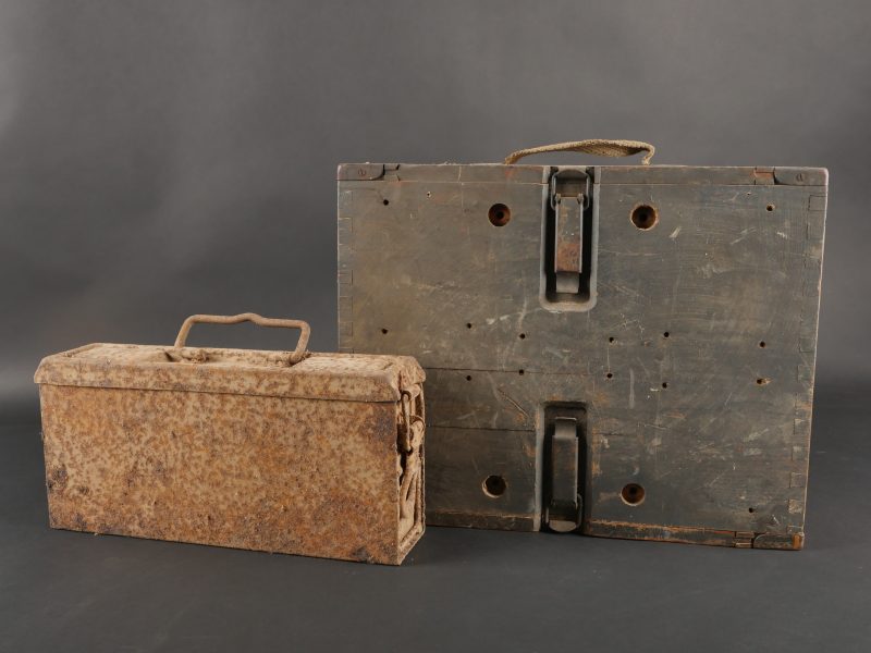 Détails de la vente >Allemagne ww2 caisses pour munitions. Belle caisse pour douille de l.F.G. à double ouverture, avec ses poignées en toile, une cassée. Et une caisse MG sable oxydée.
