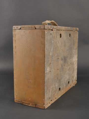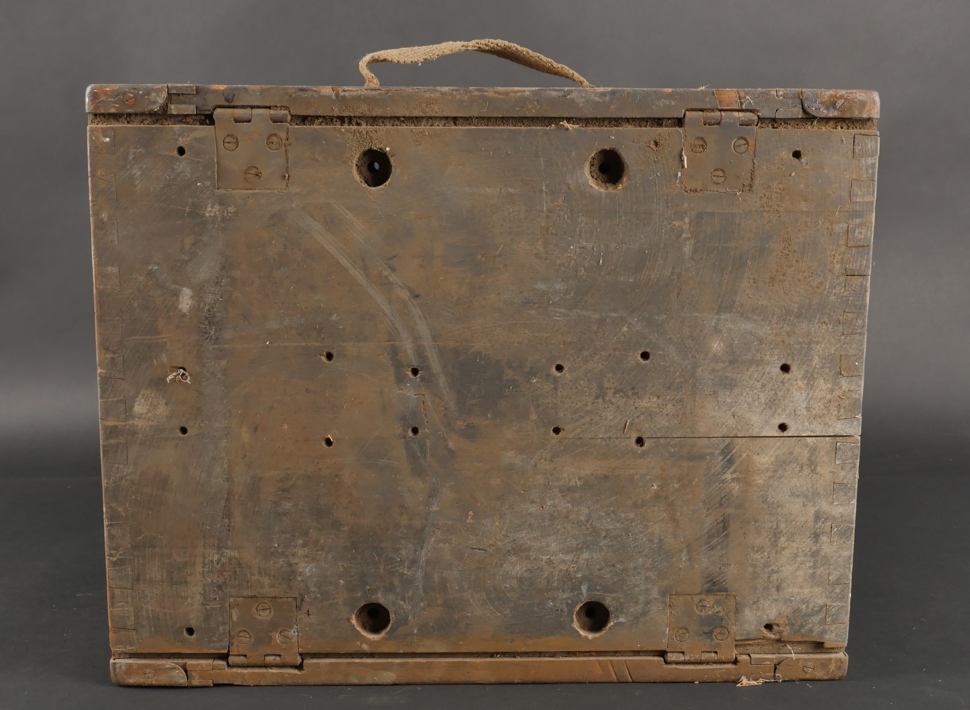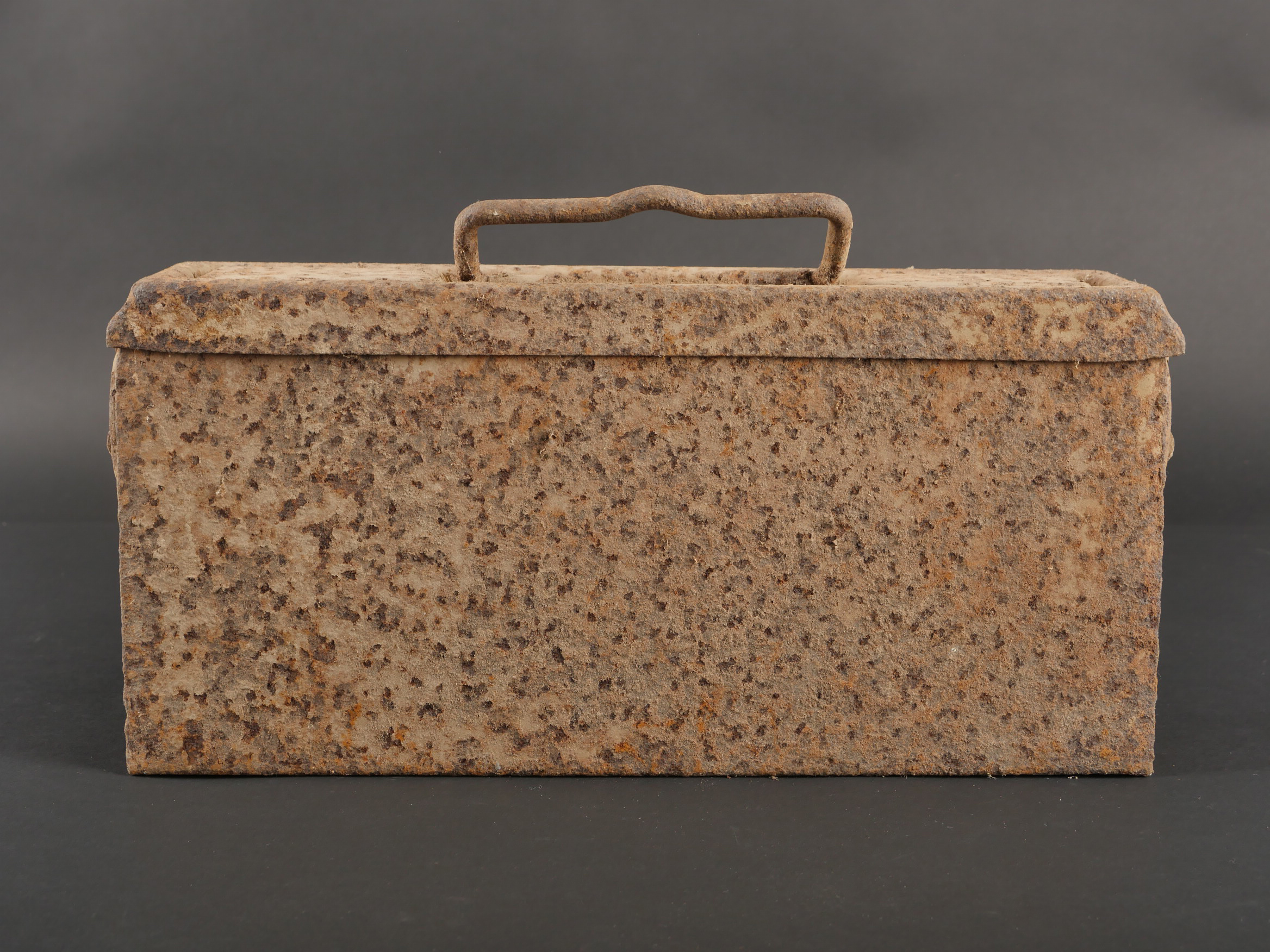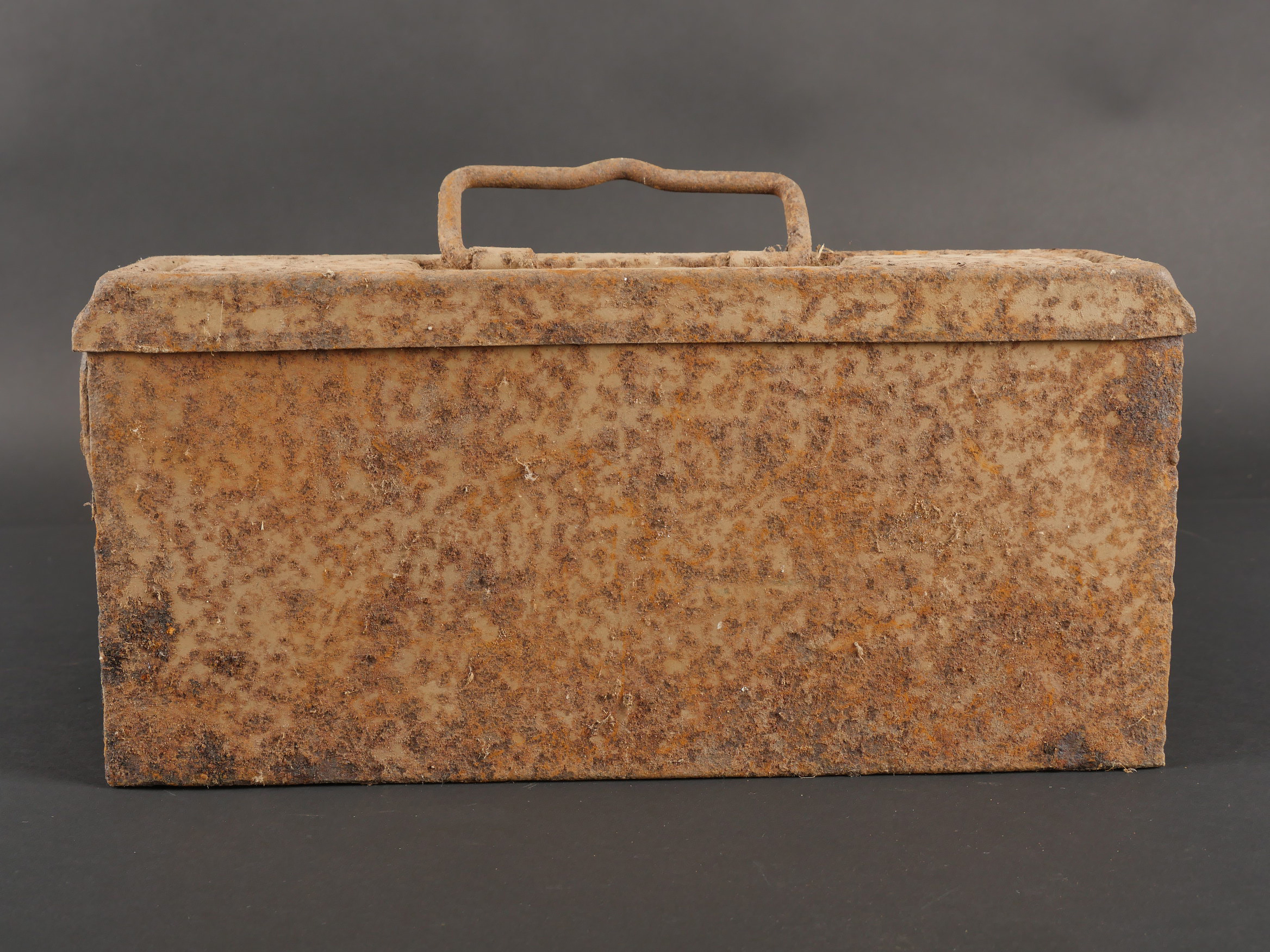 Détails de la vente >Allemagne ww2 caisses pour munitions. Belle caisse pour douille de l.F.G. à double ouverture, avec ses poignées en toile, une cassée. Et une caisse MG sable oxydée.