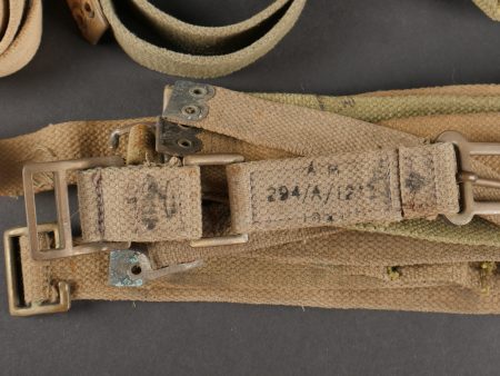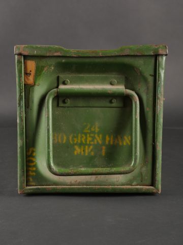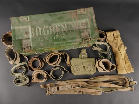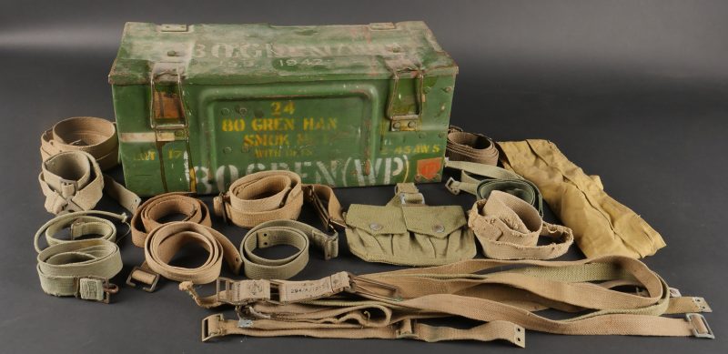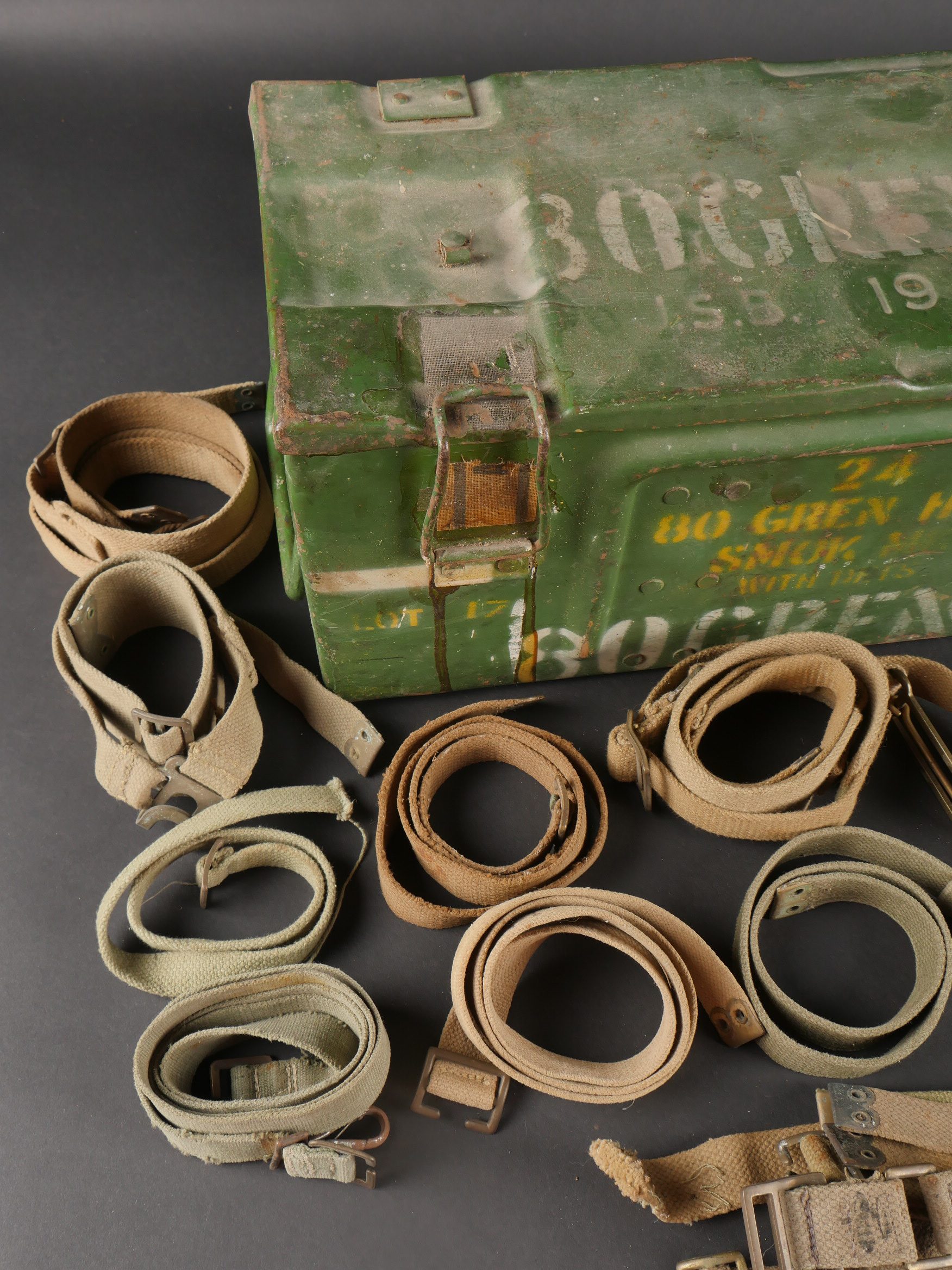 Anglais ww2 caisse pour grenades et fort lot de web. Caisse en métal datée 1942 pour grenades fumigènes, contenant un lot important de Web anglais, peut-être un peu d’ABL. On y trouve cartouchière, bretelles de brelage, aiguillettes armée de terre et Air Ministry, bretelle de sac à dos, sangles.