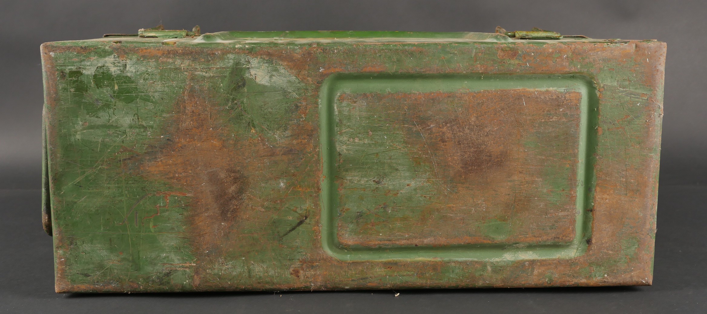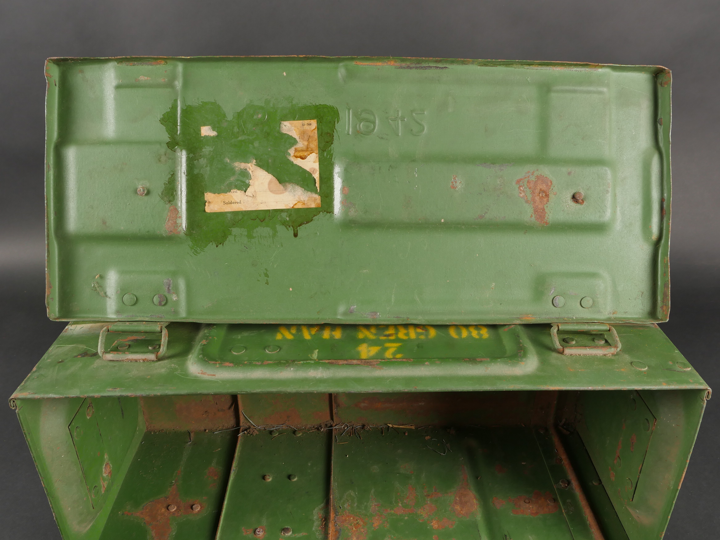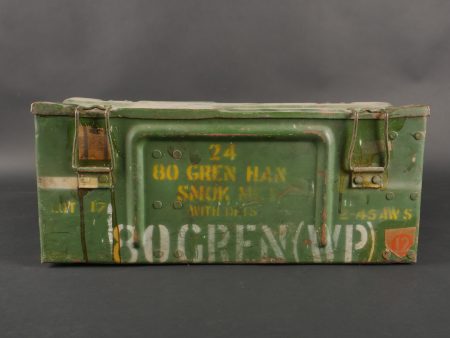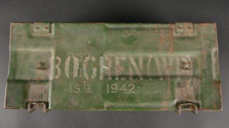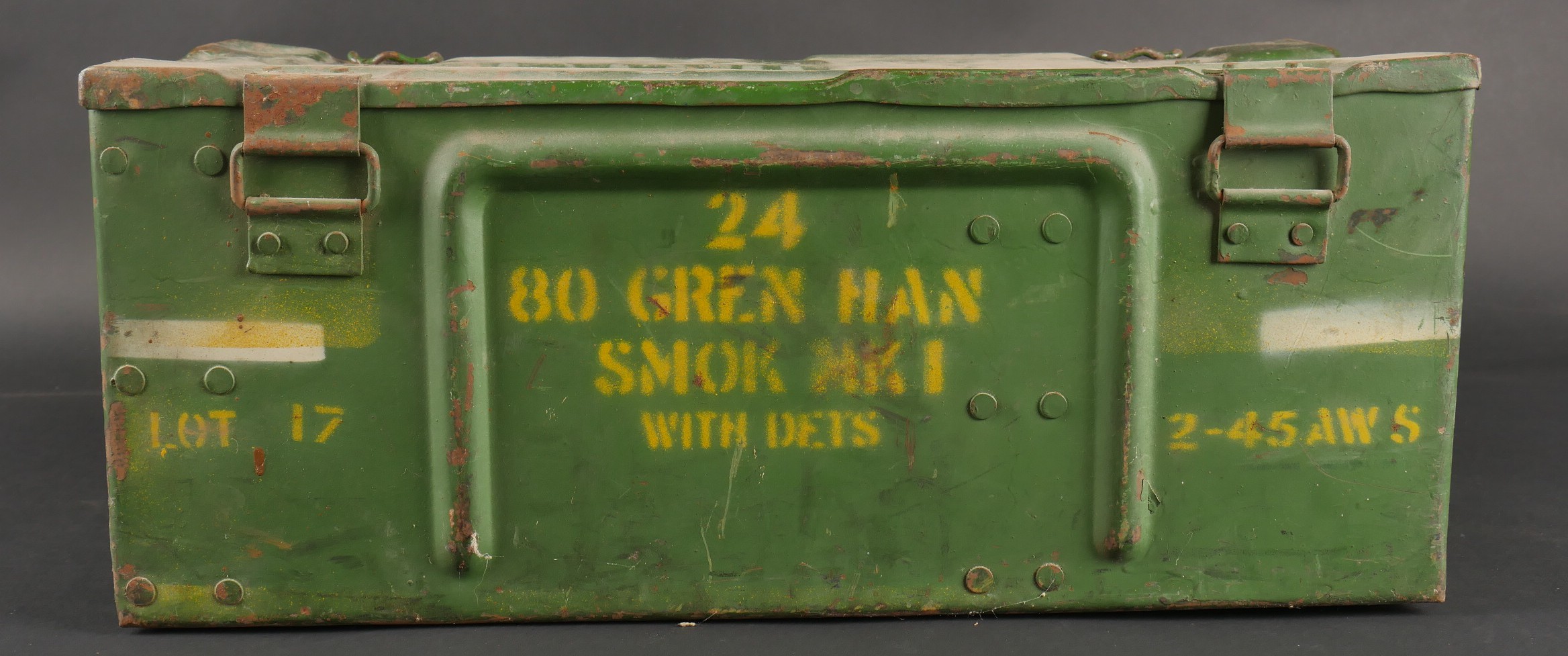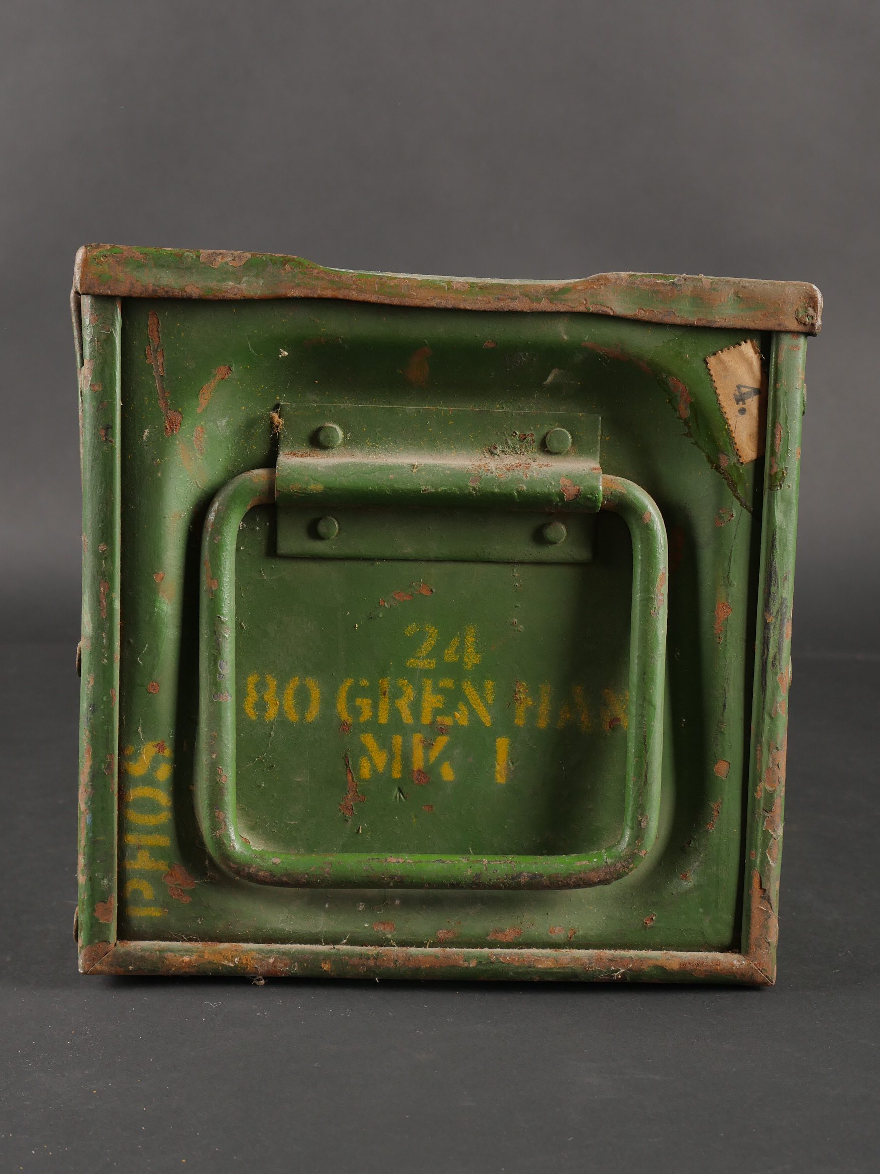Détails de la vente >Anglais ww2 caisse pour grenades et fort lot de web. Caisse en métal datée 1942 pour grenades fumigènes, contenant un lot important de Web anglais, peut-être un peu d’ABL. On y trouve... en savoir plus
