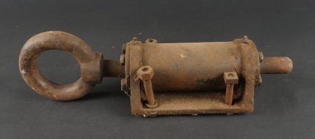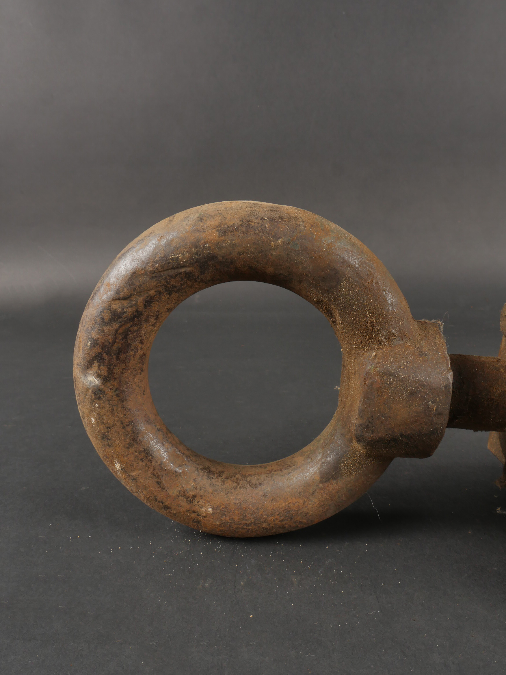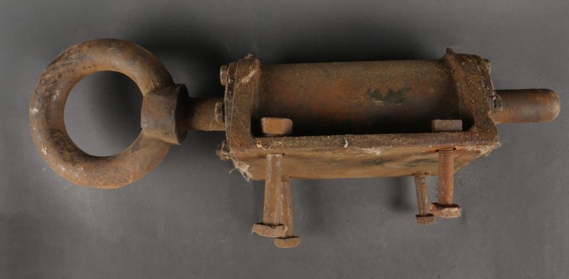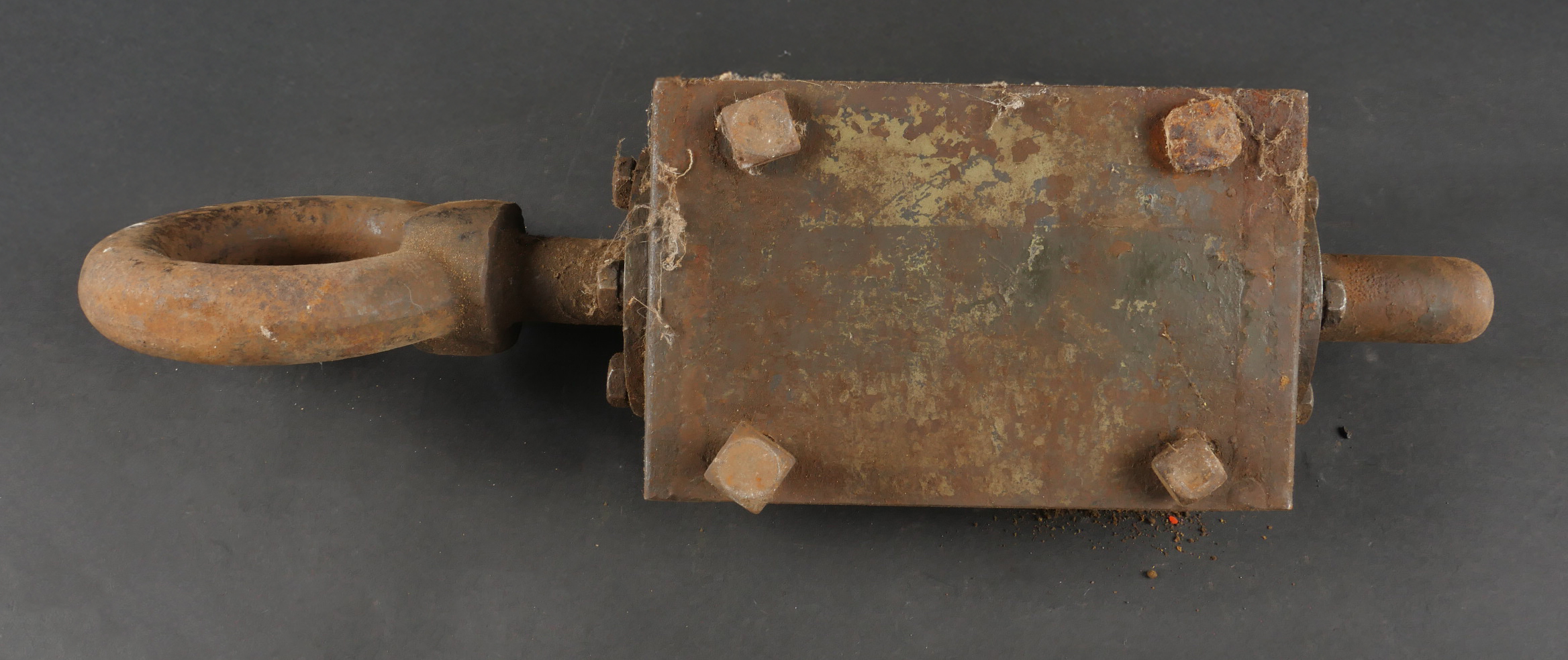 Détails de la vente >Anneau d’attelage ou remorquage lourd à identifier. Reste de peinture vert clair au dessous de la plaque