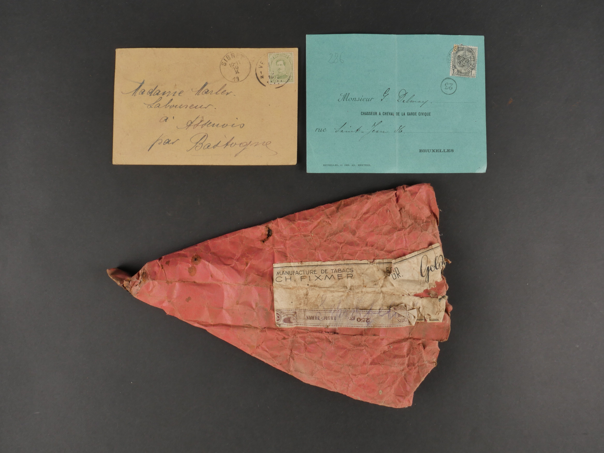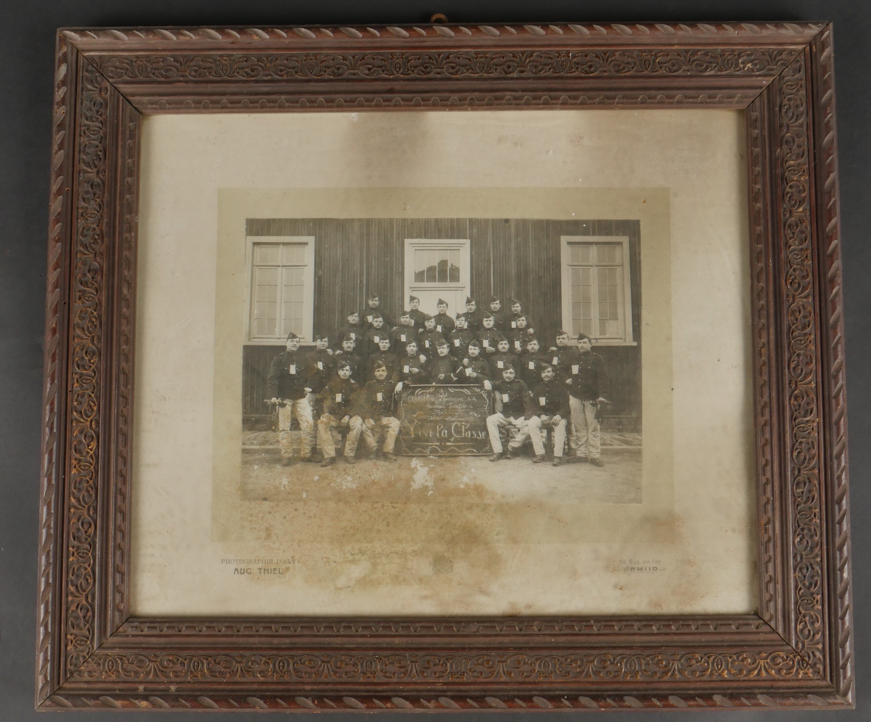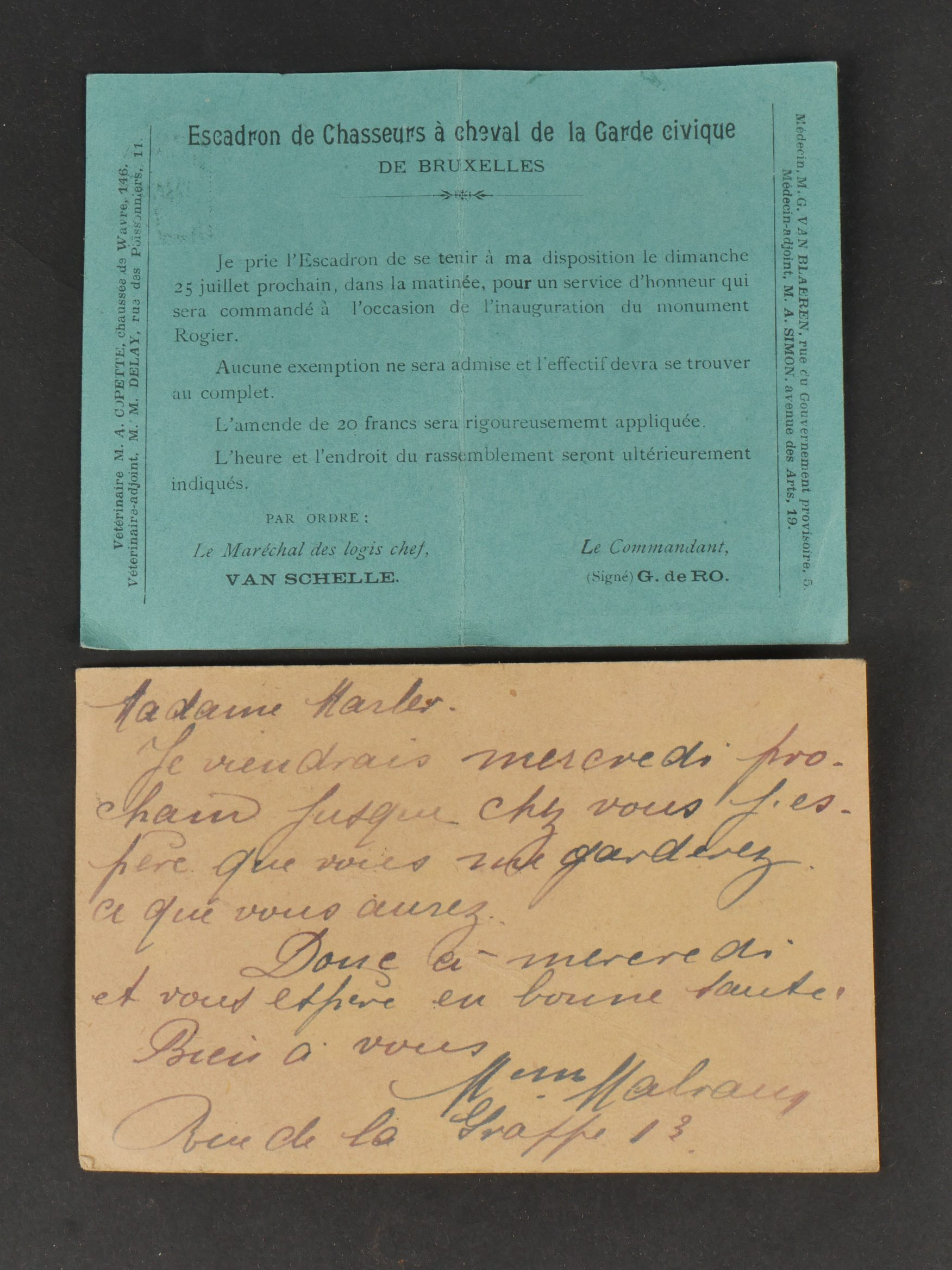 Belgique 1890-1914 Photo Artilleurs Namur et document Chasseur à Cheval. Cadre avec photo d’artilleurs de la forteresse de Namur, classe 1910-1912. Une convocation d’un chasseur à cheval de la Garde Civique pour service d’honneur à l’inauguration d’in monument en 1897. On joint un paquet papier de tabac vide, époque à déterminer.