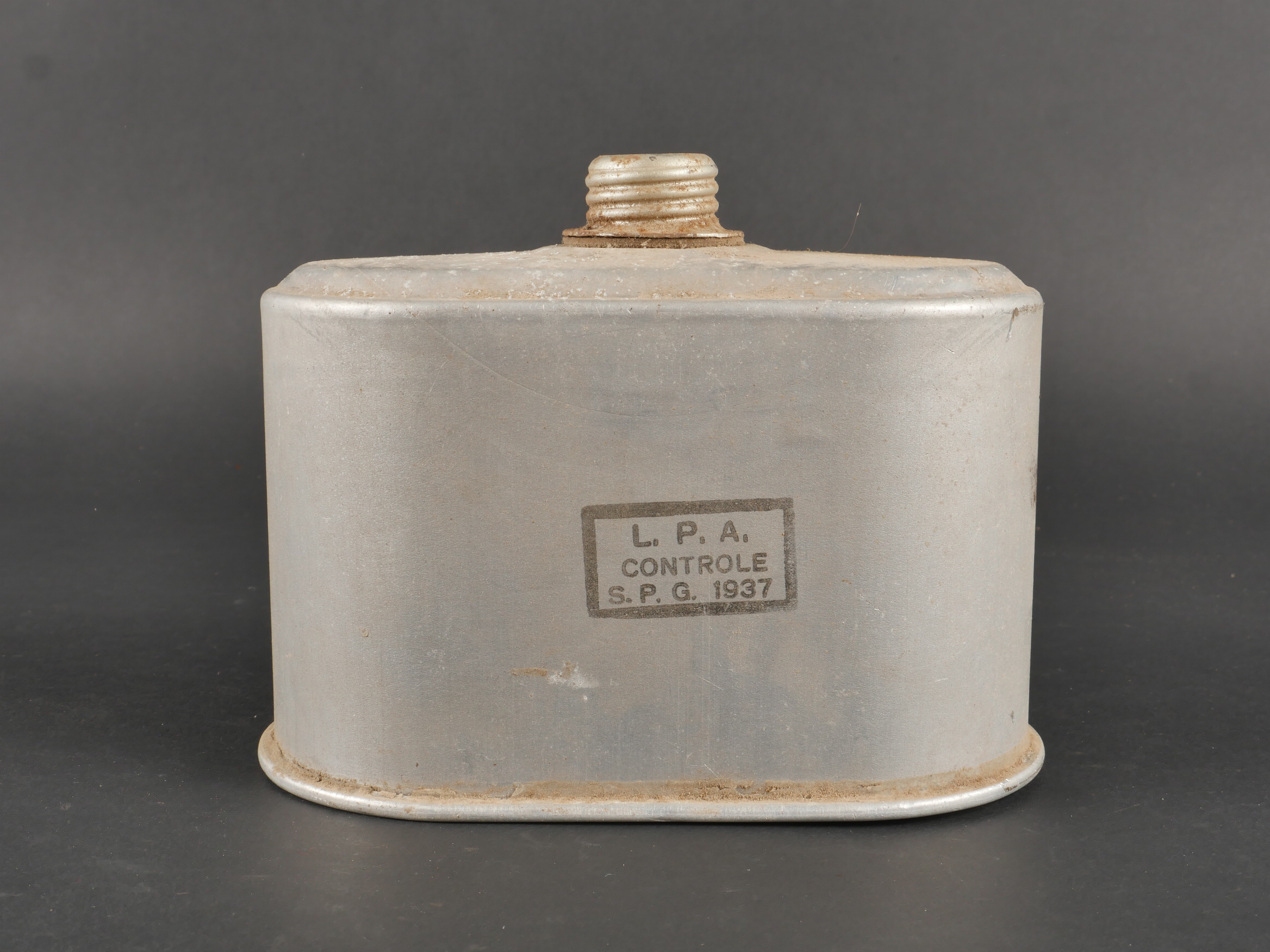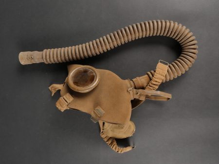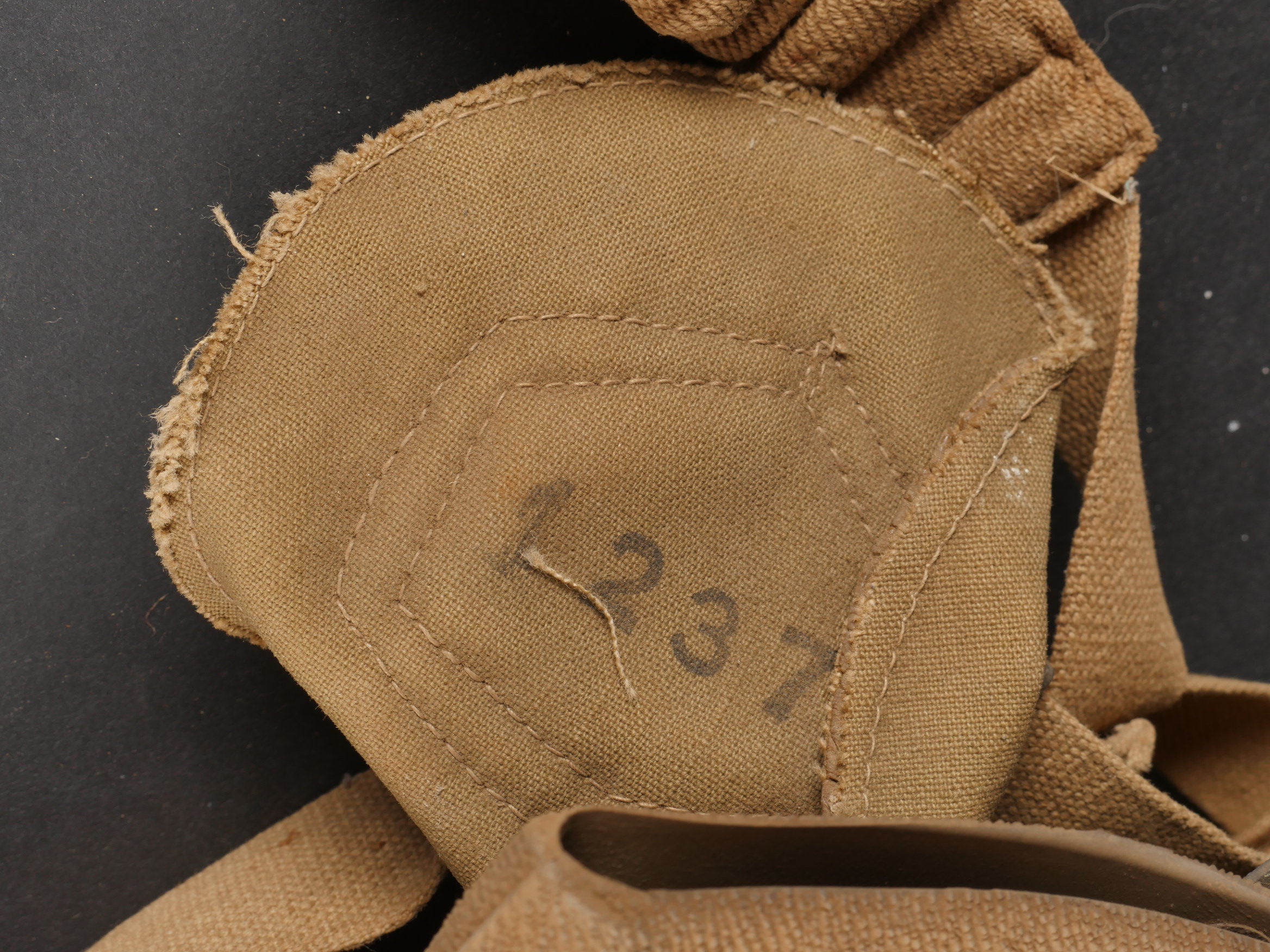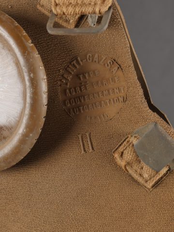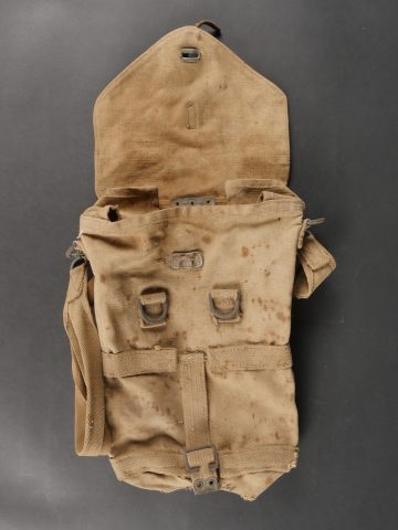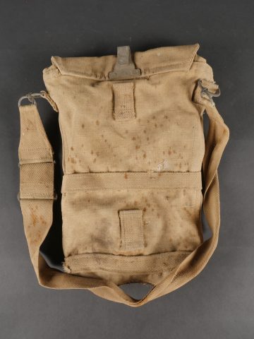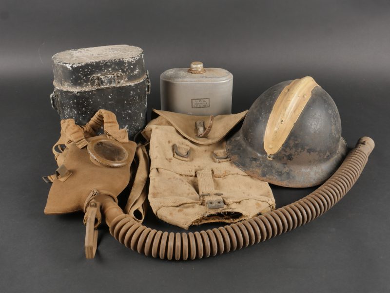 Belgique WW2 casque et équipement. Casque Adrian Mle 1926 peint en noir, le lion et le cimier peints en blanc, avec coiffe et jugulaire. Un masque anti-gaz dans sa sacoche toile, une cartouche filtrante aluminium datée 1937 et une gamelle grand modèle, anse postérieure