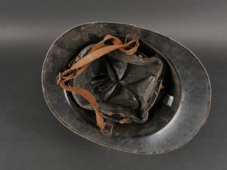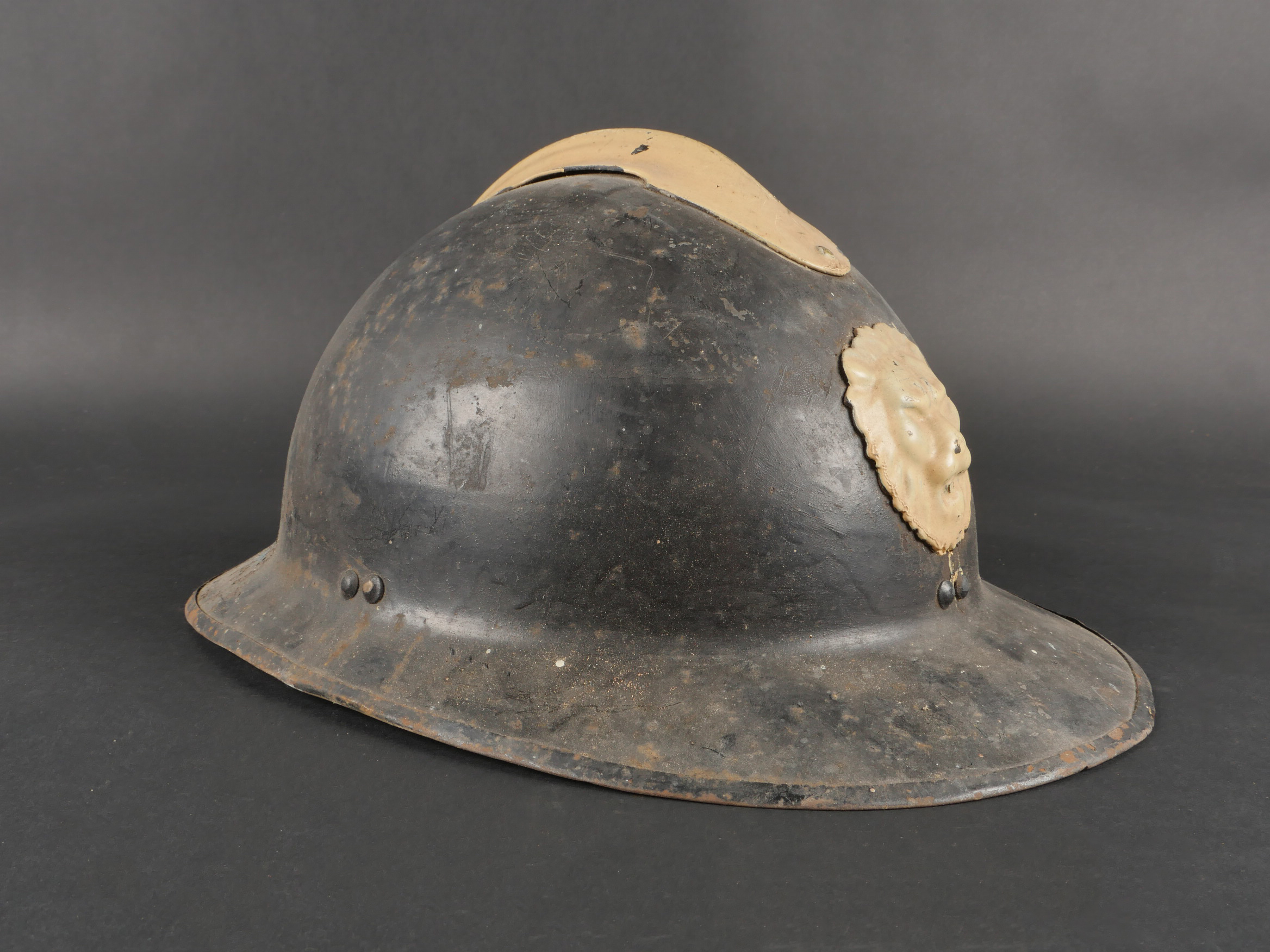 Belgique WW2 casque et équipement. Casque Adrian Mle 1926 peint en noir, le lion et le cimier peints en blanc, avec coiffe et jugulaire. Un masque anti-gaz dans sa sacoche toile, une cartouche... en savoir plus