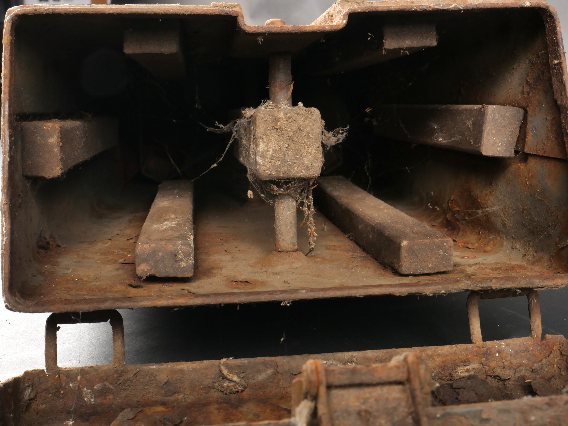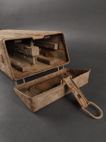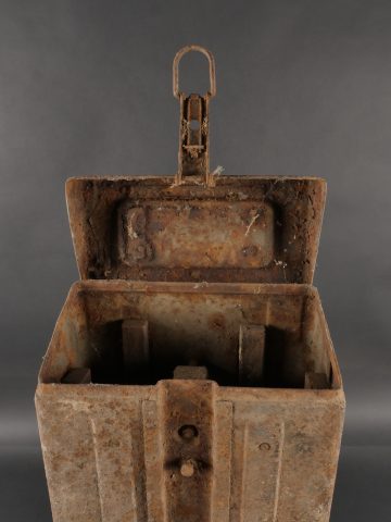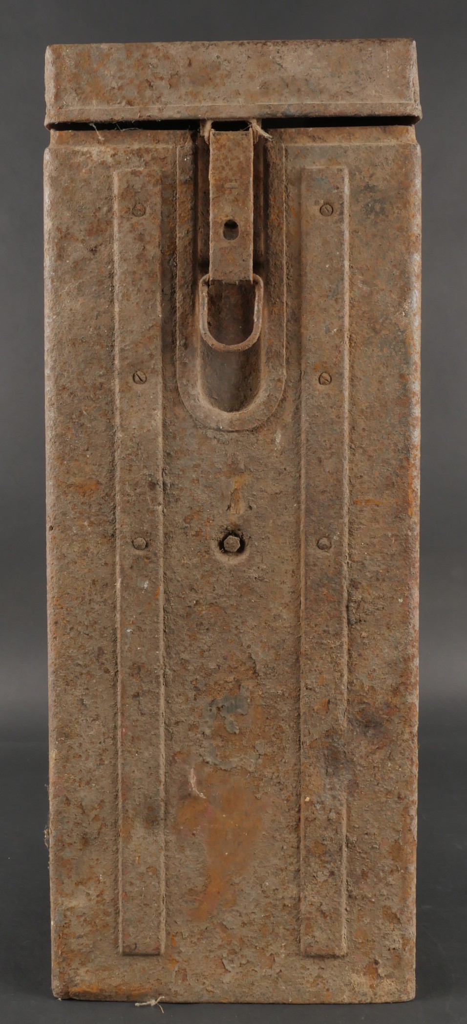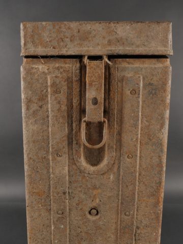 Détails de la vente >Caisse allemande pour 2 coups de 7,5 cm KwK37 pour PzIV et StugIII. Caisse en bois pour de coups de 7,5 cm de blindés allemands, avec restes de peinture, compartiments internes présents