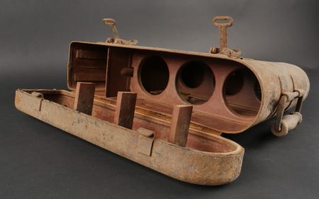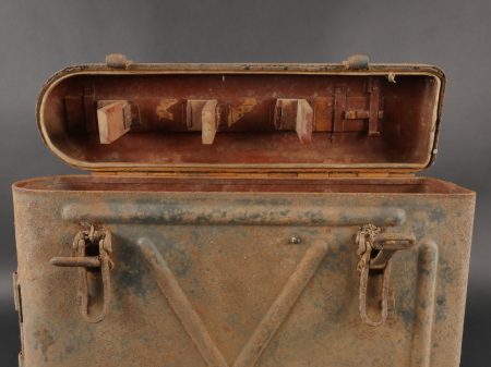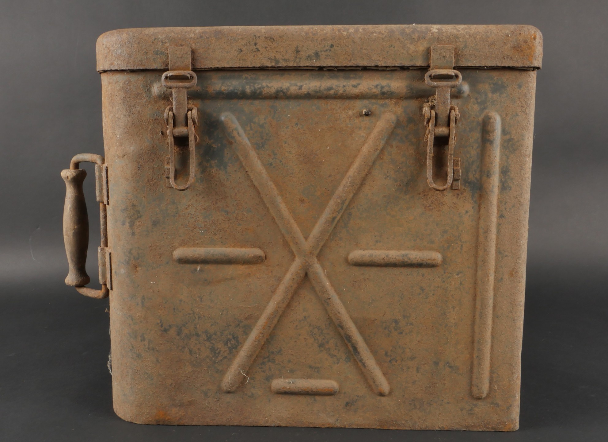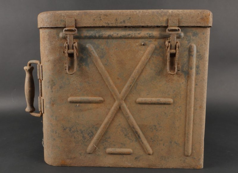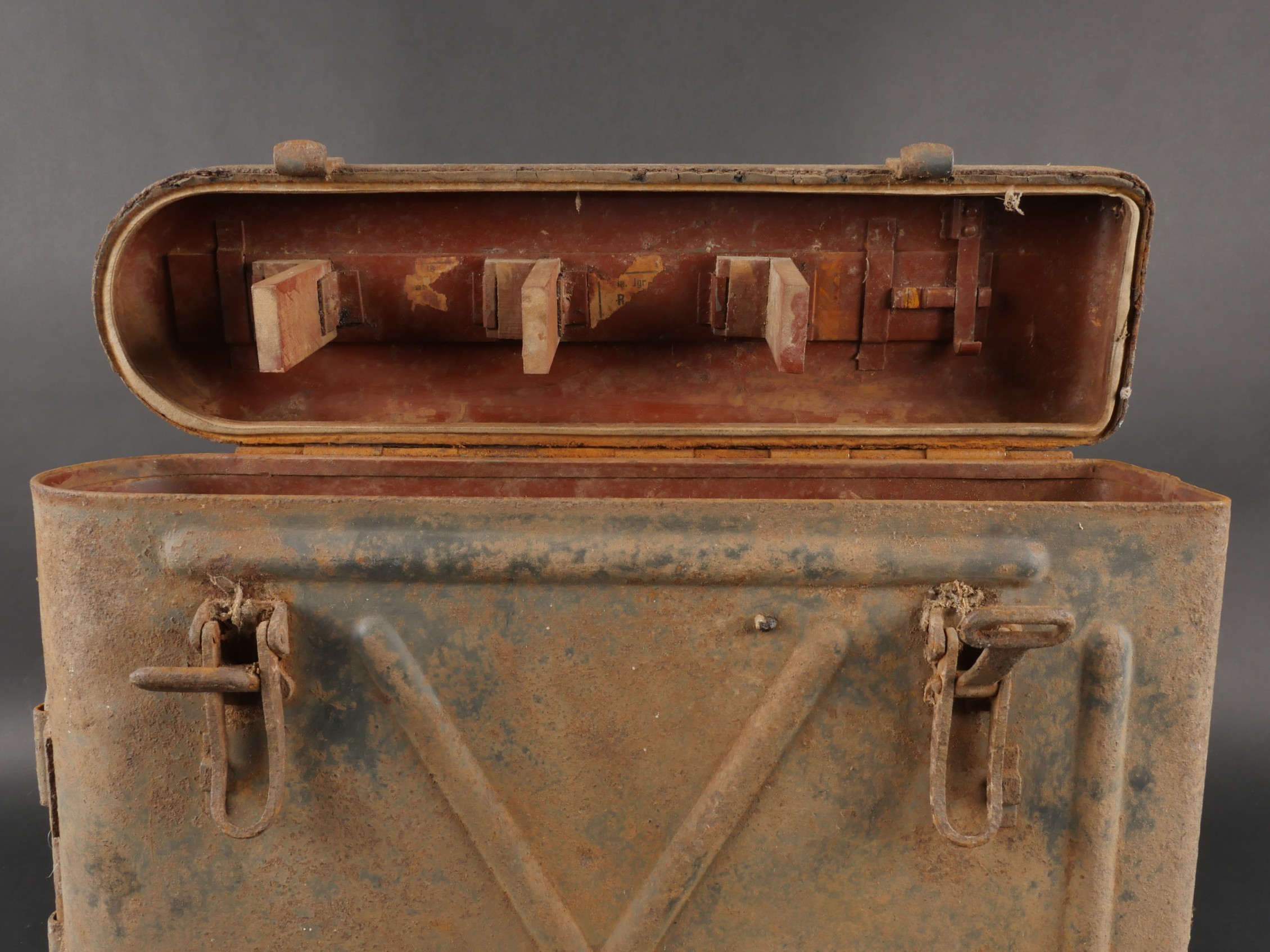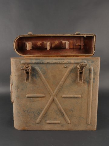 Détails de la vente >Caisse allemande pour munitions I.G.18 Pzb44. Caisse avec sa poignée et ses compartiments internes