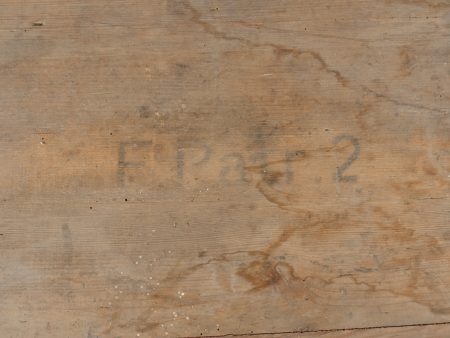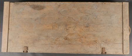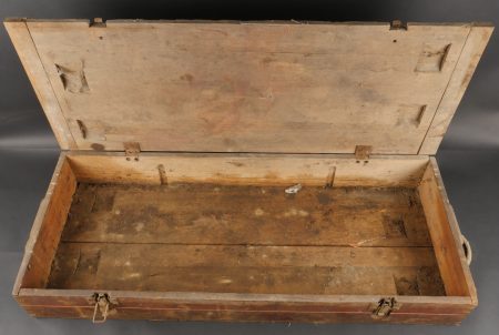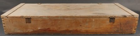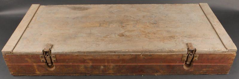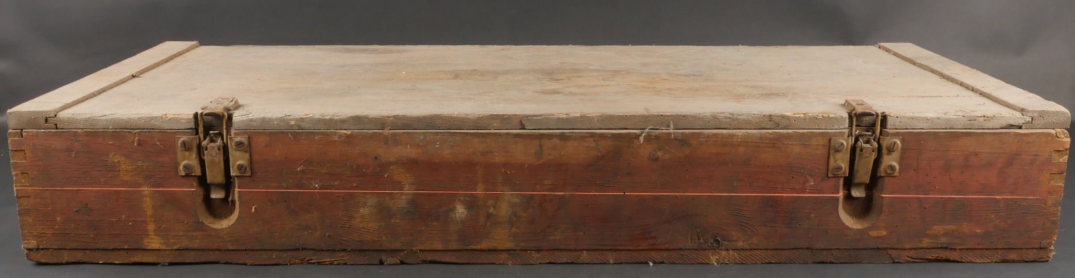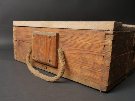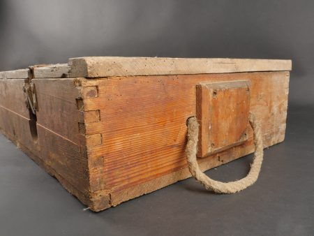 Détails de la vente >Caisse allemande pour Panzerfaust. Caisse bois marquée F.Patr.2, poignées en corde présentes, quelques fentes dans le bois