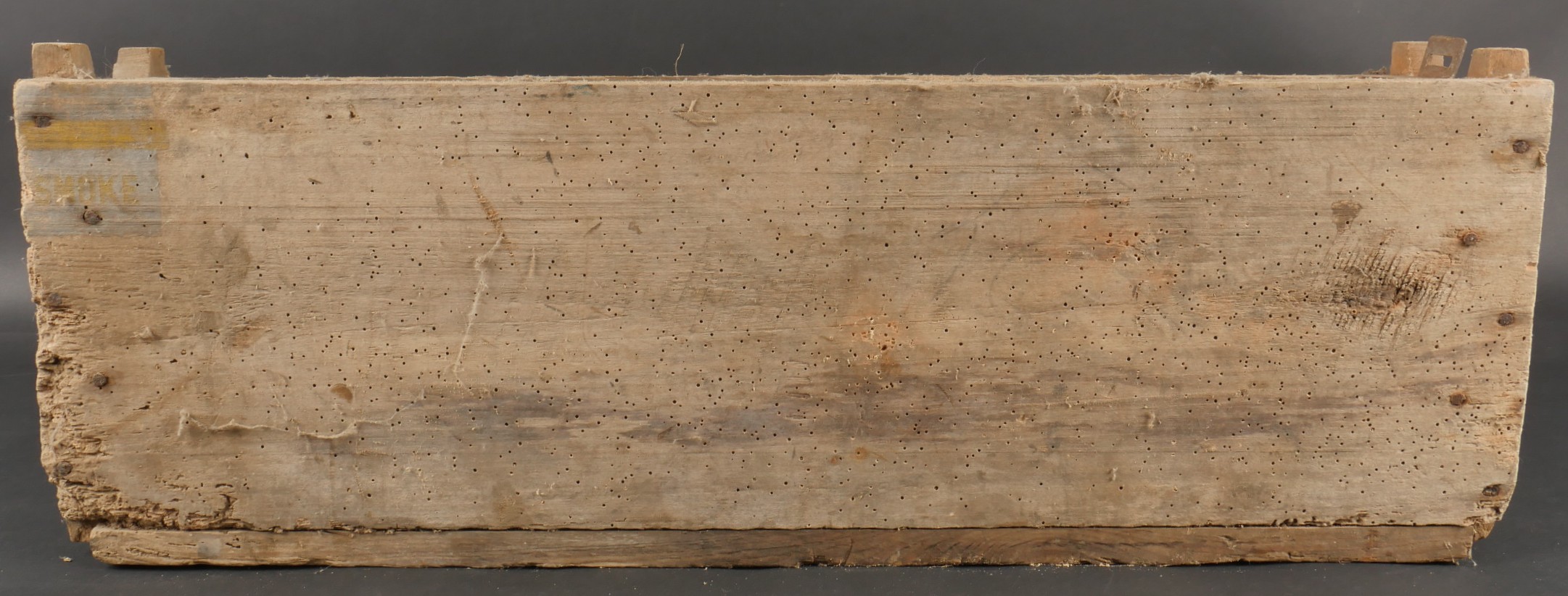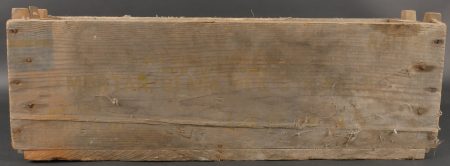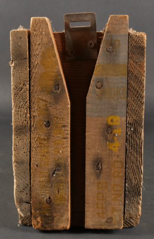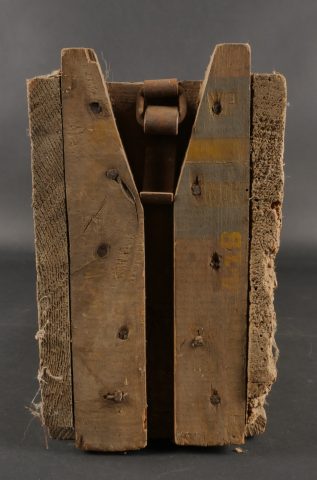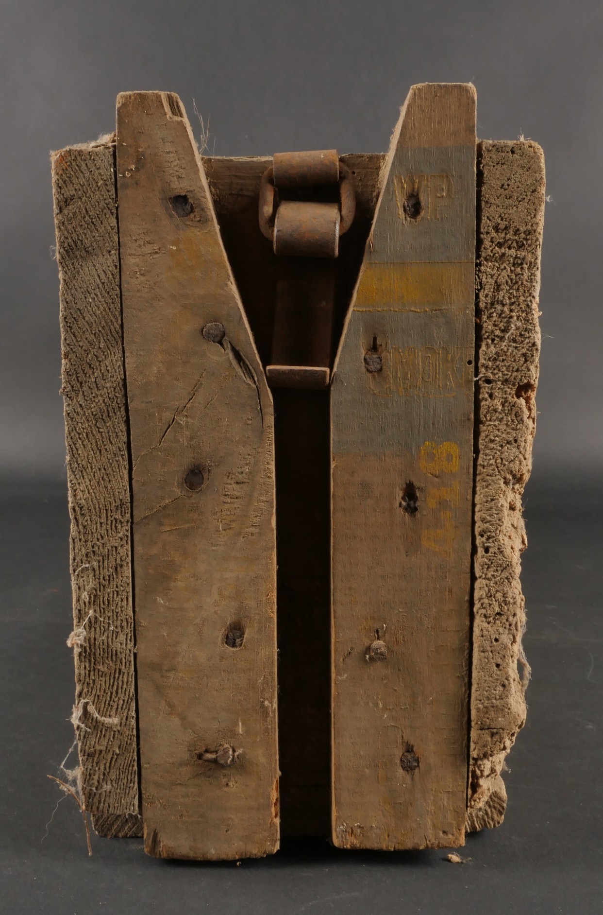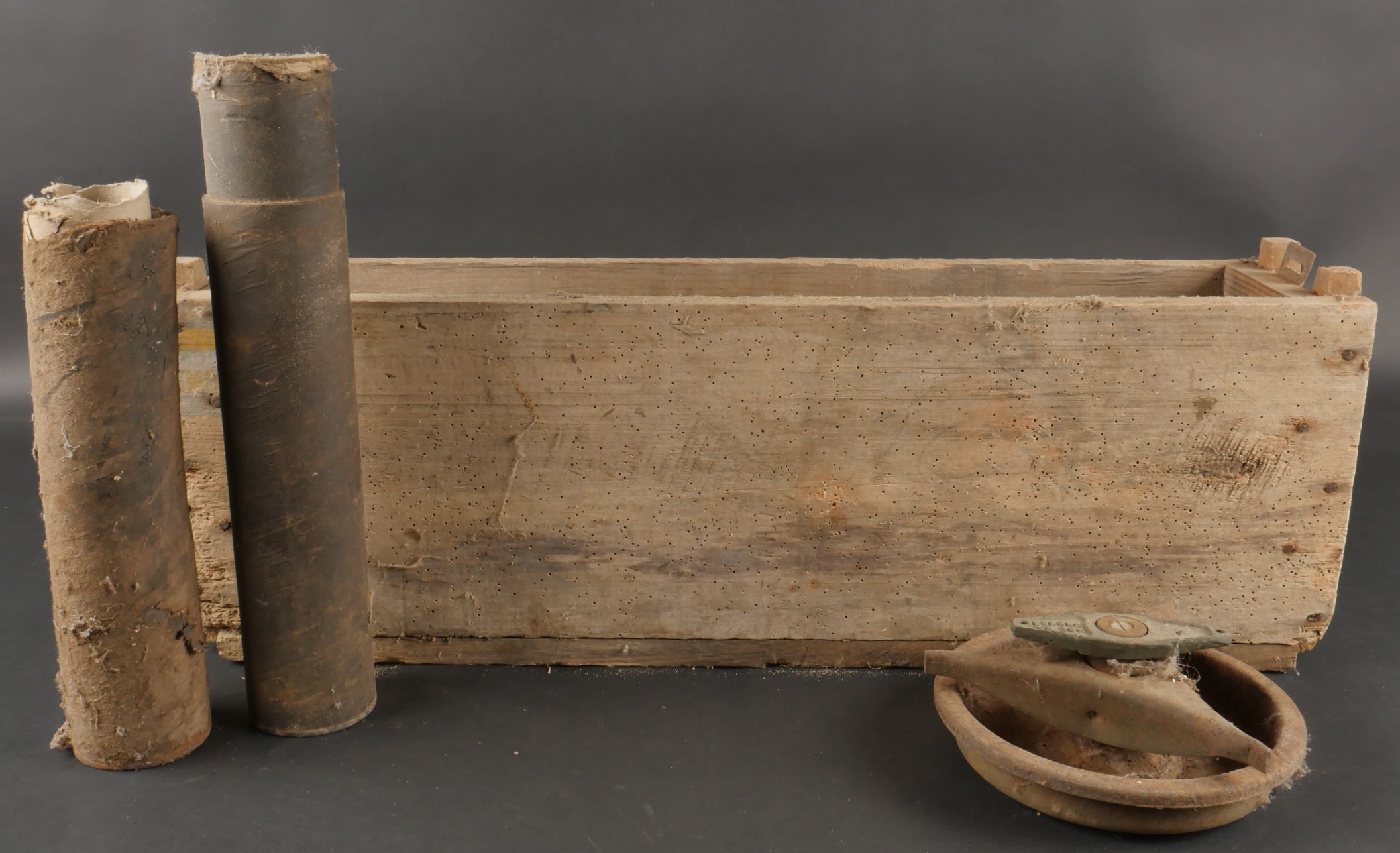 Détails de la vente >Caisse et containers US. Caisse pour 2 douilles de 75 ou 105 mm à déterminer, sans couvercle, 2 parties de container pour mortier de 60 mm, un couvercle de container métallique pour 105 mm