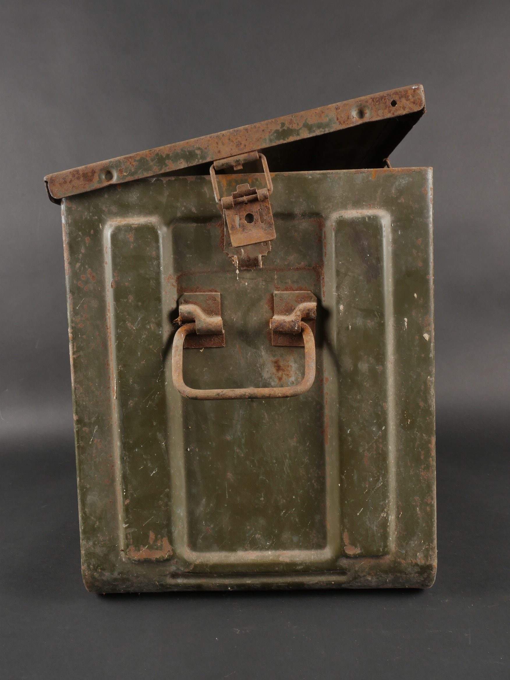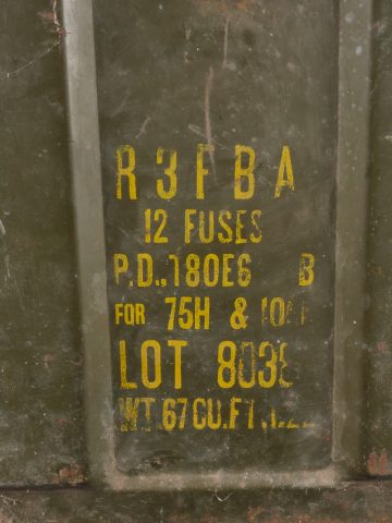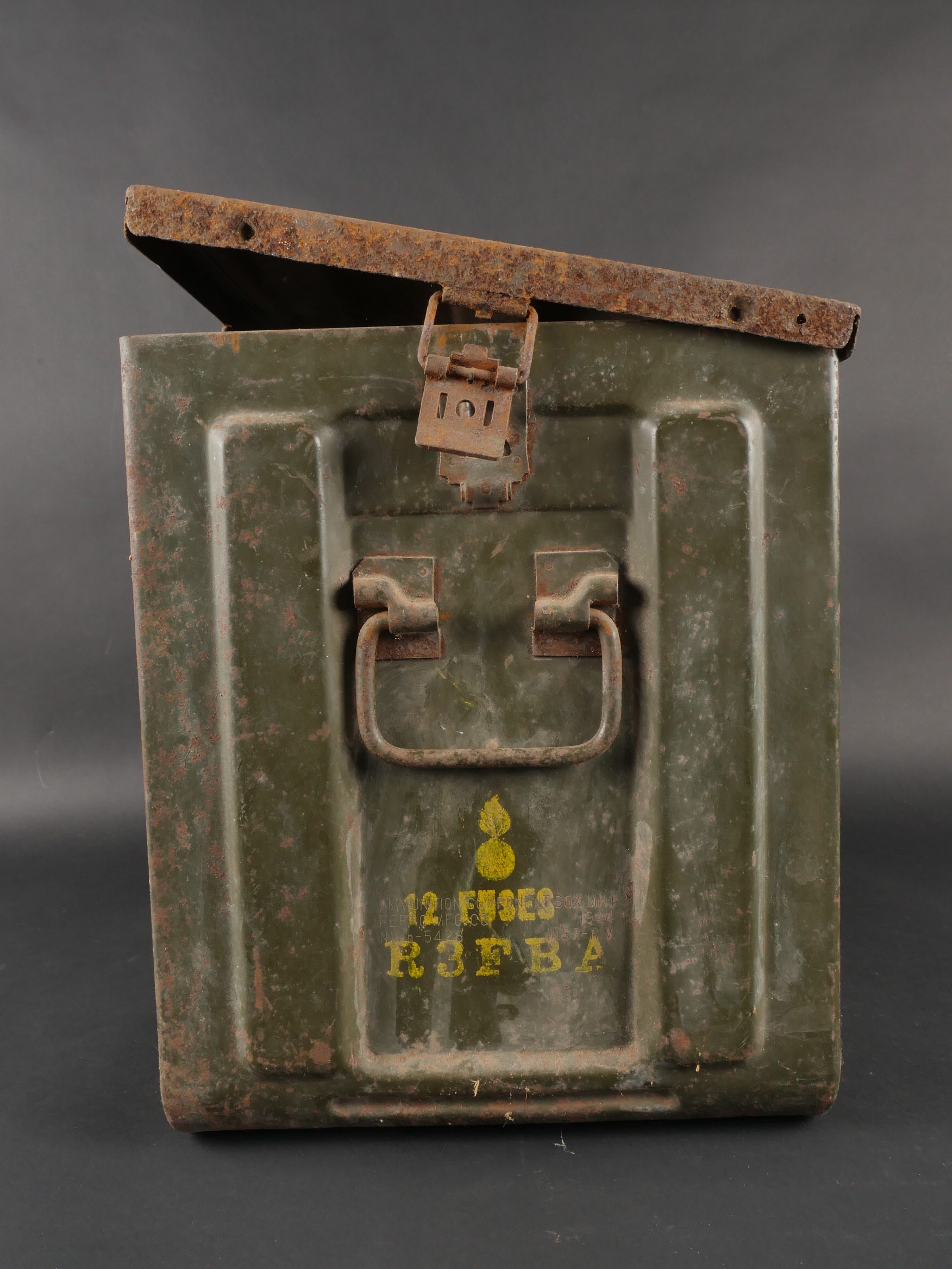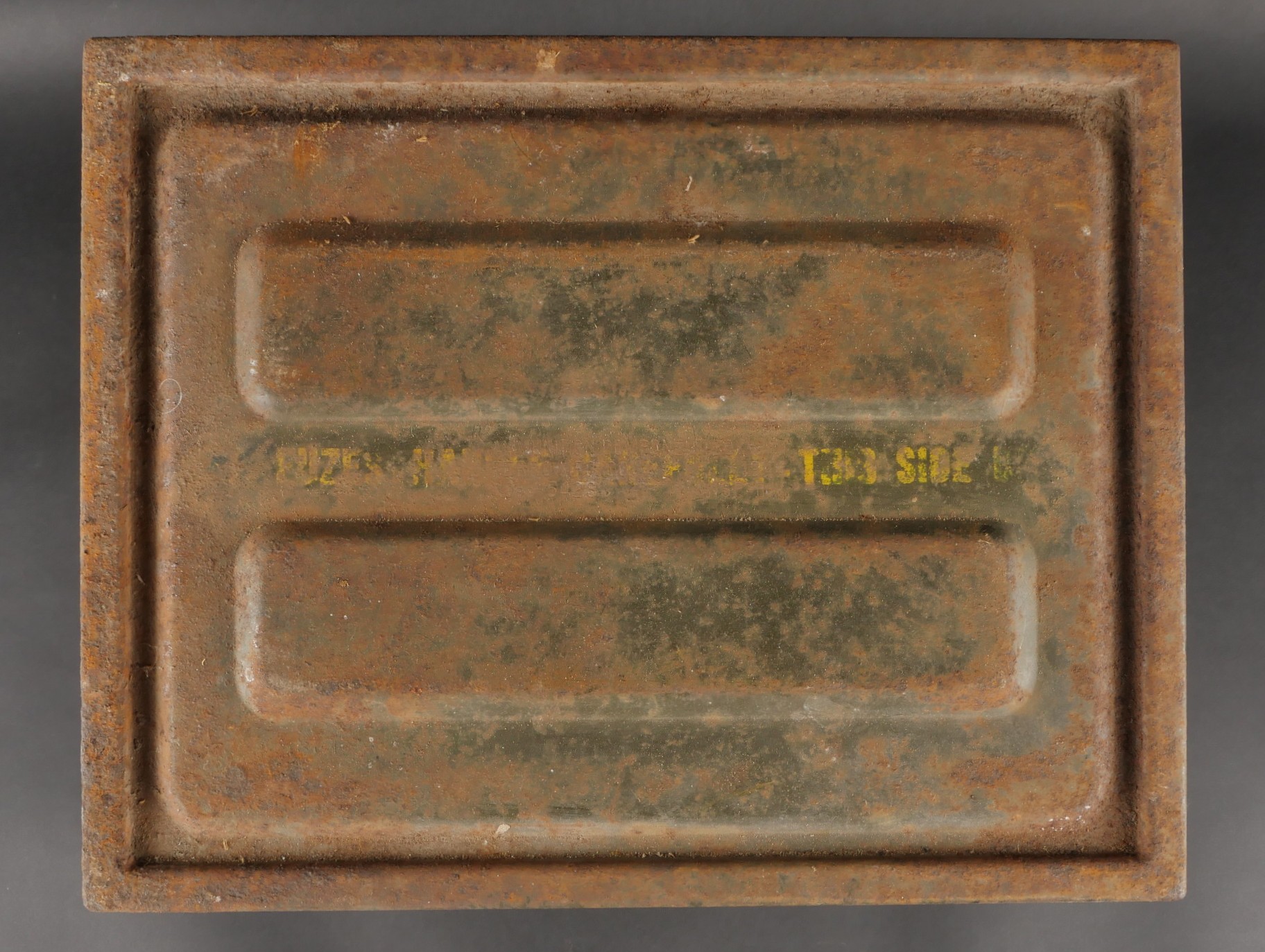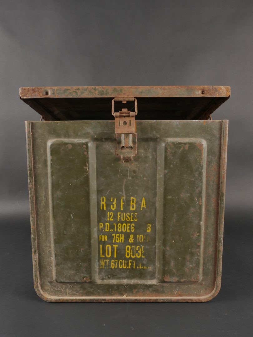 Détails de la vente >Caisse US pour 12 fusées d’obus. Caisse en métal pour fusées d’obus de 75 ou 100 mm, beaux marquages