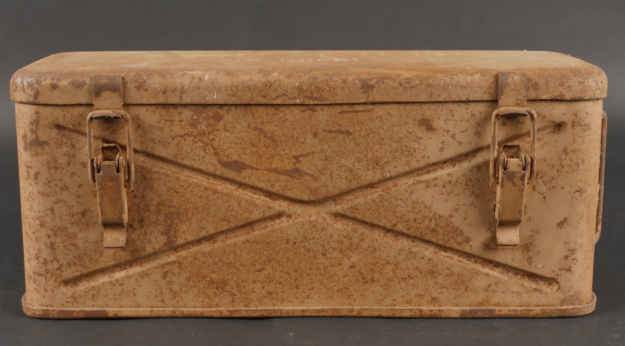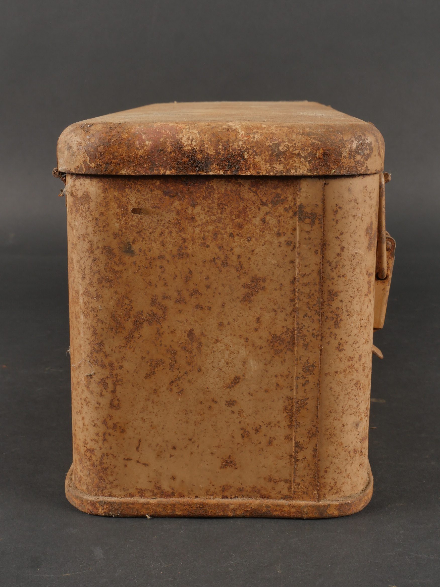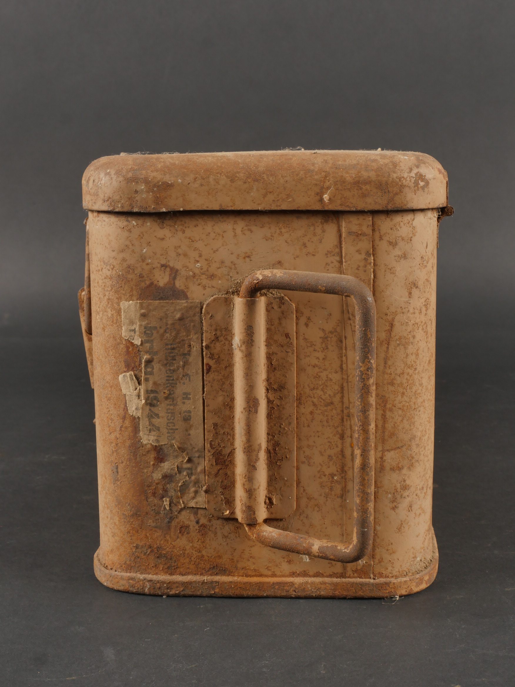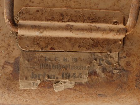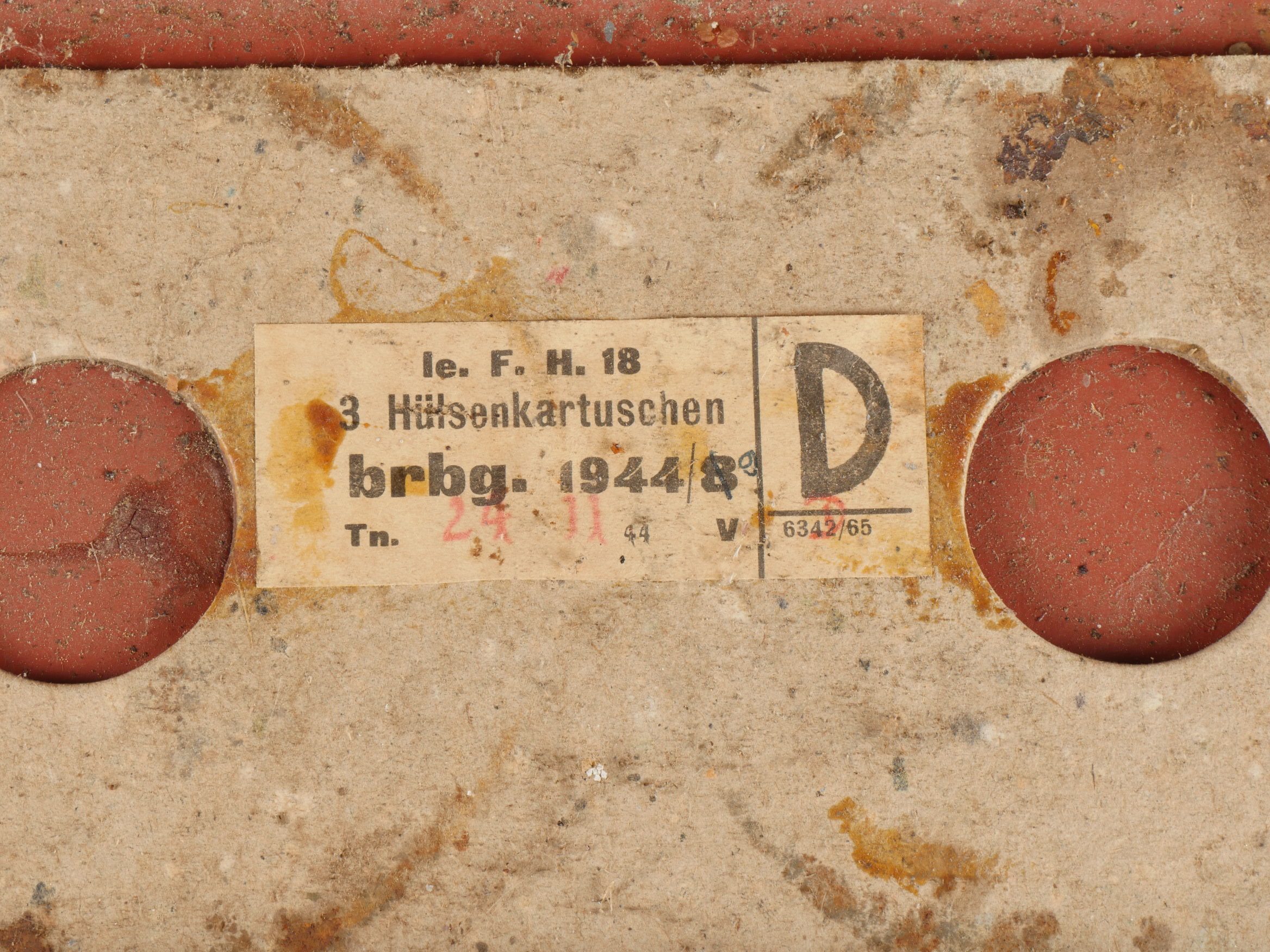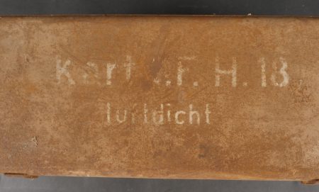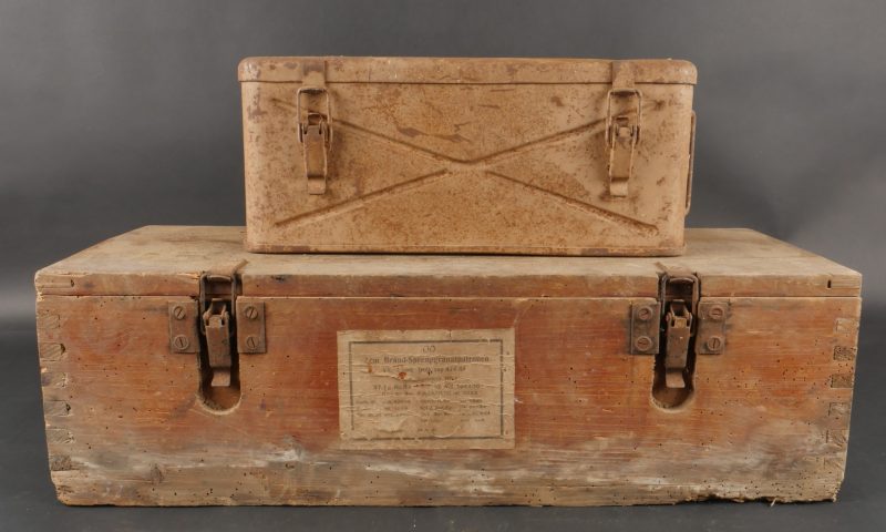 Caisses allemandes pour 2cm incendiaires et Kart LeFH18. Caisse pour 2cm incendiaire de 1944 avec une belle étiquette à l’intérieur. Une caisse pour douilles de Le.F.H.18 en tôle peinte sable avec marquage, étiquette intérieure et compartiments