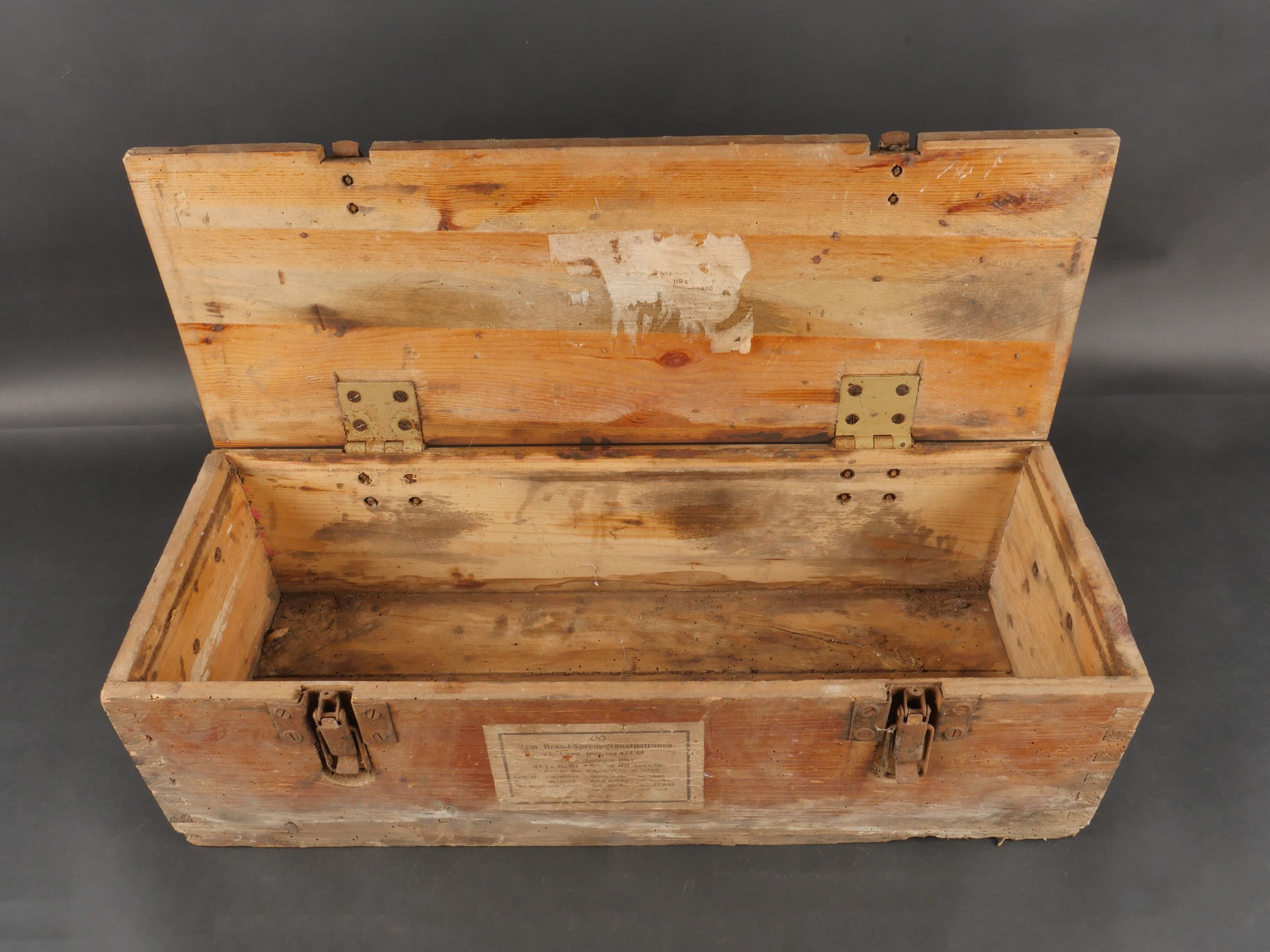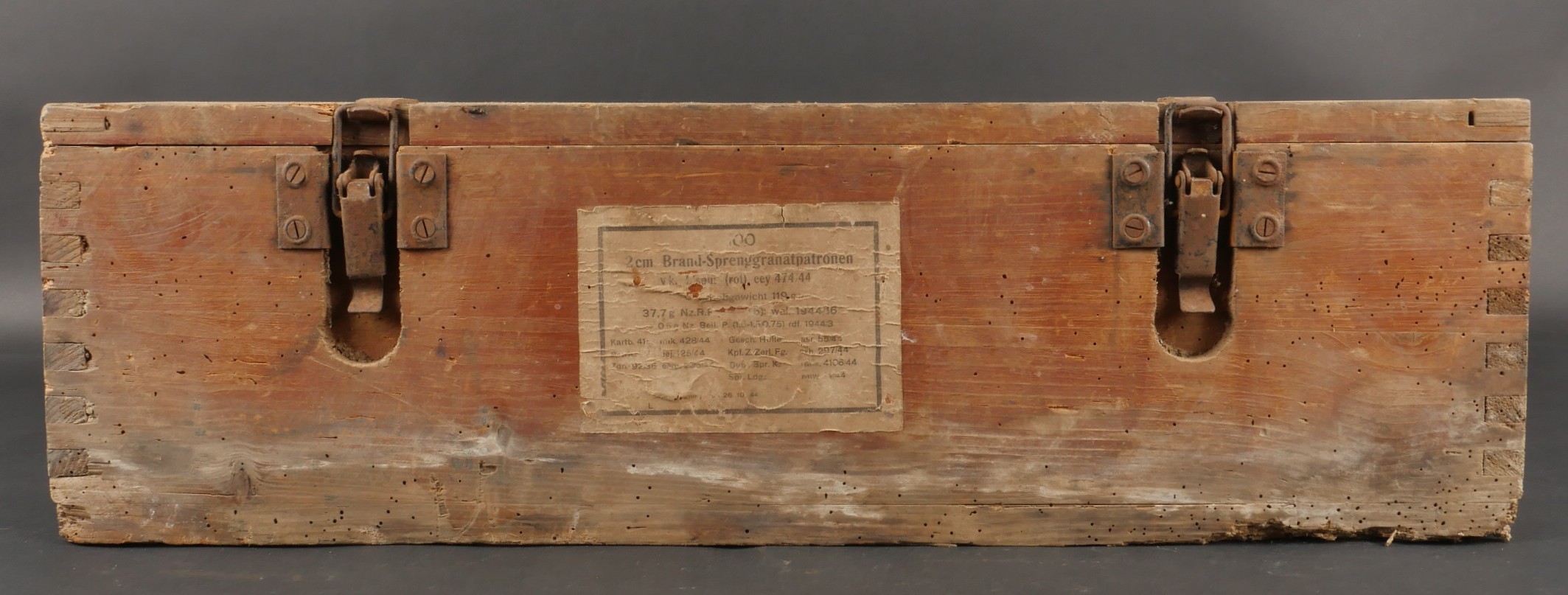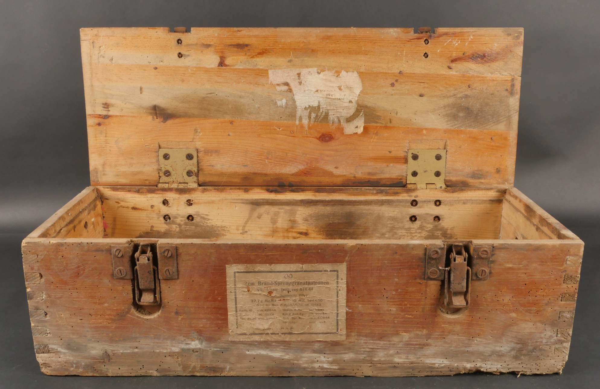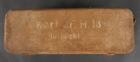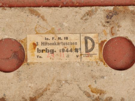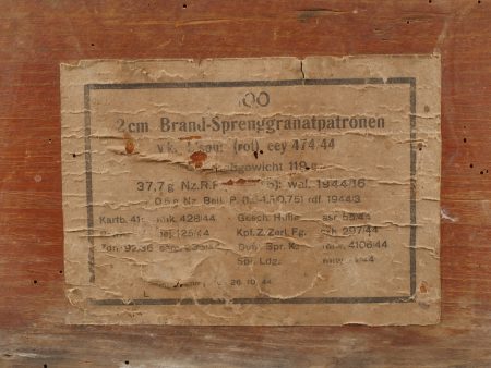 Détails de la vente >Caisses allemandes pour 2cm incendiaires et Kart LeFH18. Caisse pour 2cm incendiaire de 1944 avec une belle étiquette à l’intérieur. Une caisse pour douilles de Le.F.H.18 en tôle peinte... en savoir plus