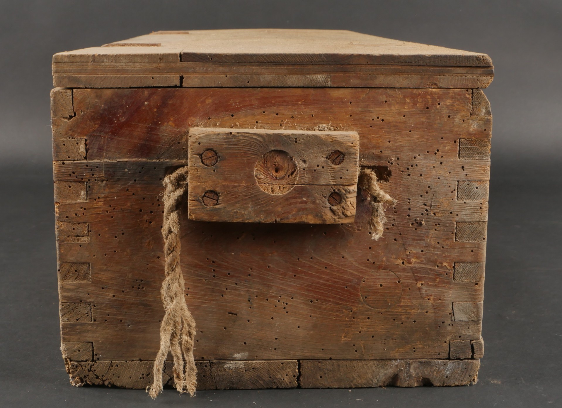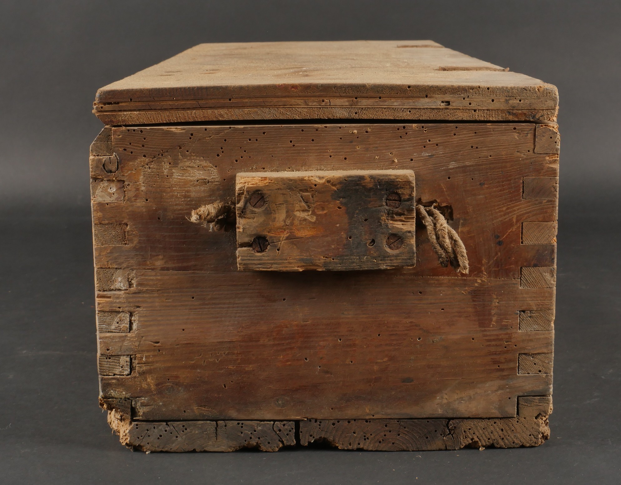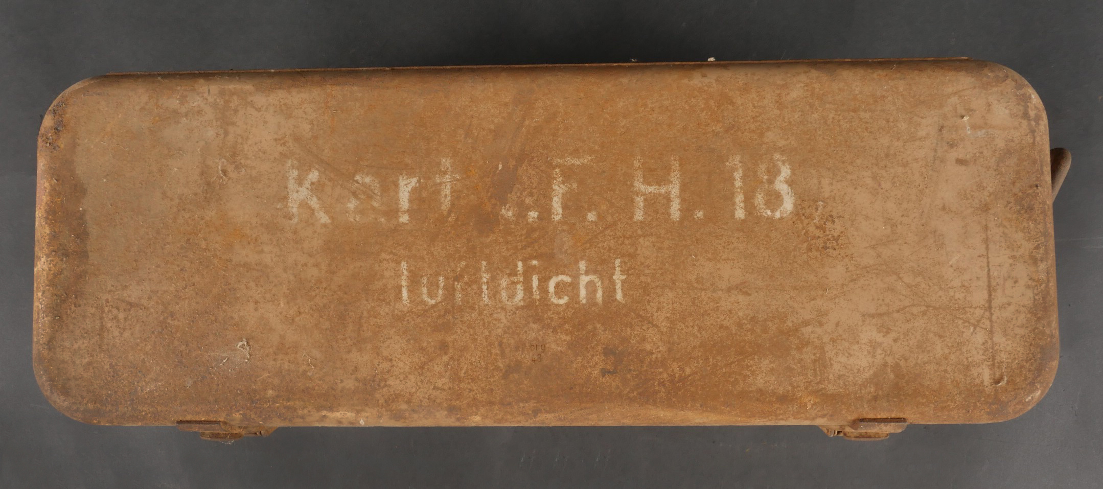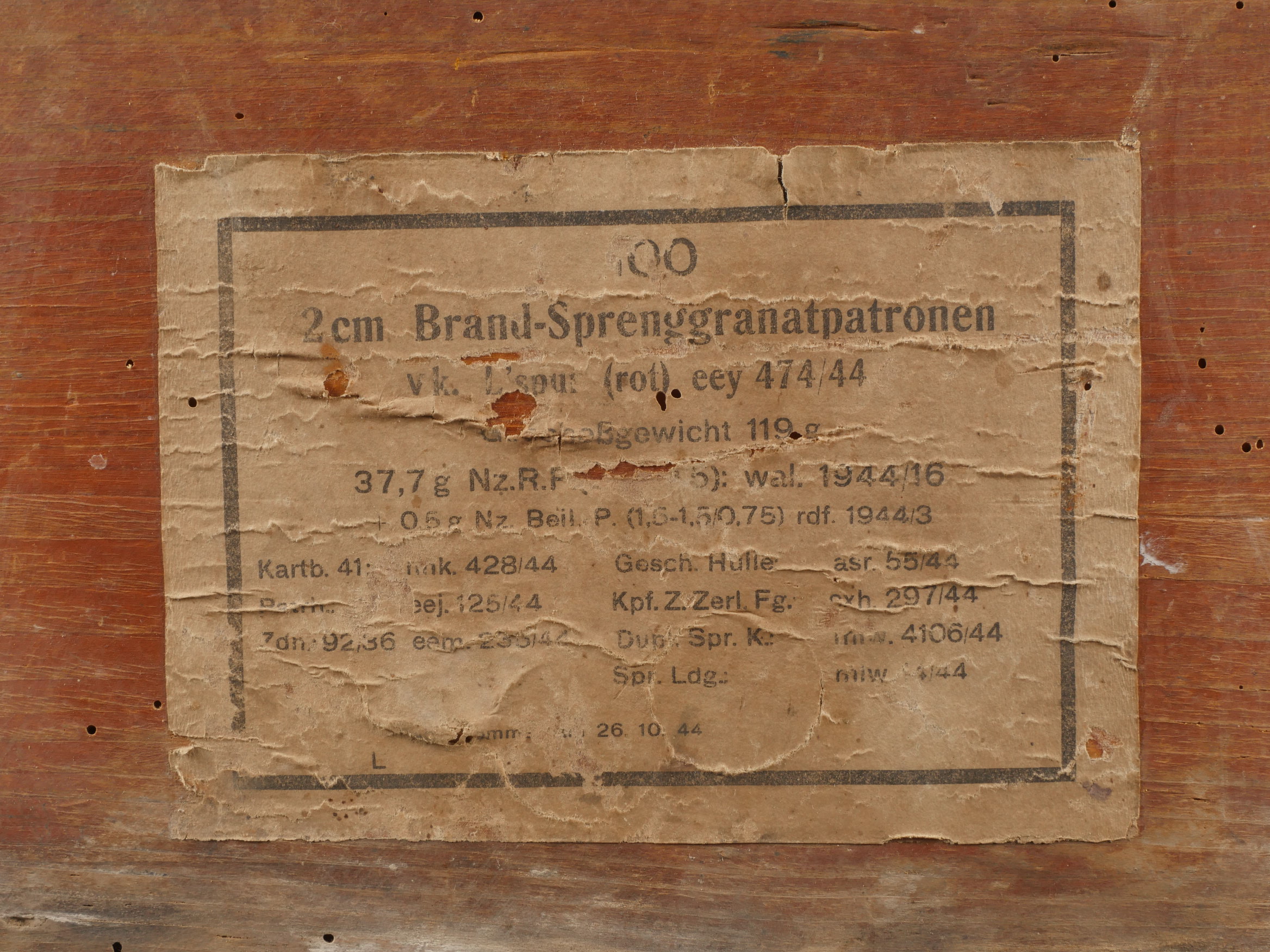 Détails de la vente >Caisses allemandes pour 2cm incendiaires et Kart LeFH18. Caisse pour 2cm incendiaire de 1944 avec une belle étiquette à l’intérieur. Une caisse pour douilles de Le.F.H.18 en tôle peinte... en savoir plus