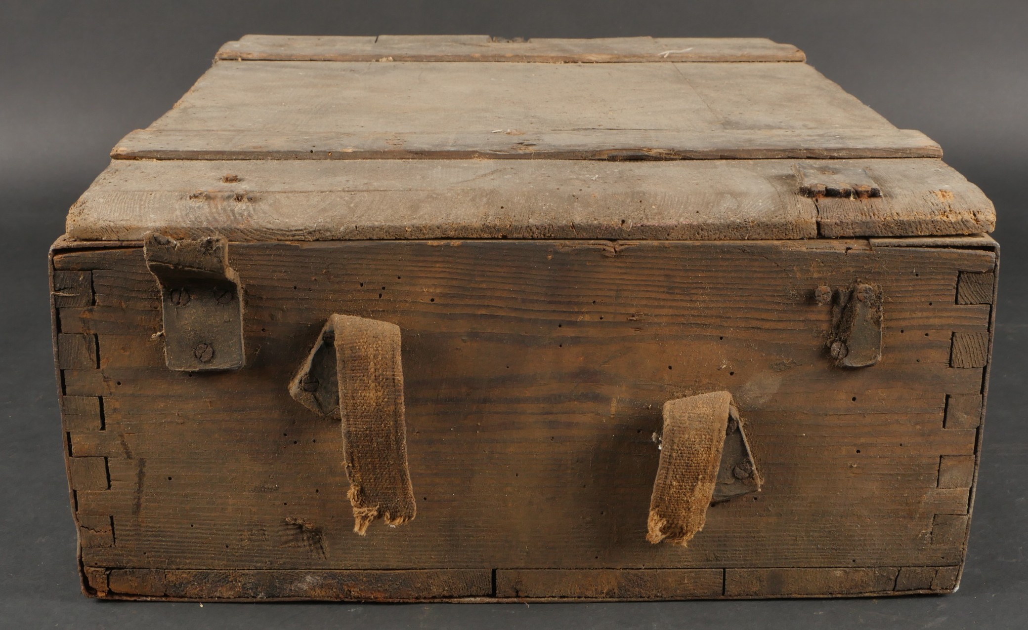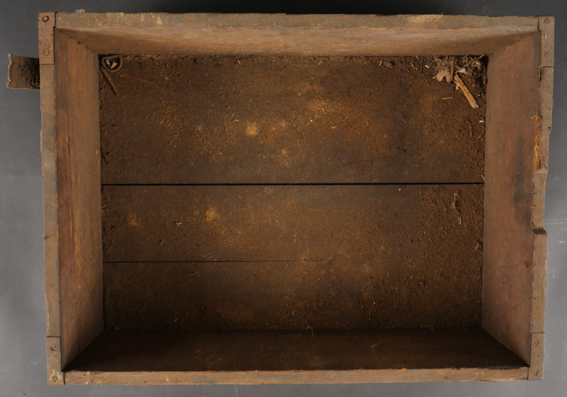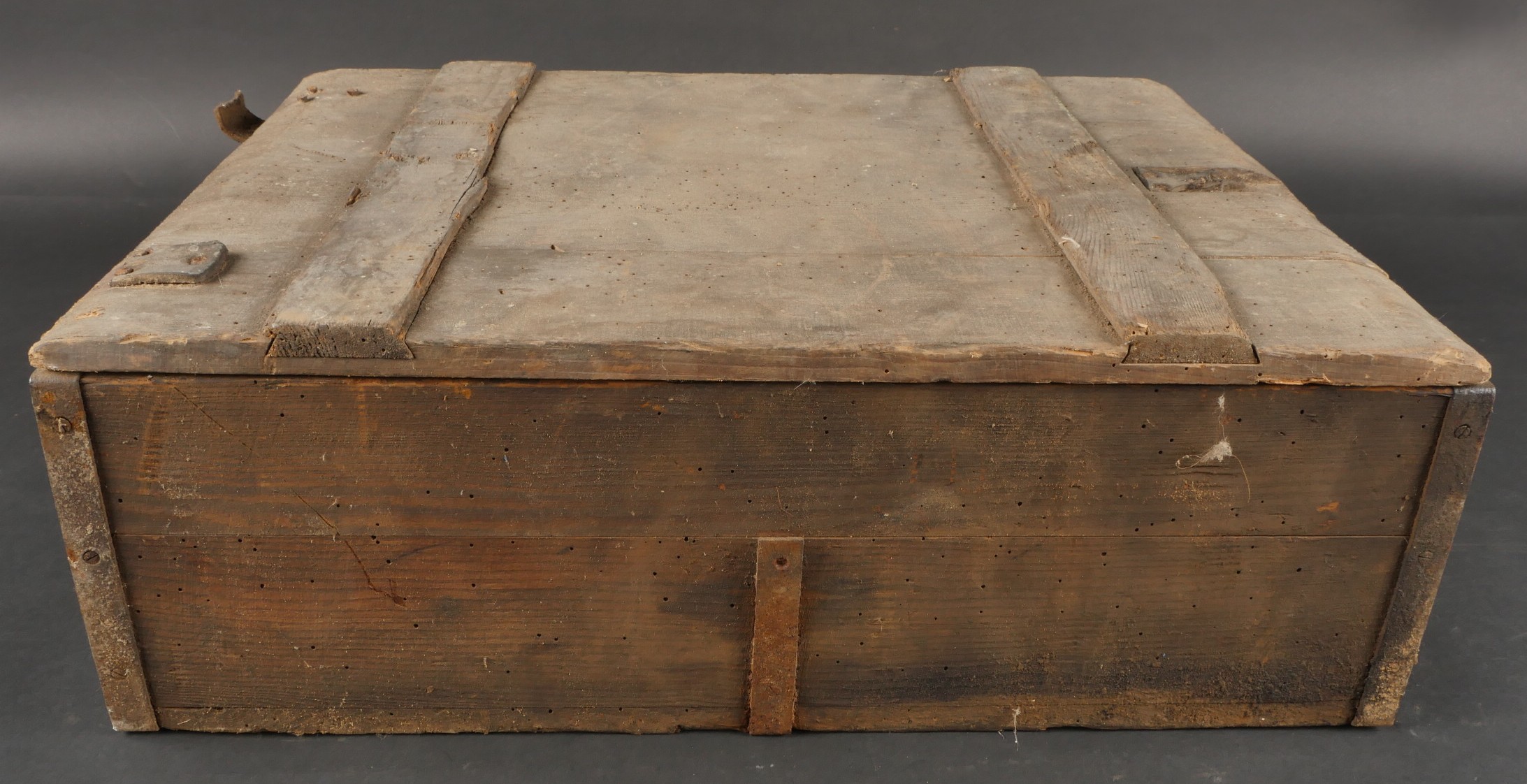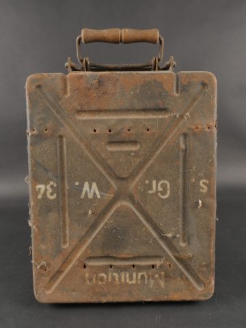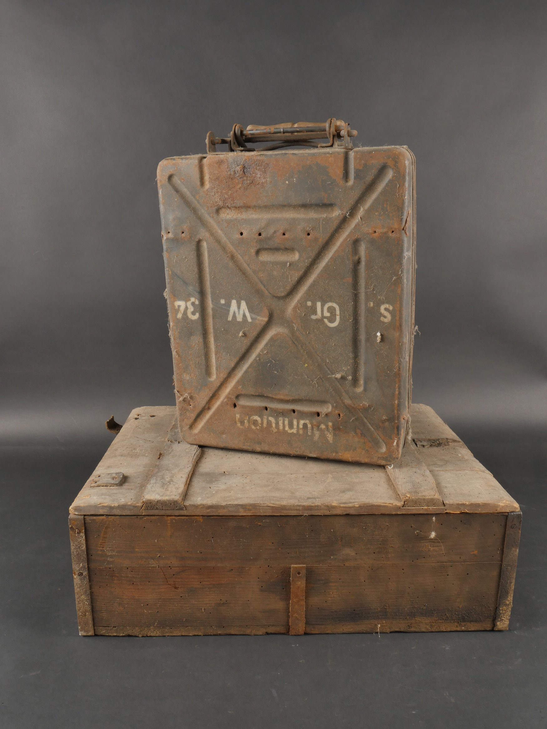 Détails de la vente >Caisses allemandes pour mortiers 8cm et munitions. Une caisse métal pour obus de 8 cm Granatwerfer sans rack, et une Patronenkasten en bois
