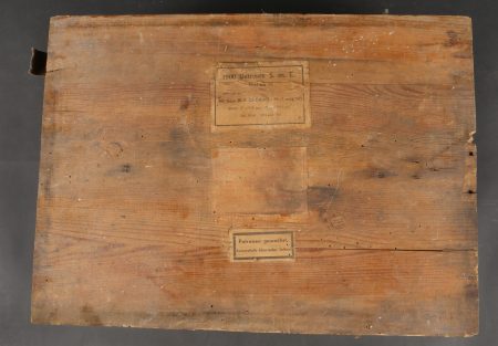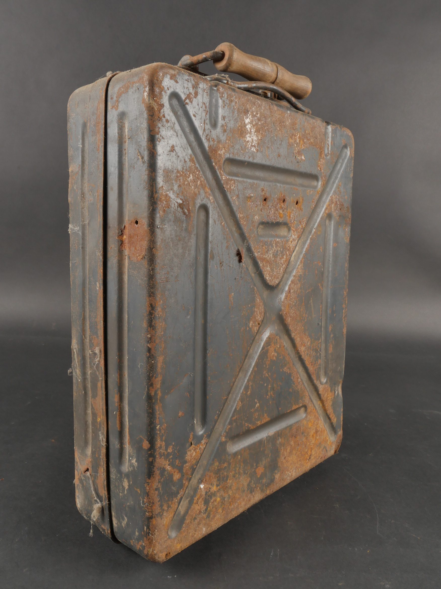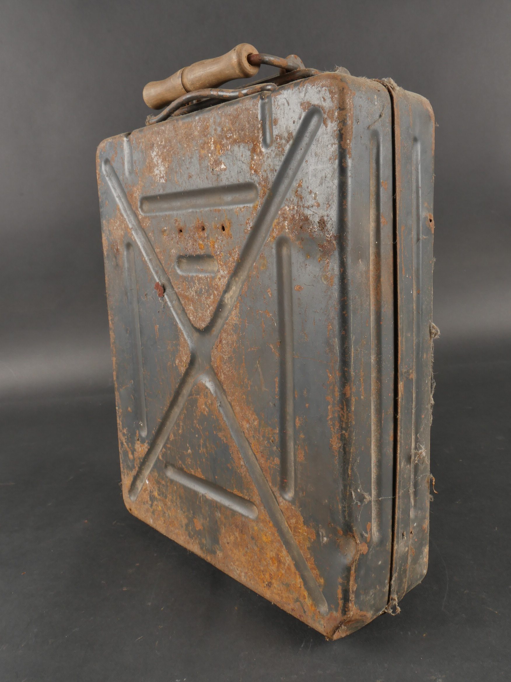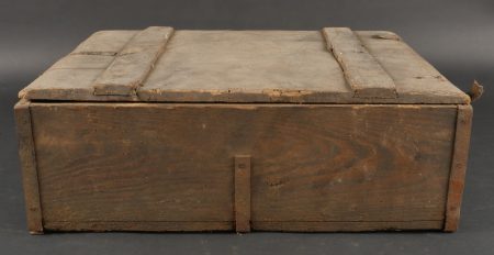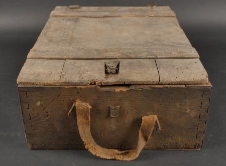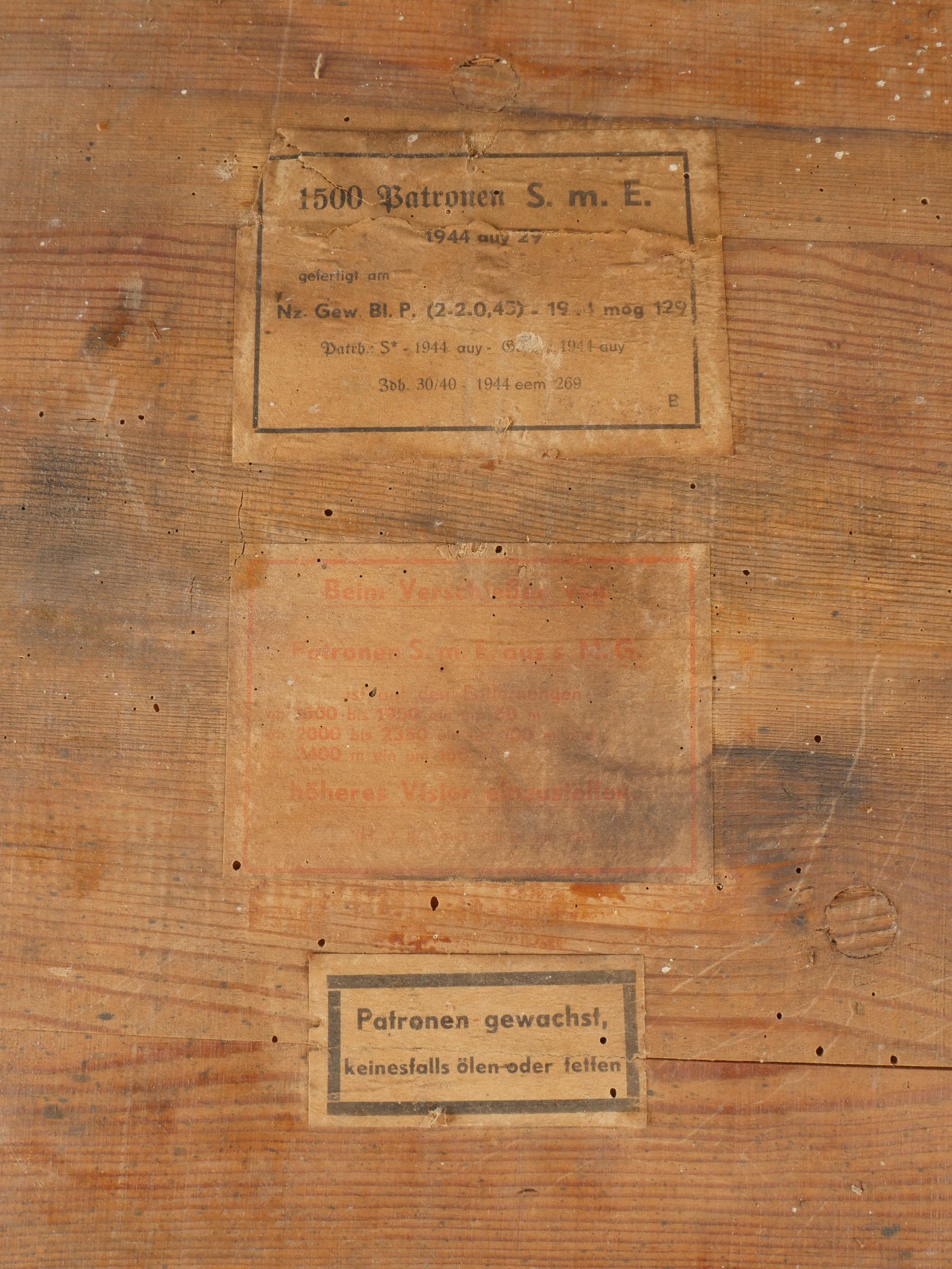 Détails de la vente >Caisses allemandes pour mortiers 8cm et munitions. Une caisse métal pour obus de 8 cm Granatwerfer sans rack, et une Patronenkasten en bois