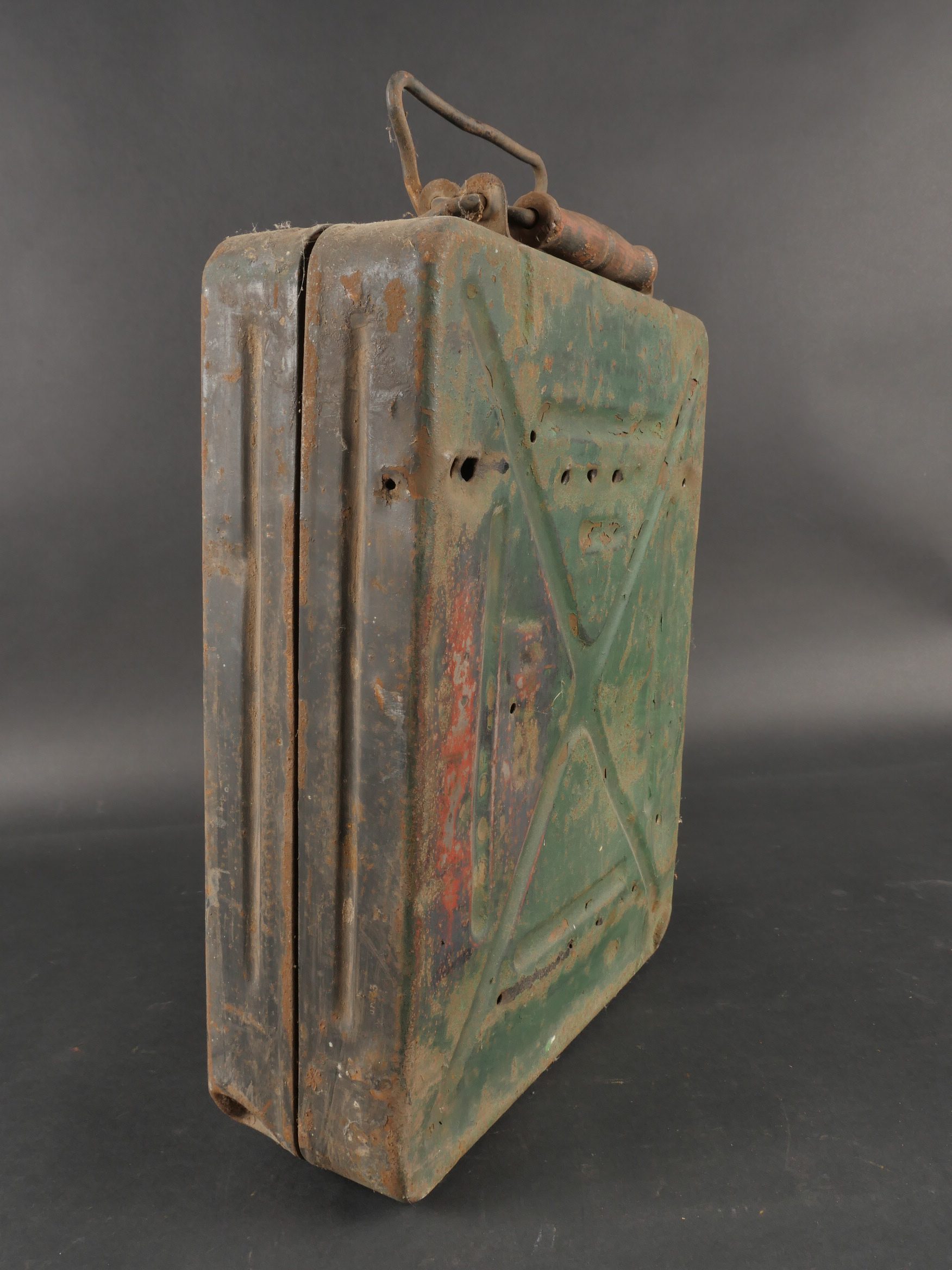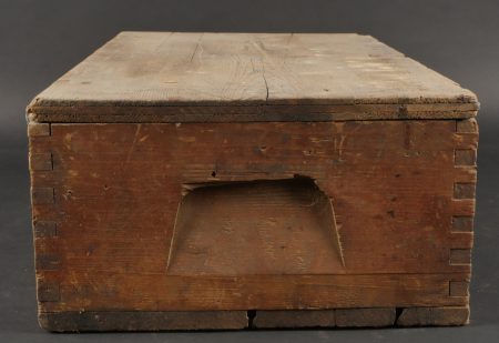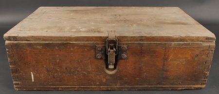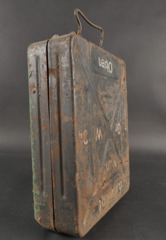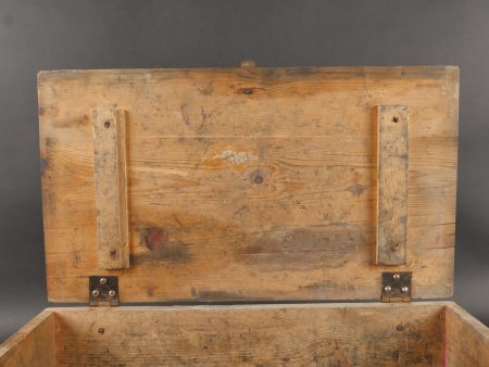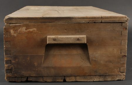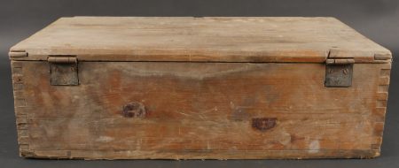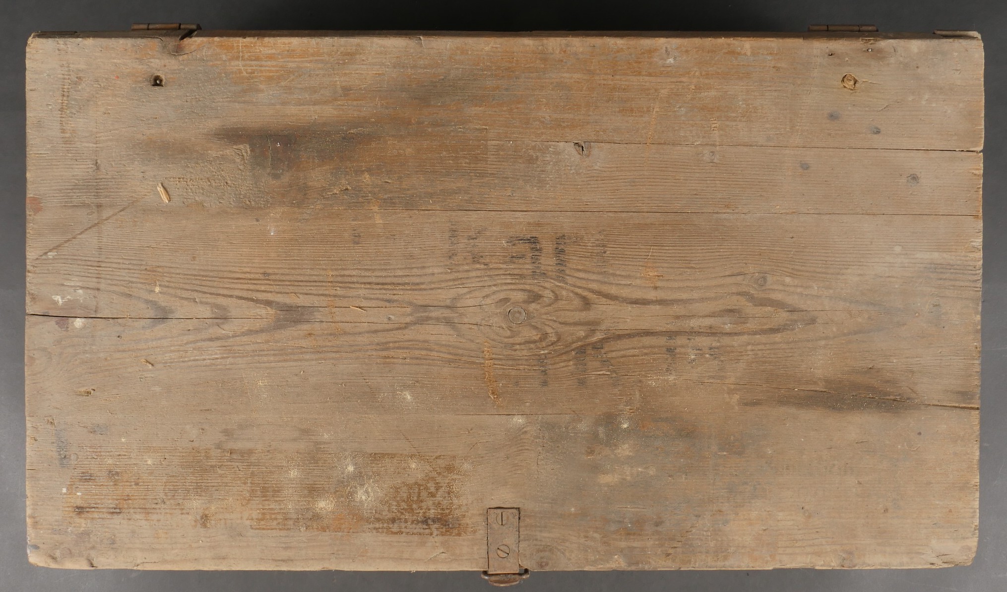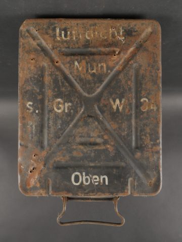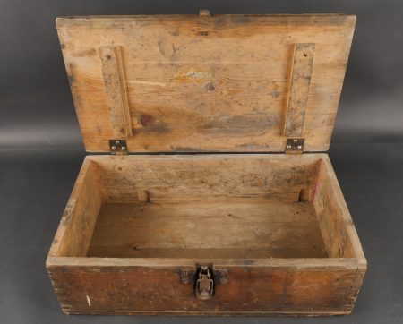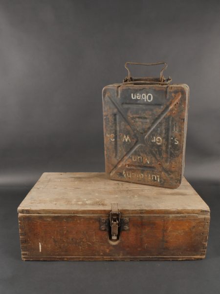 Détails de la vente >Caisses allemandes pour mortiers 8cm et munitions. Une caisse métal pour obus de 8 cm Granatwerfer, sans rack, et une caisse bois