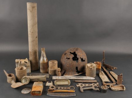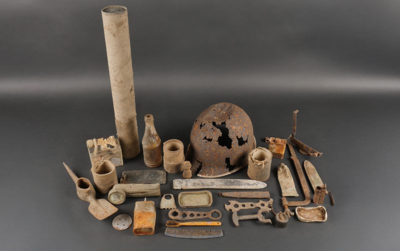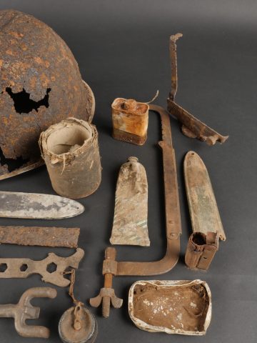 Carton de reliques US du champ de bataille. Retrouvés sur le terrain, coque de casque US M1 trouée, avec impacts. Petits objets du soldat, trousse de nettoyage d’arme, outillage, containers, pansements, etc…à découvrir