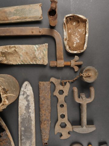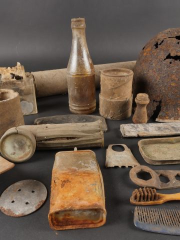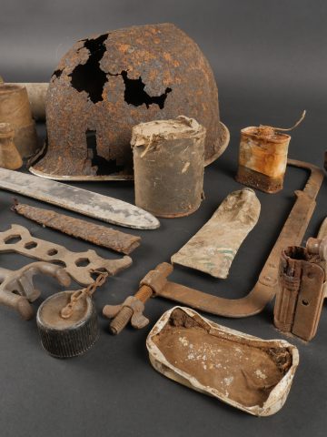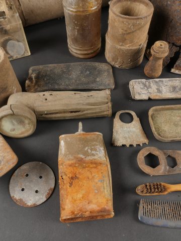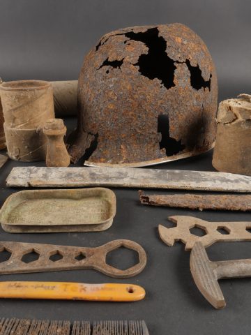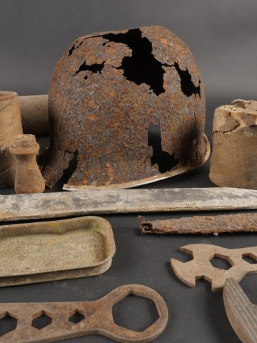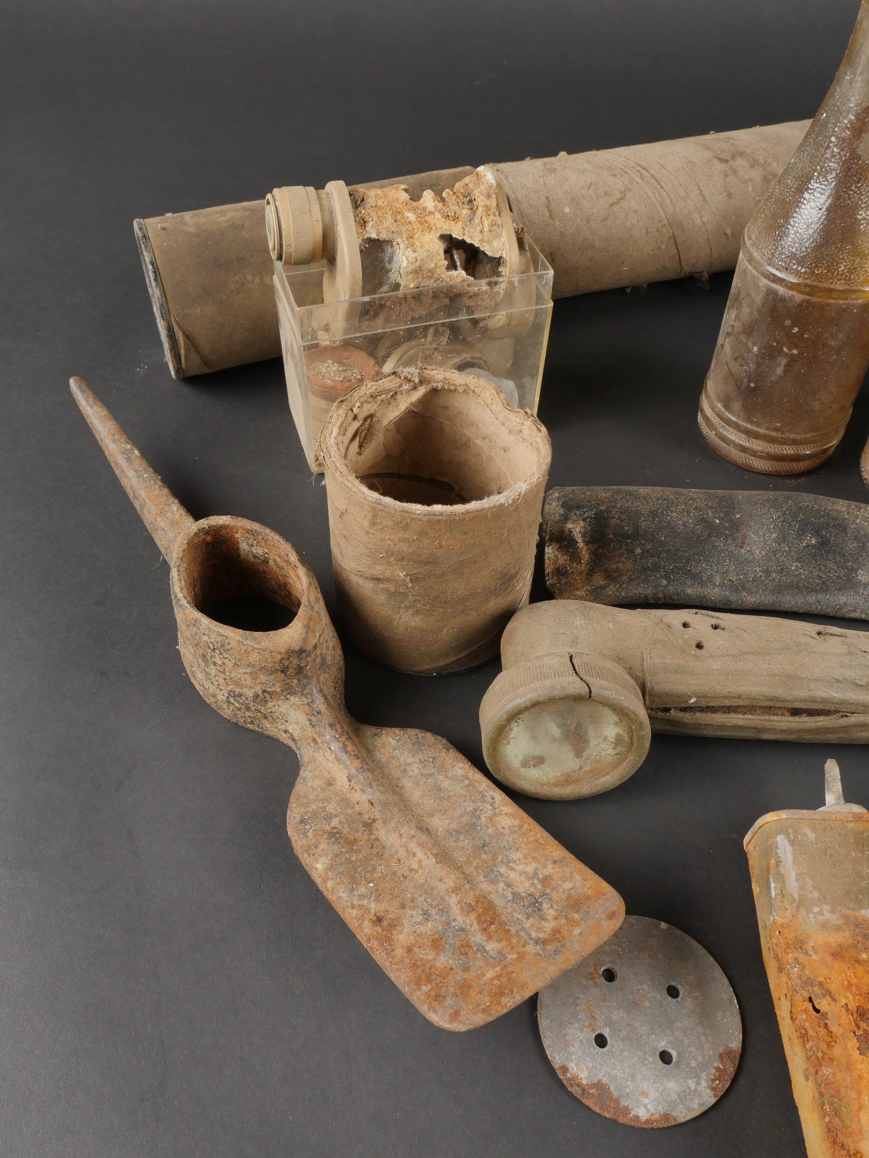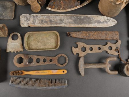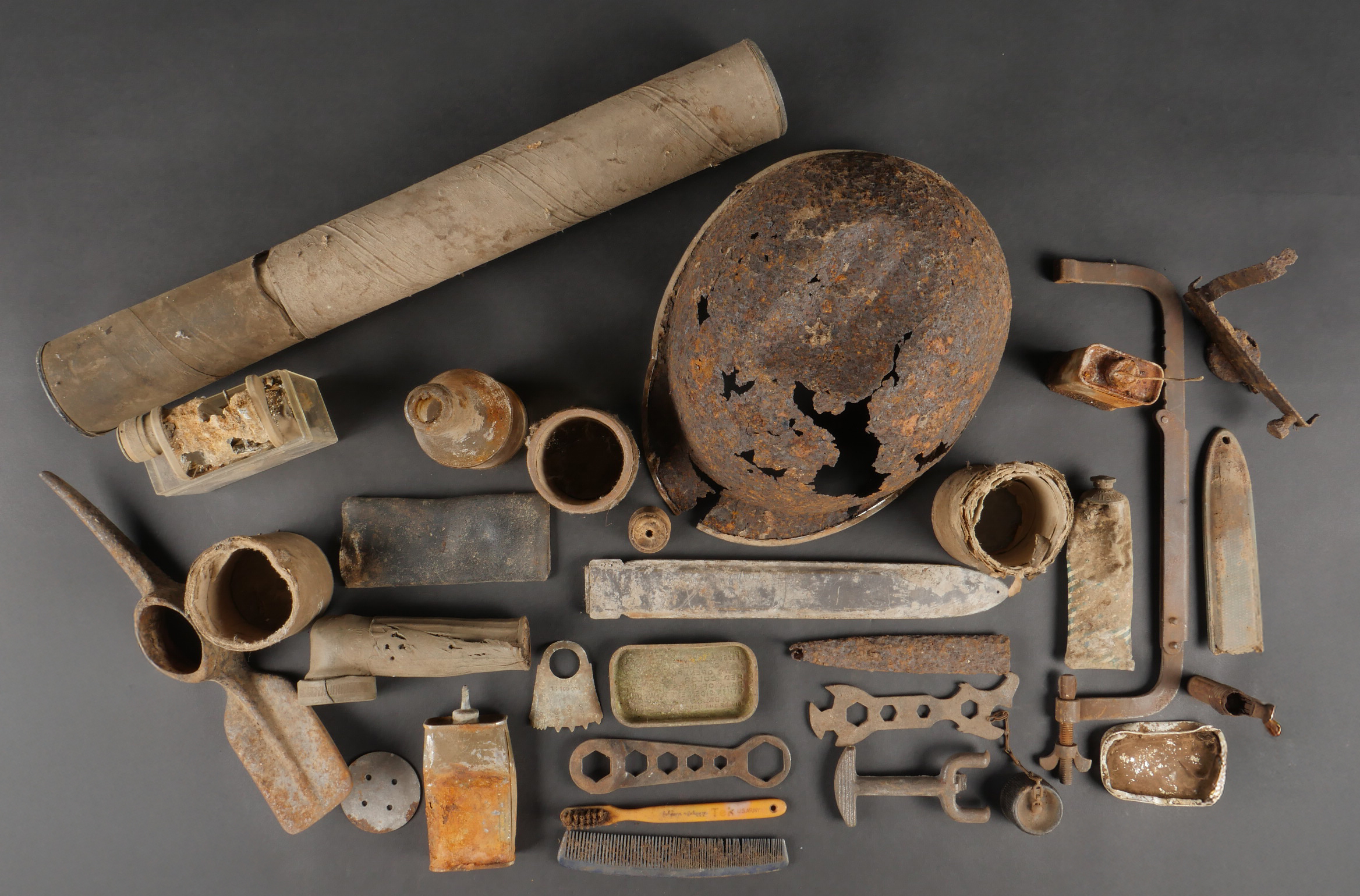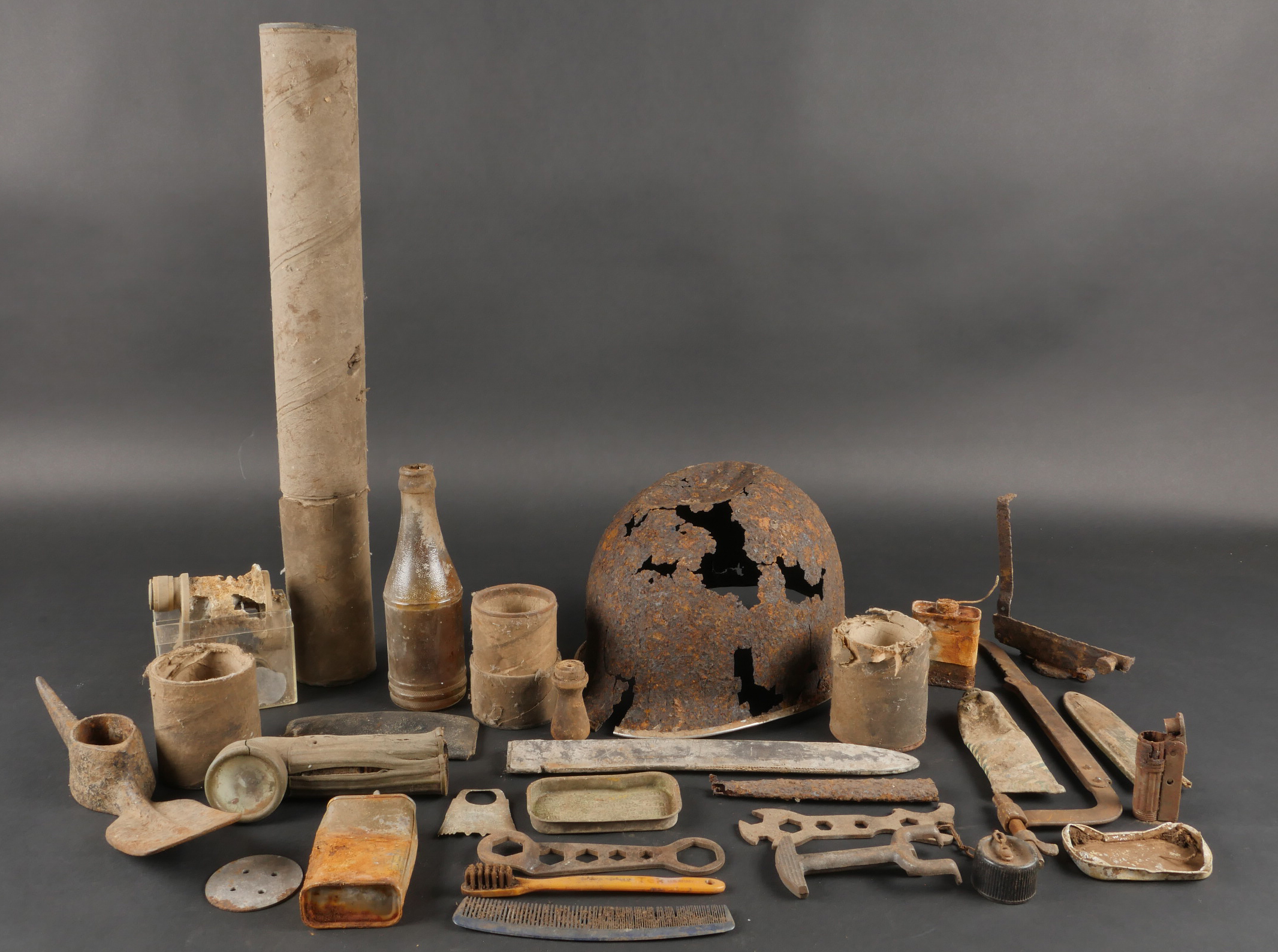 Détails de la vente >Carton de reliques US du champ de bataille. Retrouvés sur le terrain, coque de casque US M1 trouée, avec impacts. Petits objets du soldat, trousse de nettoyage d’arme, outillage,... en savoir plus