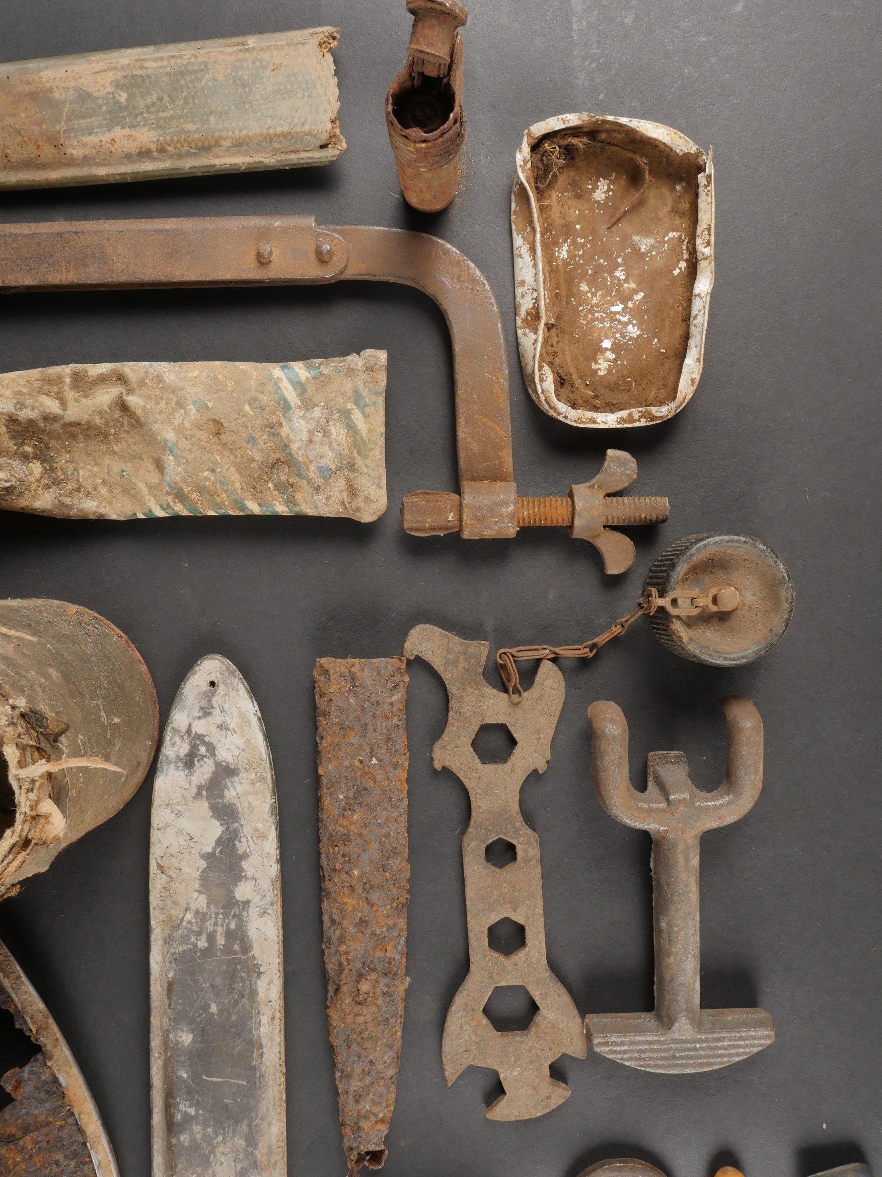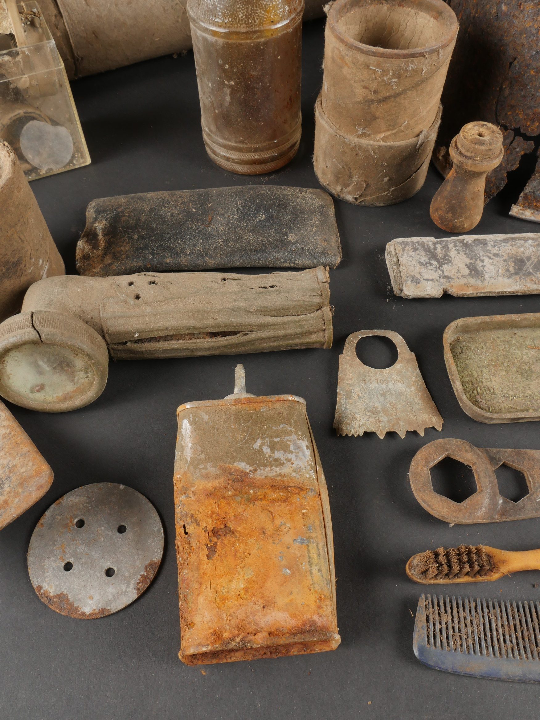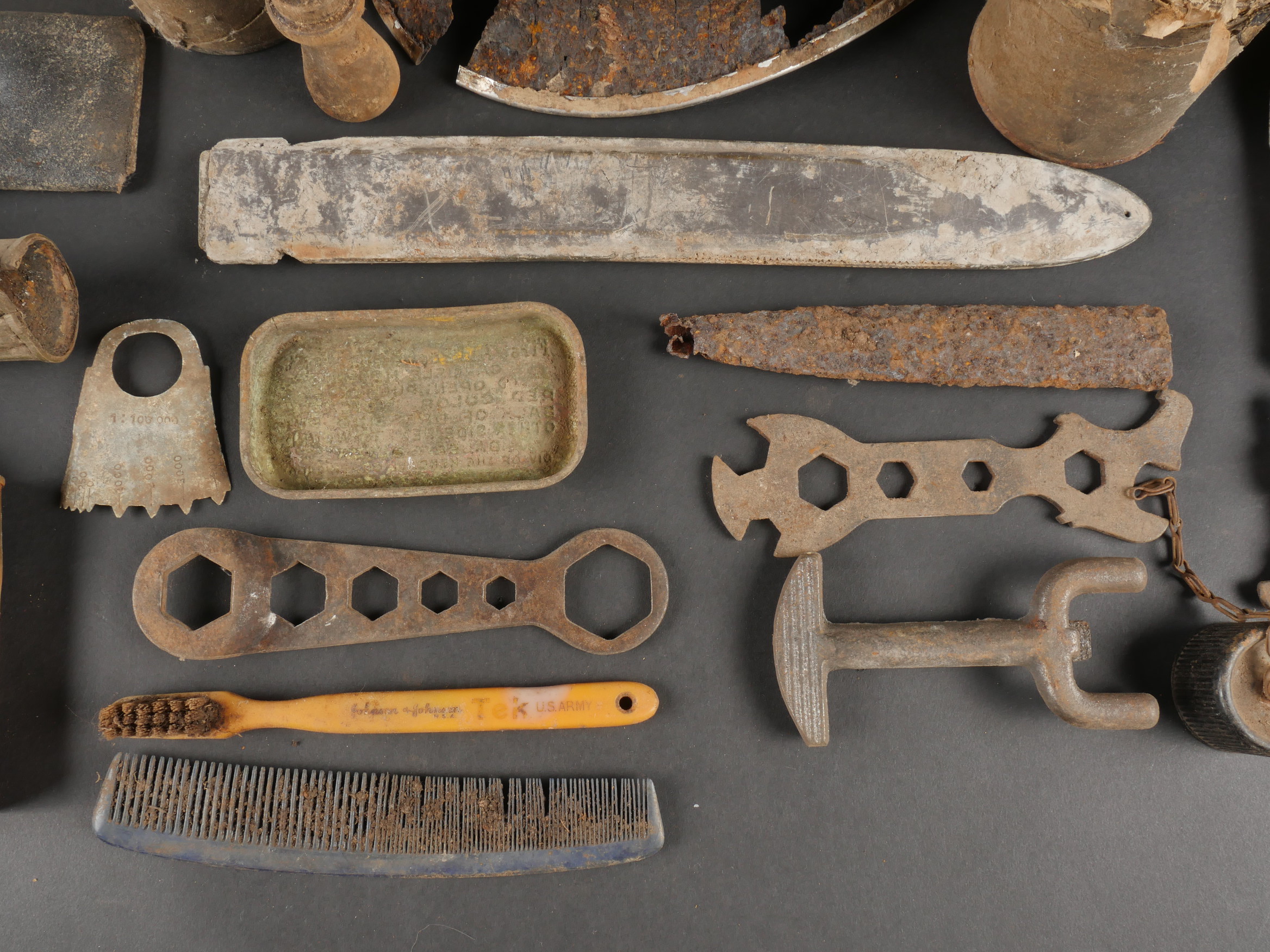 Carton de reliques US du champ de bataille. Retrouvés sur le terrain, coque de casque US M1 trouée, avec impacts. Petits objets du soldat, trousse de nettoyage d’arme, outillage,... en savoir plus