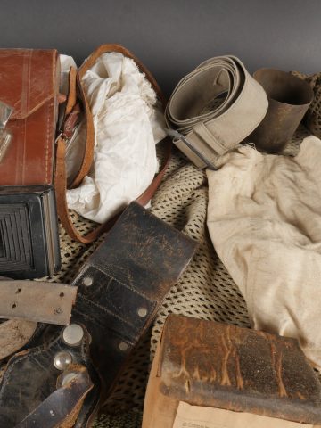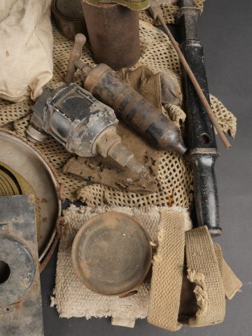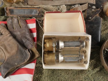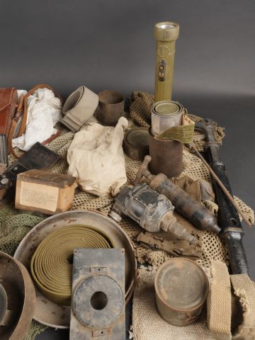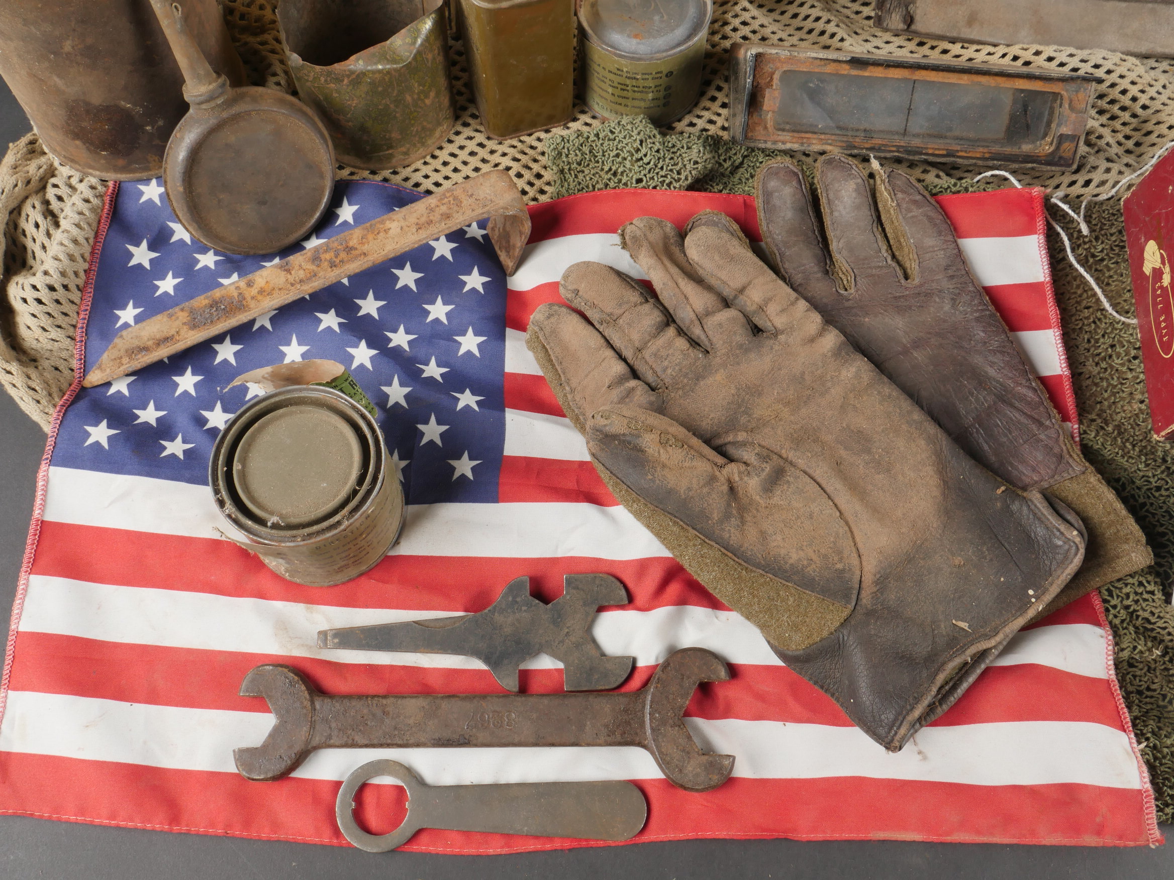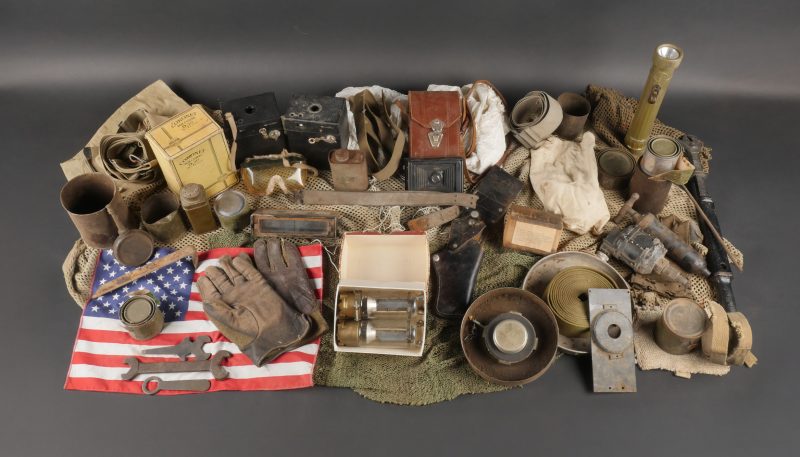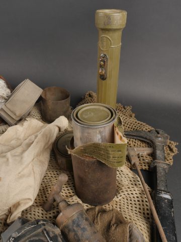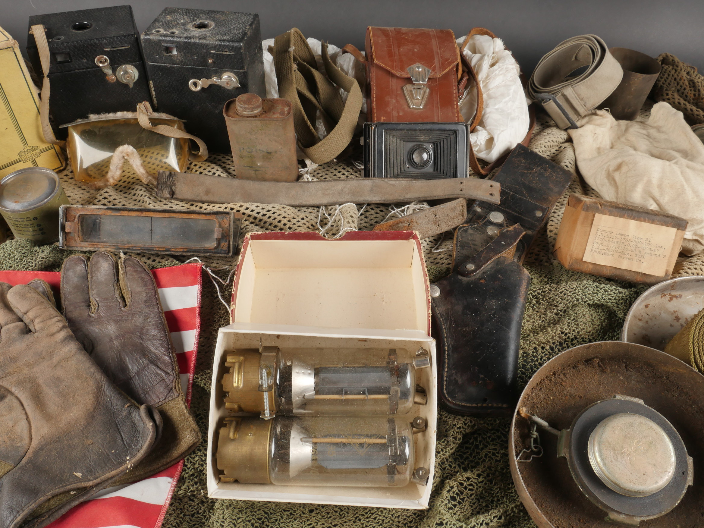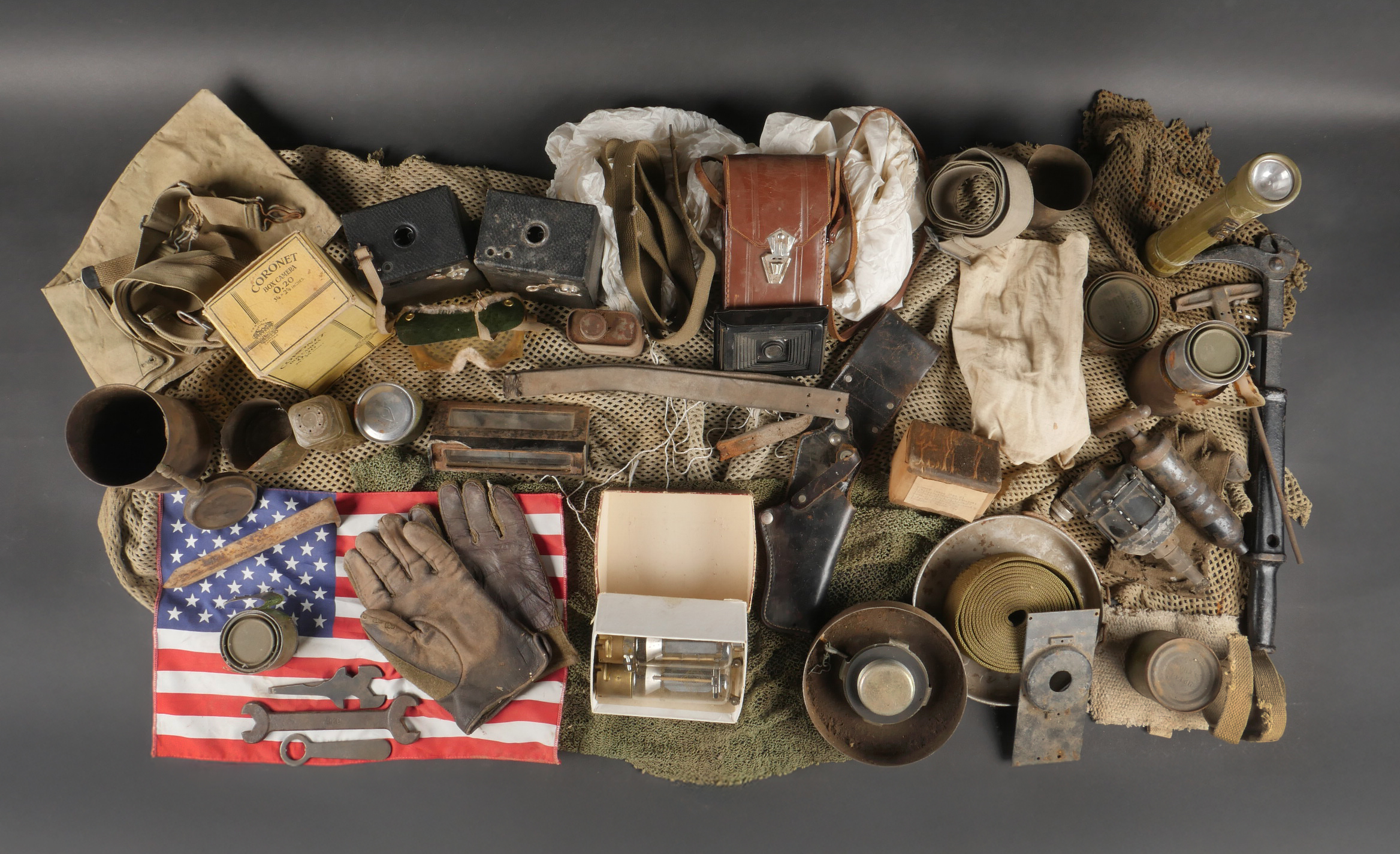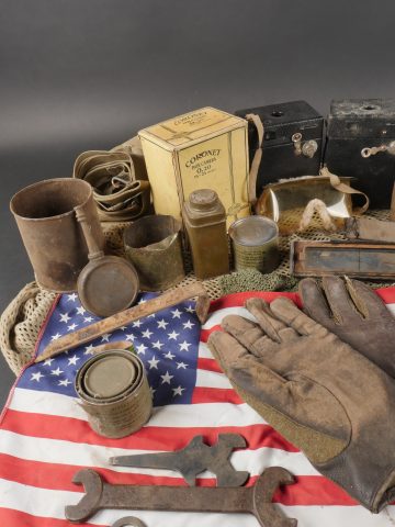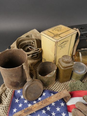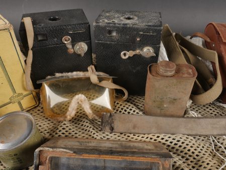 Carton surprise US. Rempli de petits objets du GI autour des thèmes de l’hygiène, la nourriture, équipements, effets personnels, appareils photos, outils, lampes radio, filet de... en savoir plus