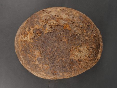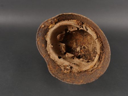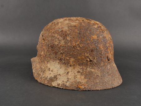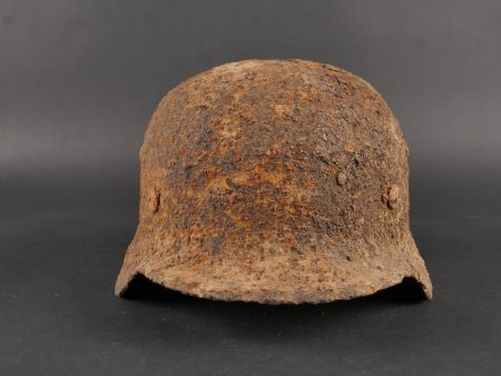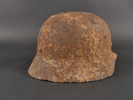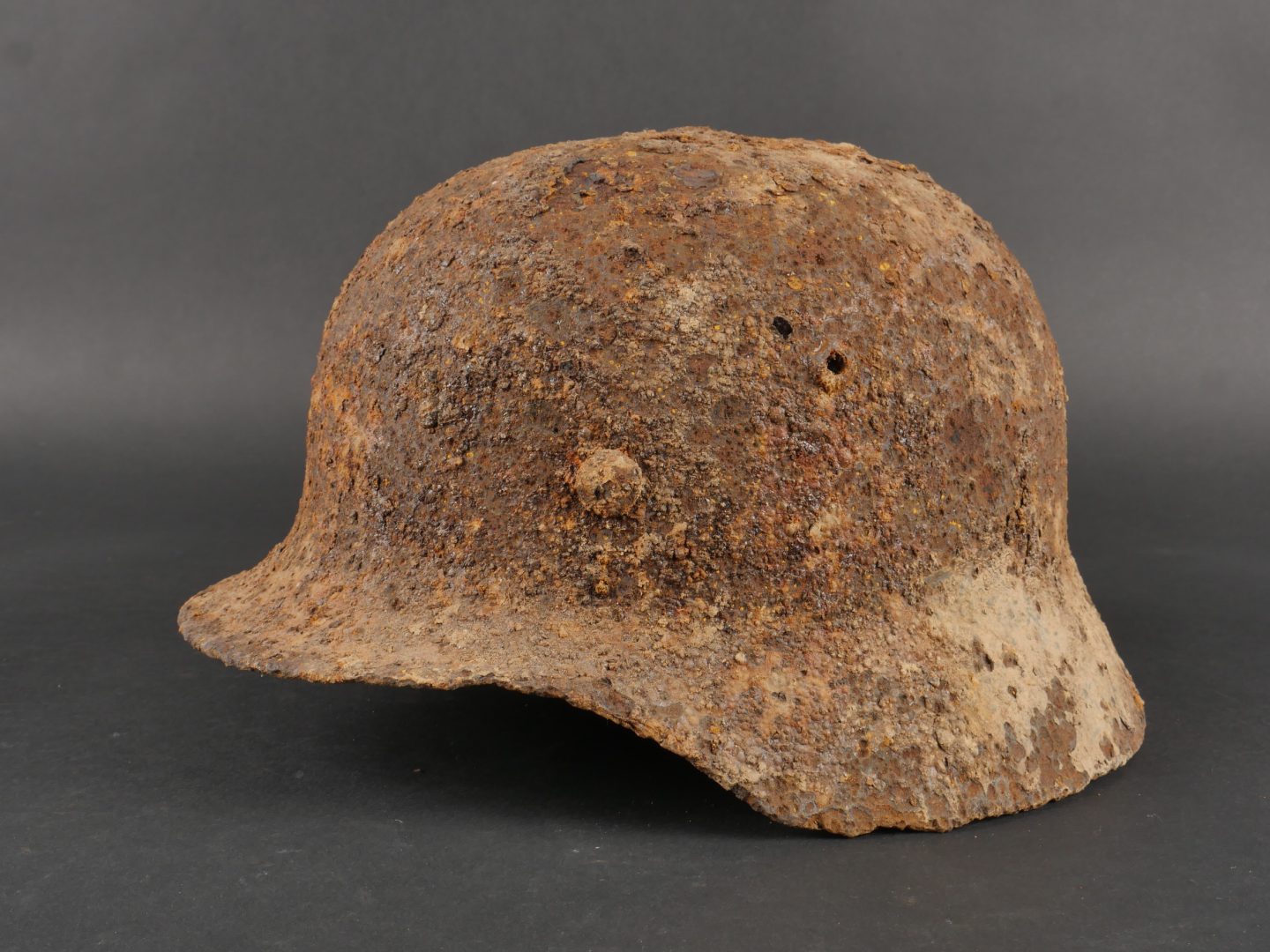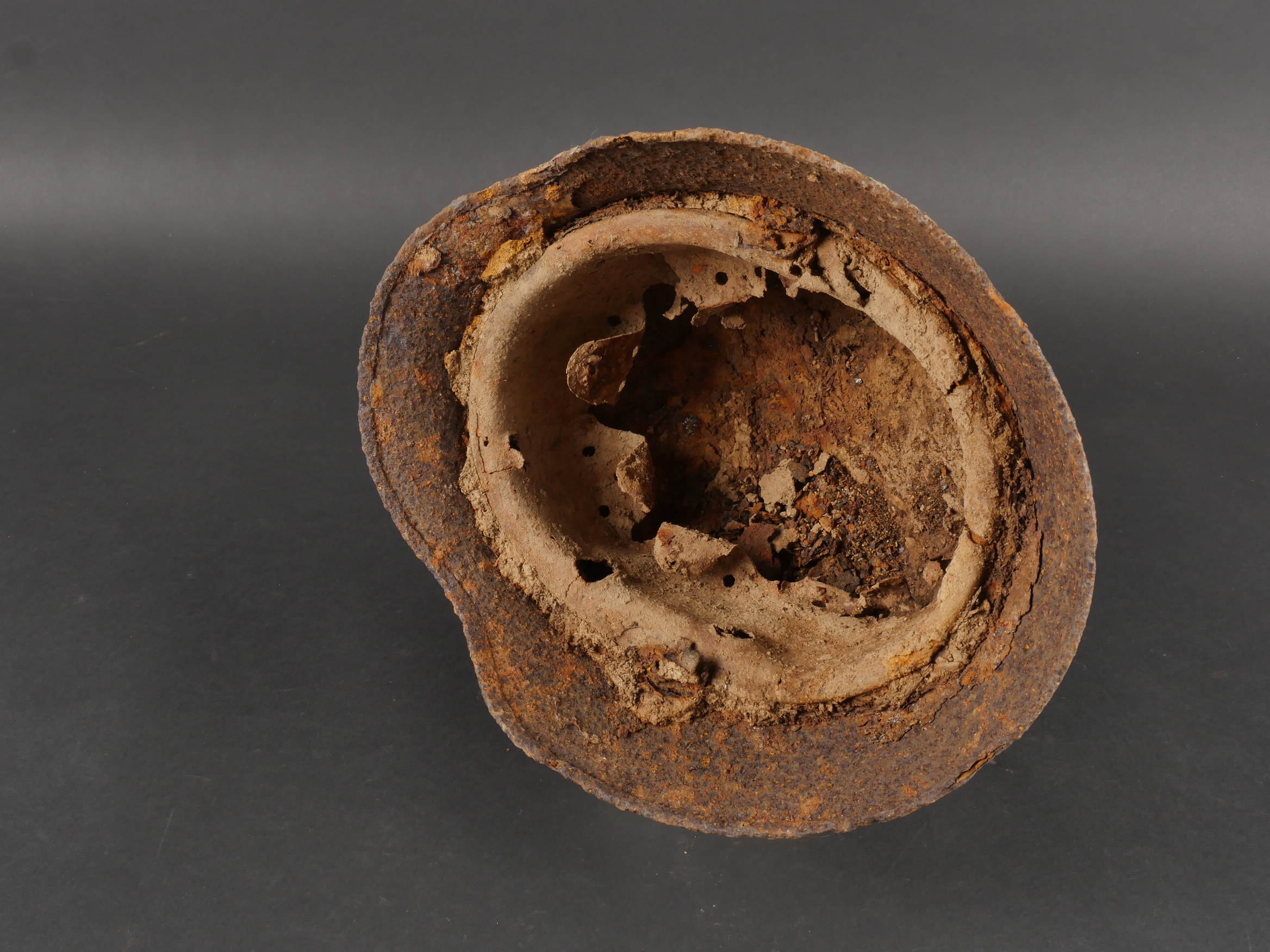 Détails de la vente >Coque de casque allemand. Relique du champ de bataille, casque M35 ou M40 avec encore sa coiffe à l’intérieur, un témoin des combats