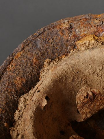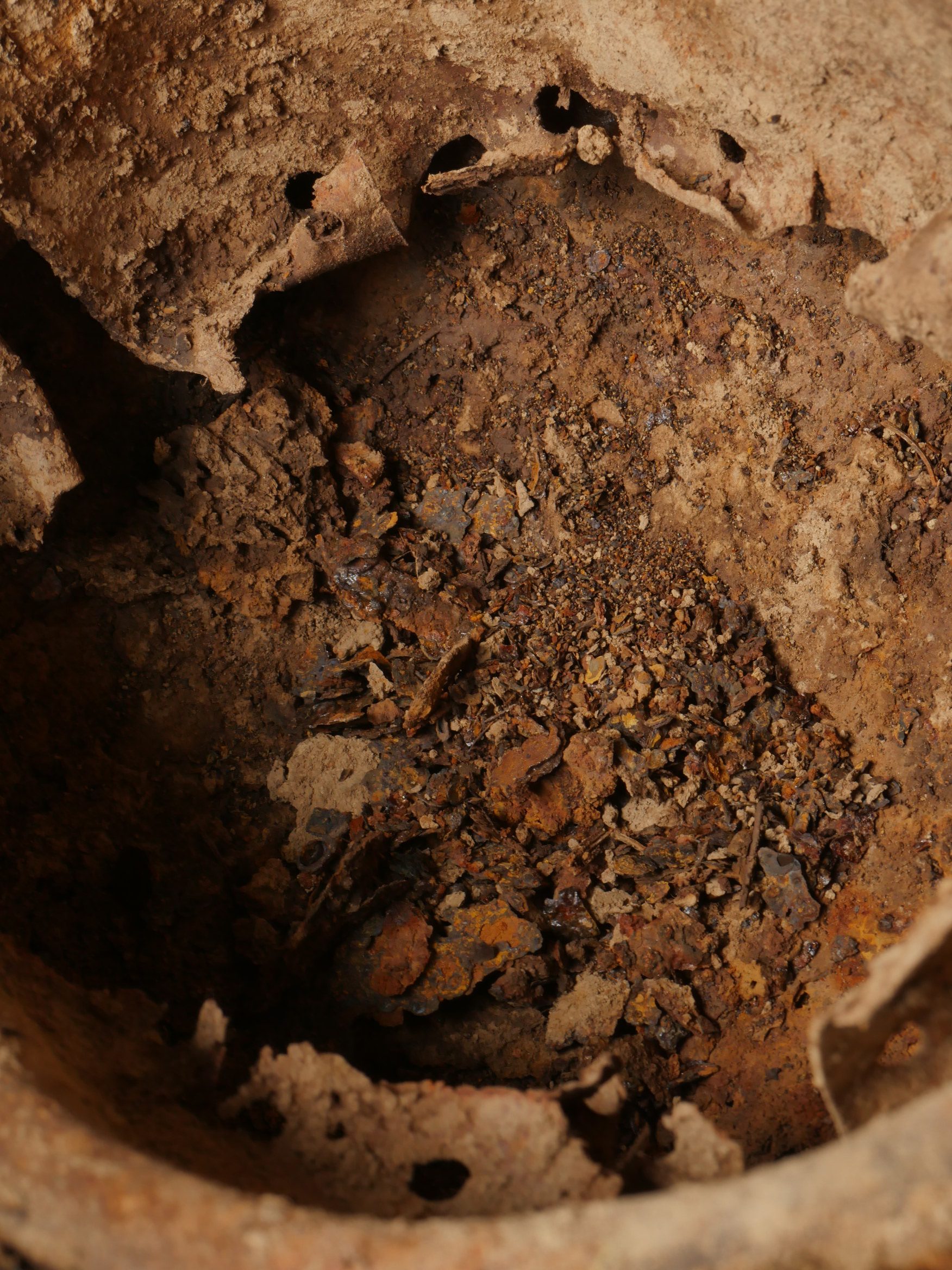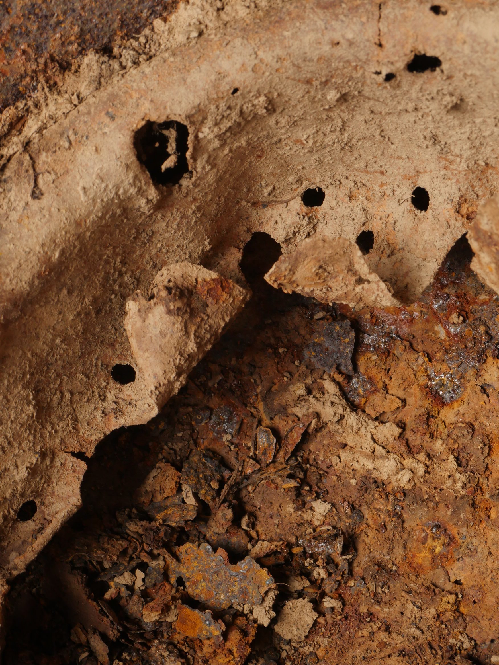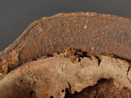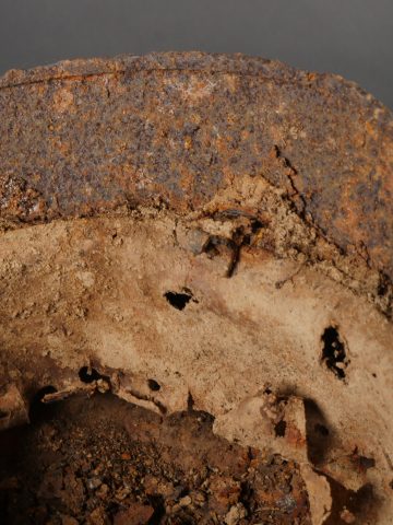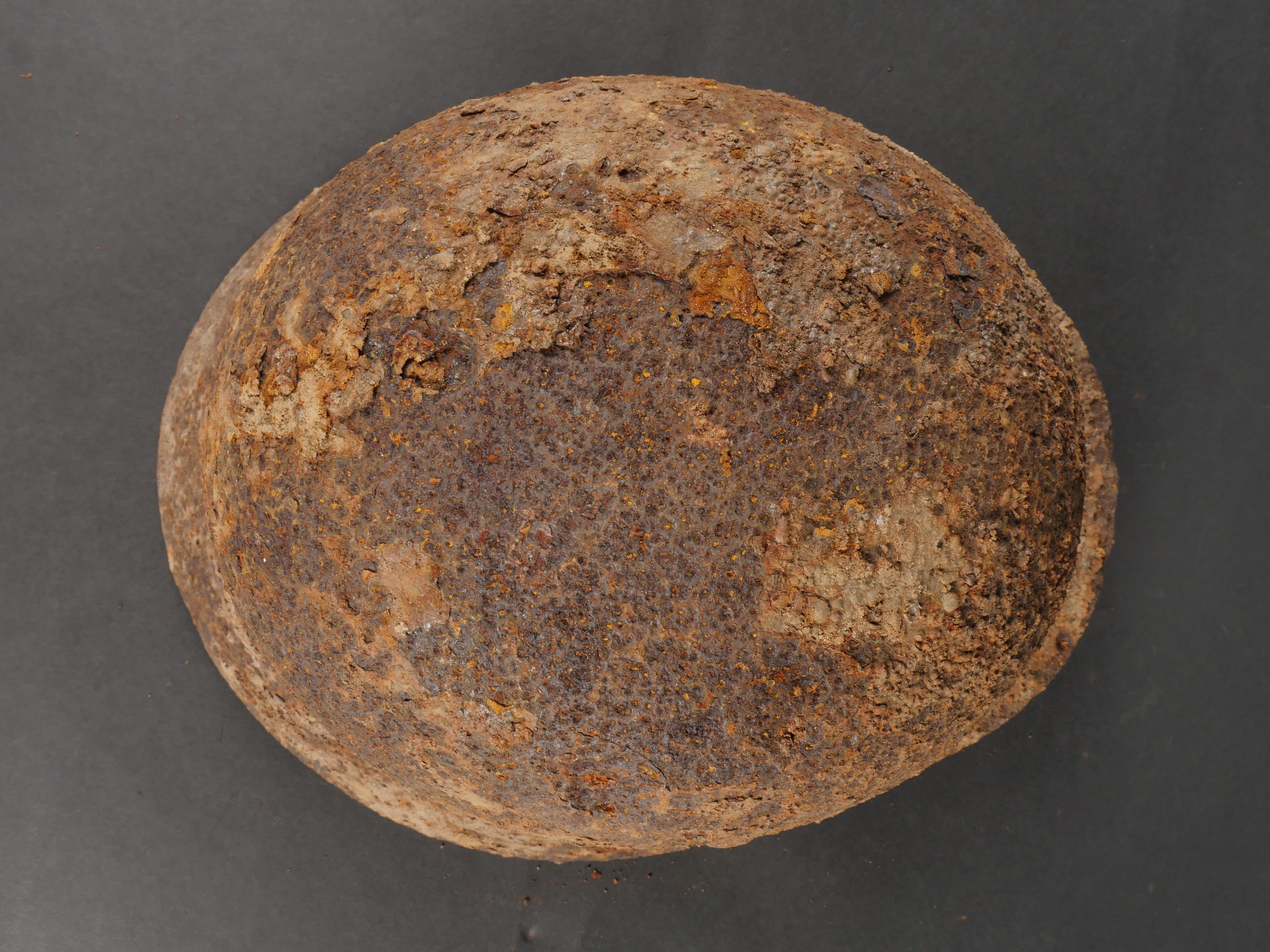 Détails de la vente >Coque de casque allemand. Relique du champ de bataille, casque M35 ou M40 avec encore sa coiffe à l’intérieur, un témoin des combats