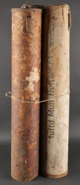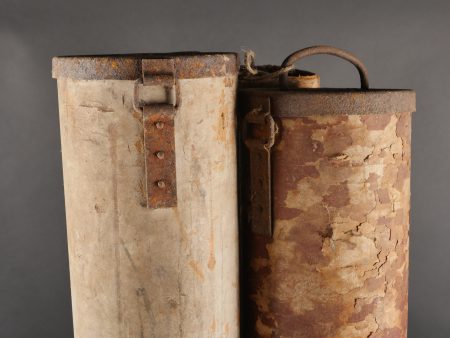 Détails de la vente >Ensemble de 3 containers allemands de 15 cm WGR NEBELWERFER. En carton, un complet en bon état avec reste d’étiquette. Un en mauvais état avec couvercle mais sans fond. Et un troisième... en savoir plus