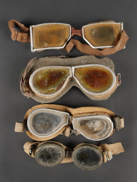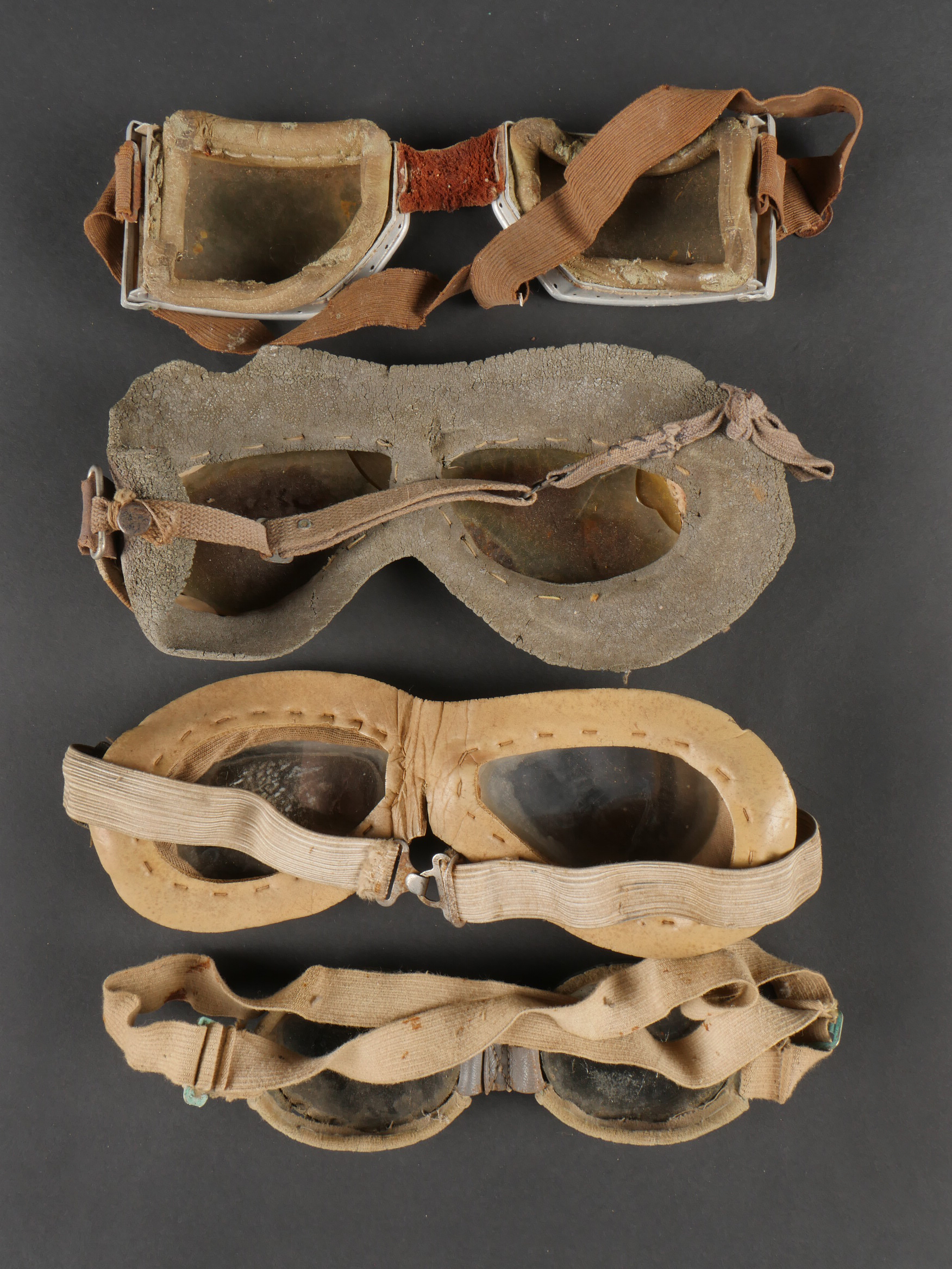 Ensemble de 4 paires de lunettes de pilotes. Modèles à identifier pour pilotes avion ou moto, dont une paire marquée RESISTAL N.Y.