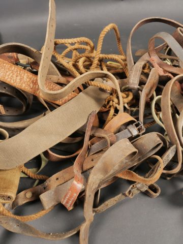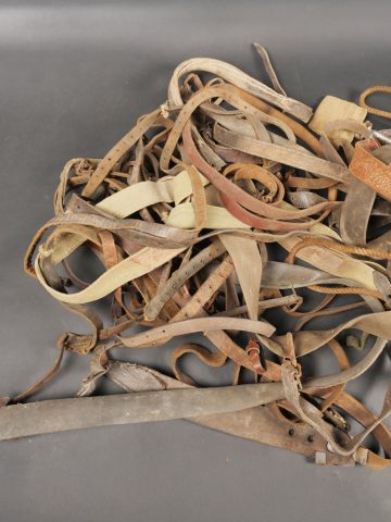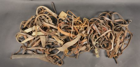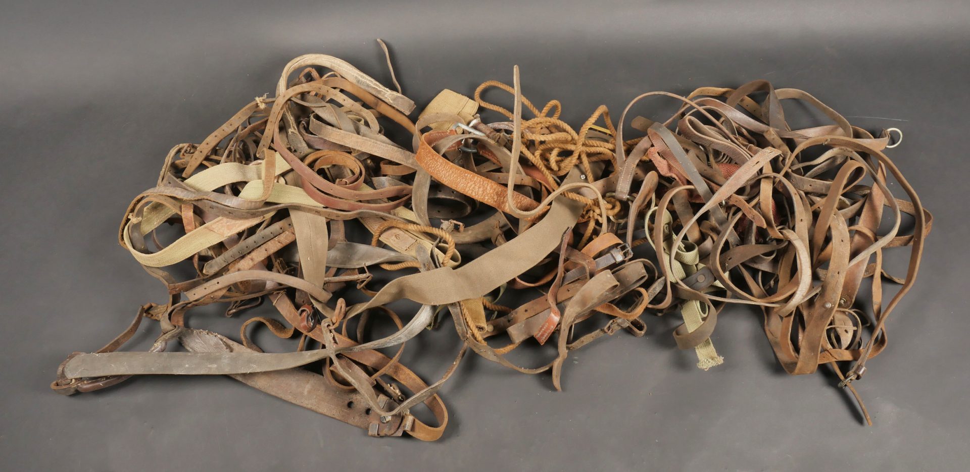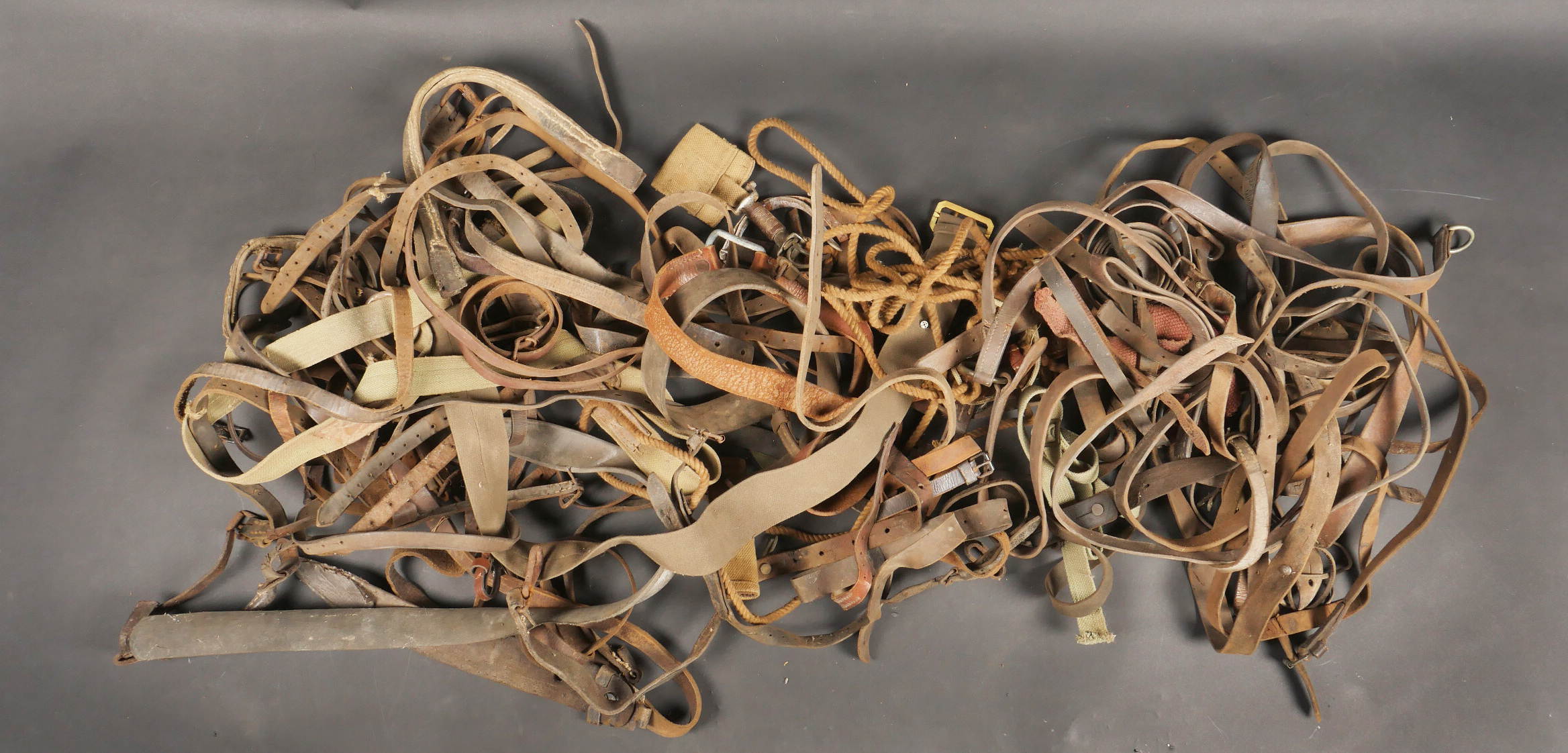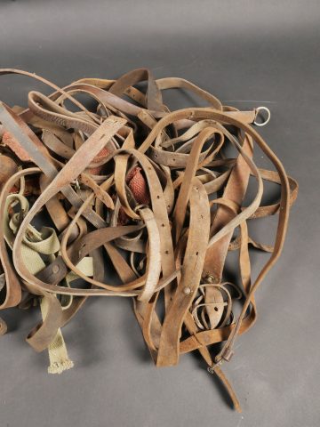 Fort lot de sangles essentiellement allemandes. Très bon lot de sangles de paquetage, de portage, morceaux de ceinturons, quelques sangles alliées, jugulaire US, ceinture en toile, sangles de harnachement, certaines civiles et/ou non marquées. Un lot à examiner de près, plus de 60 pièces !