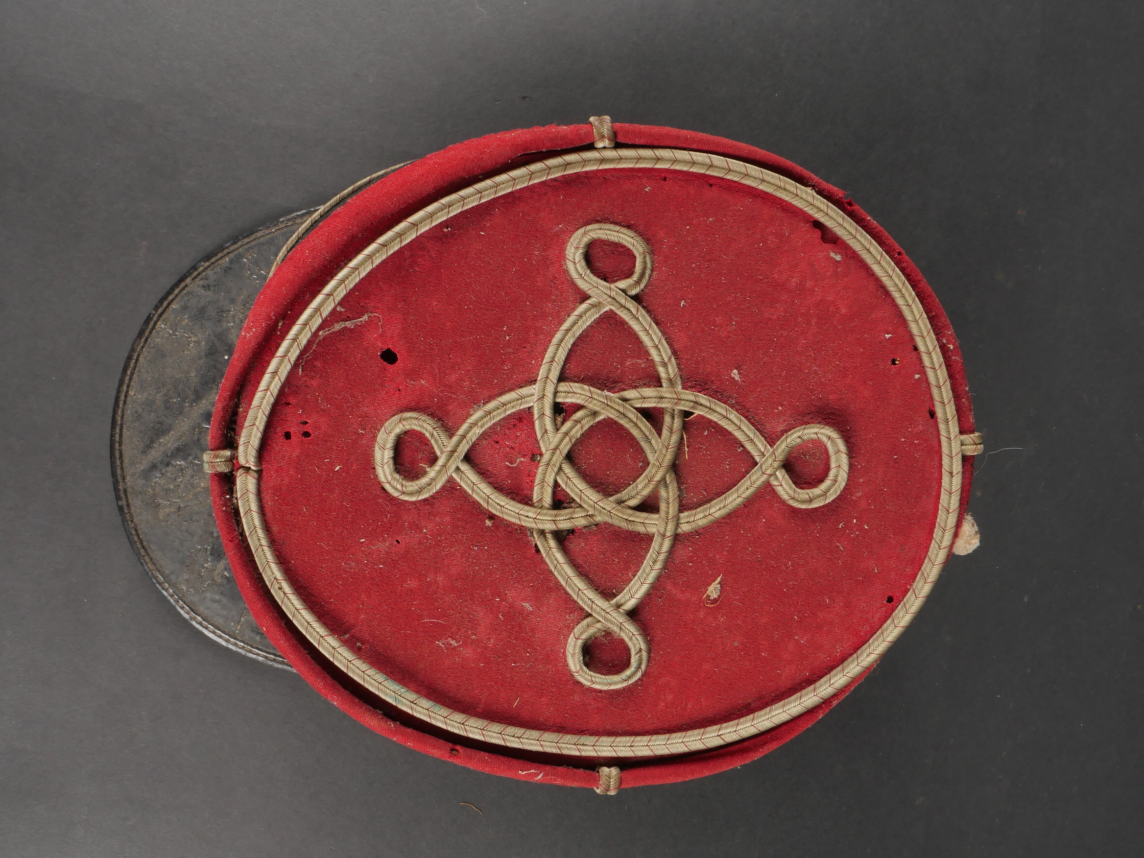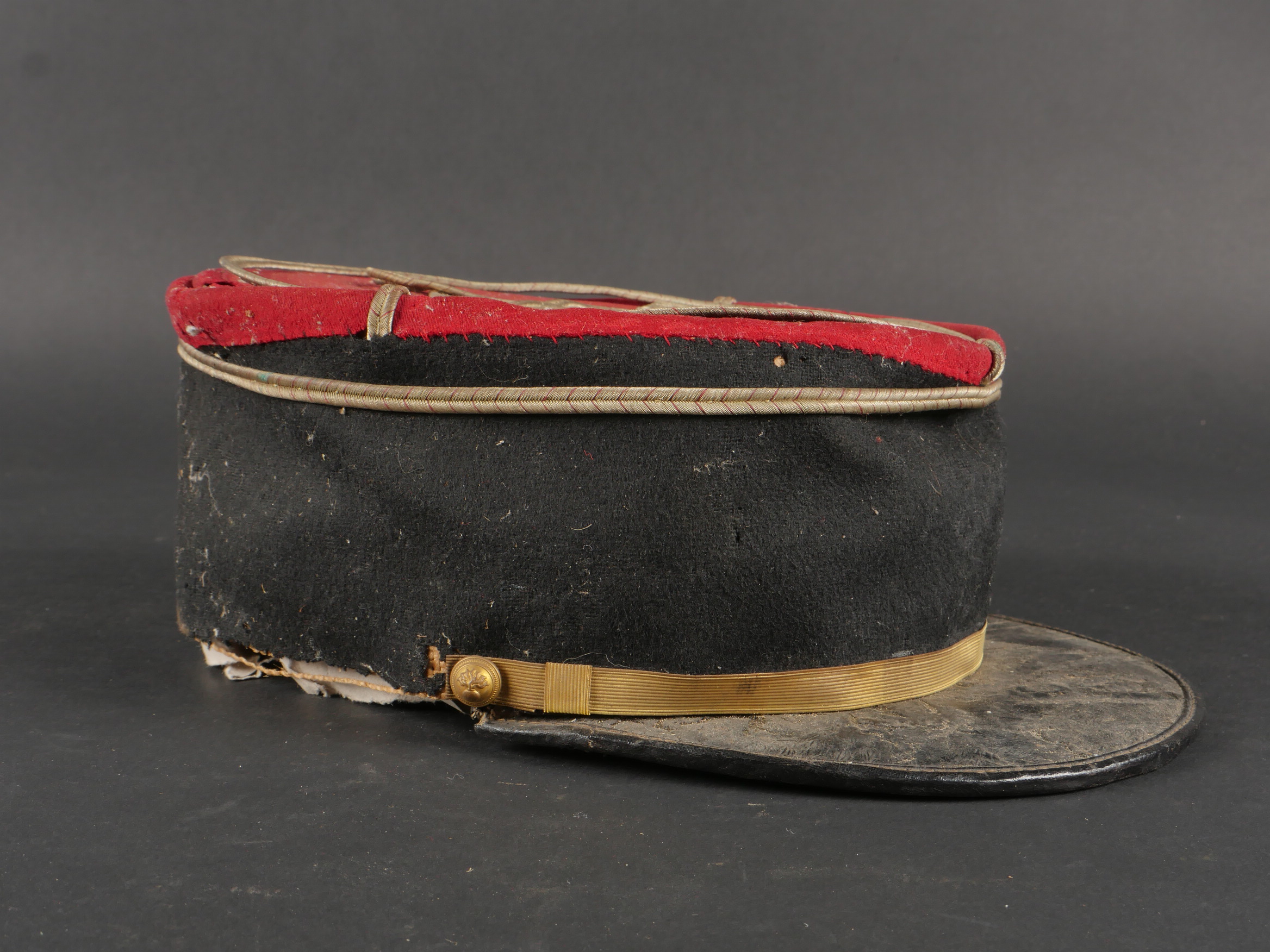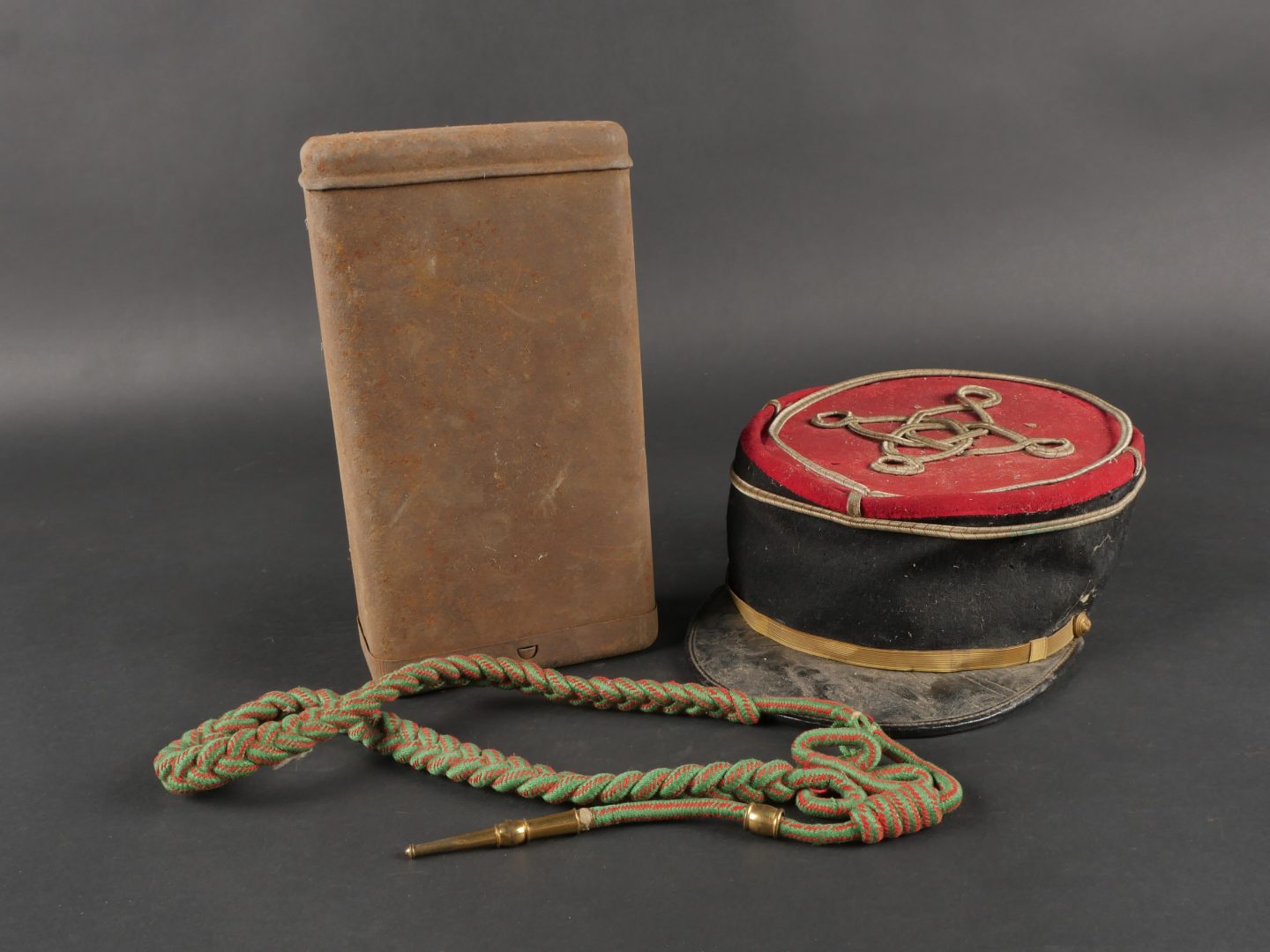 France WW1 képi d’adjudant d’infanterie et divers. Képi à nettoyer, quelques trous de mites, passementerie à recoudre. Une boîte à vivres en fer, corrosion. On joint une fourragères plus tardive aux couleurs de la Croix de Guerre