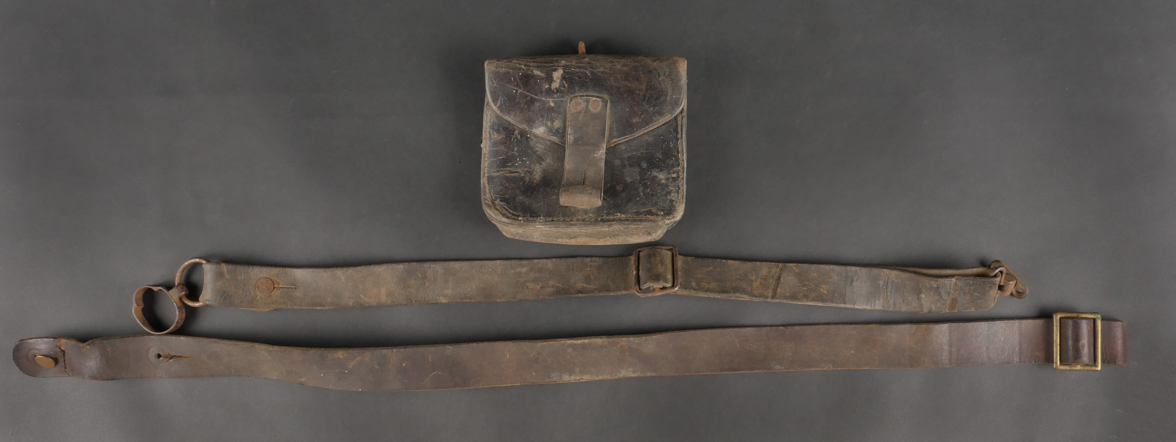 France WW1 lot d’équipements troupe. Cartouchière rivetée avec son crochet, une bretelle d’arme à garnitures fer avec encore ses fixations de l’arme. Une autre bretelle garnitures laiton, française ou belge, incomplète.