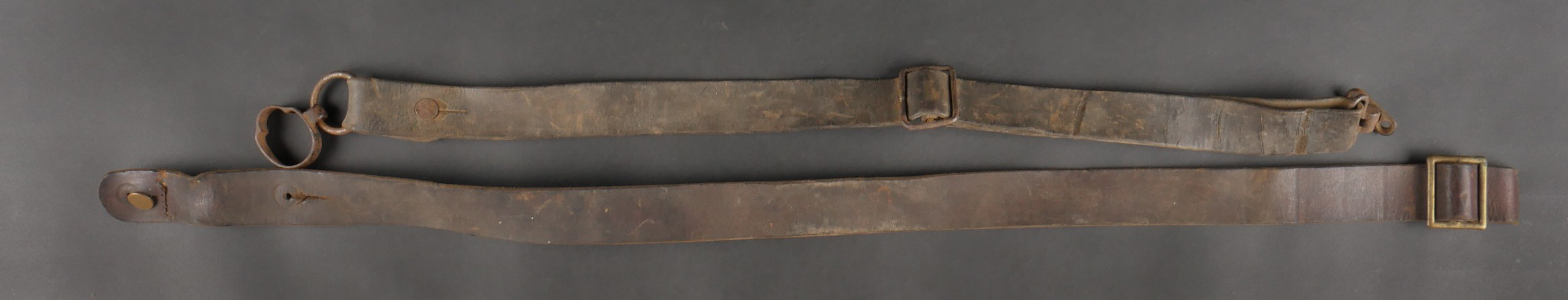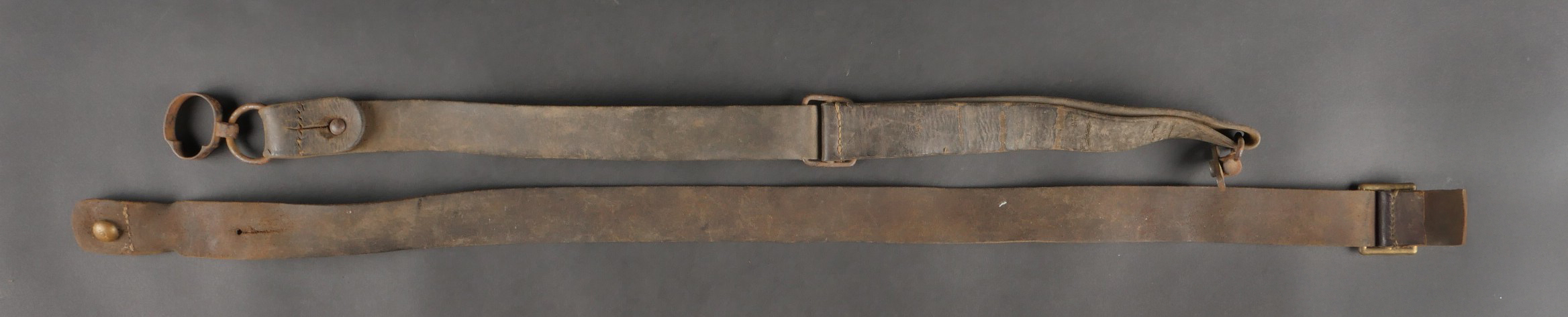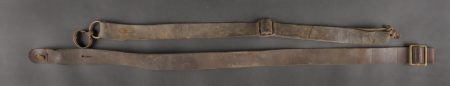 Détails de la vente >France WW1 lot d’équipements troupe. Cartouchière rivetée avec son crochet, une bretelle d’arme à garnitures fer avec encore ses fixations de l’arme. Une autre bretelle... en savoir plus
