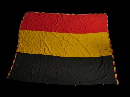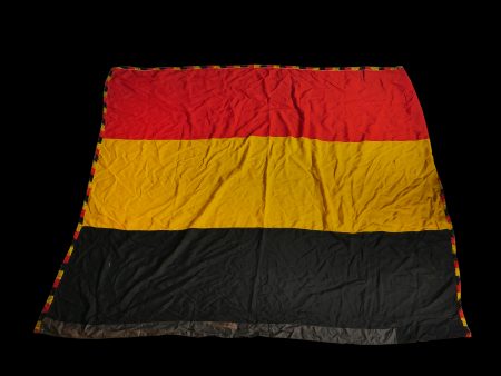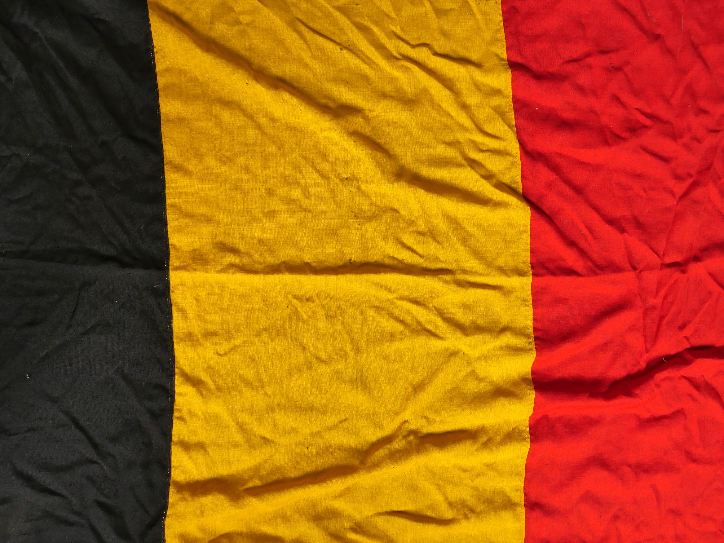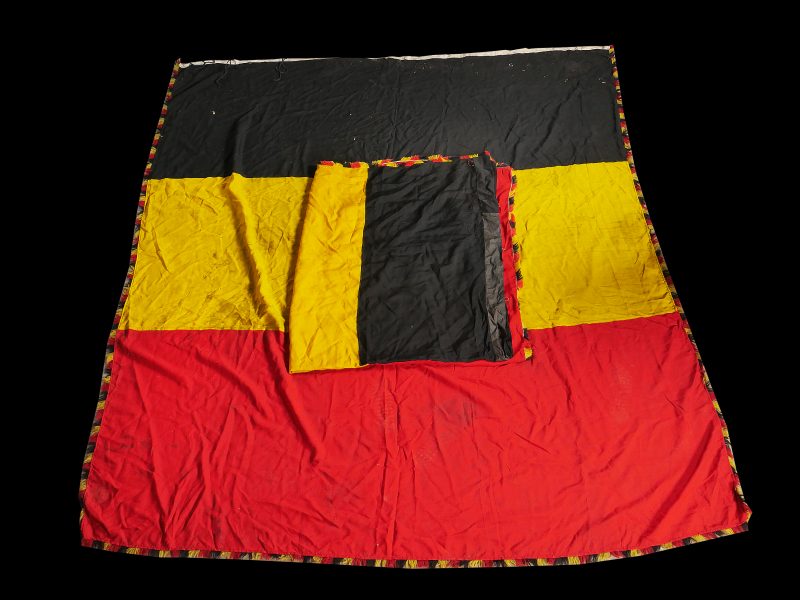 Lot de 2 grands drapeaux de la Belgique. Un d’environ 2 x 2,45 mètres avec anneaux de suspension. Un second d’environ 2,65 x 2,90 mètres avec rubans de fixation. Quelques trous, accrocs, usure
