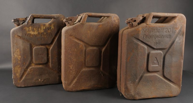 Lot de 3 jerrycans allemands. Pour carburant Wehrmacht, datés 1942, 1943, 1944