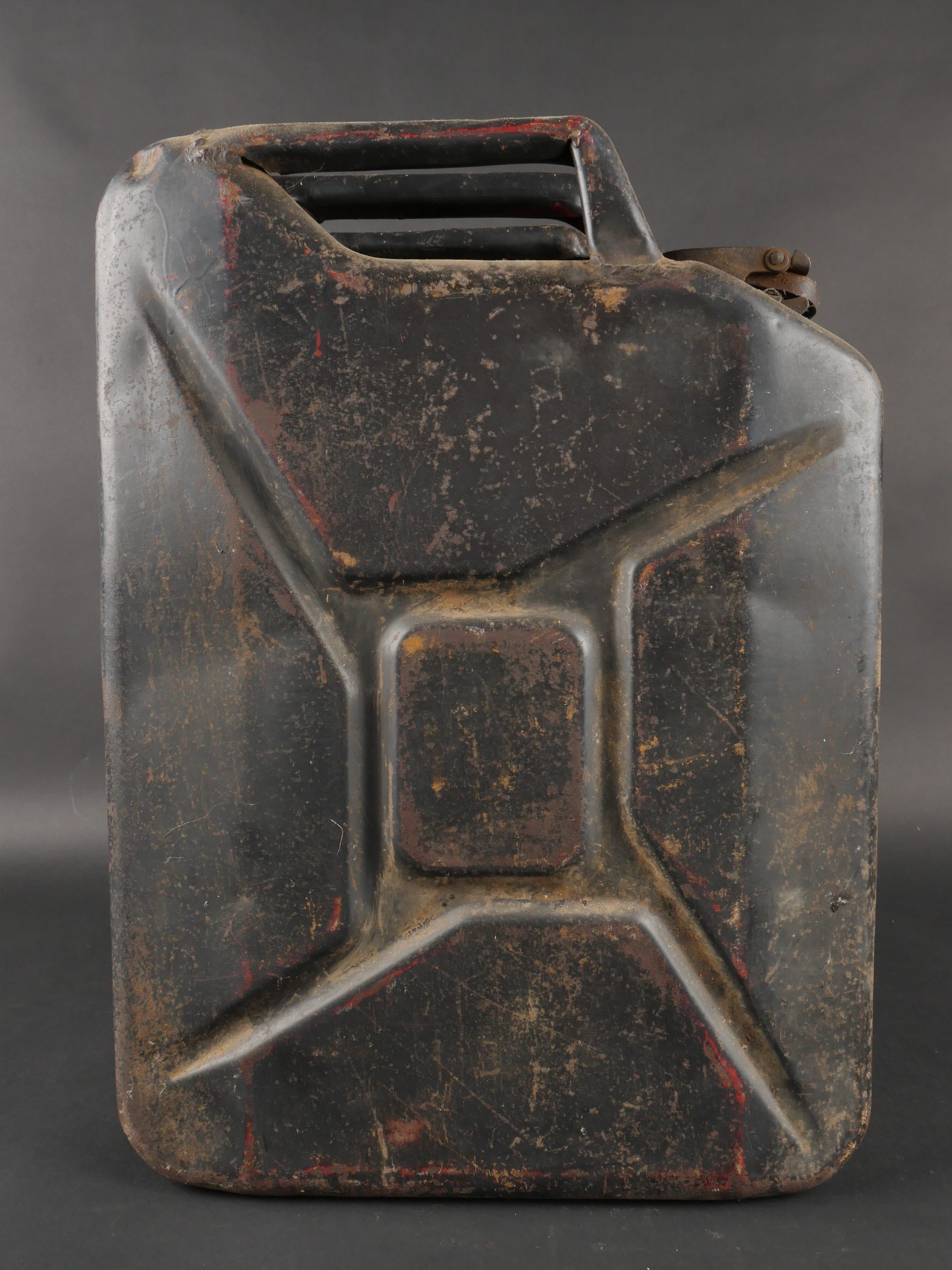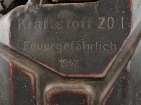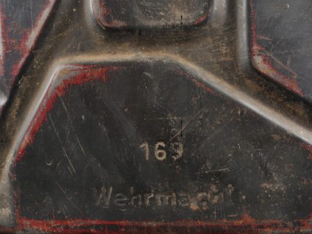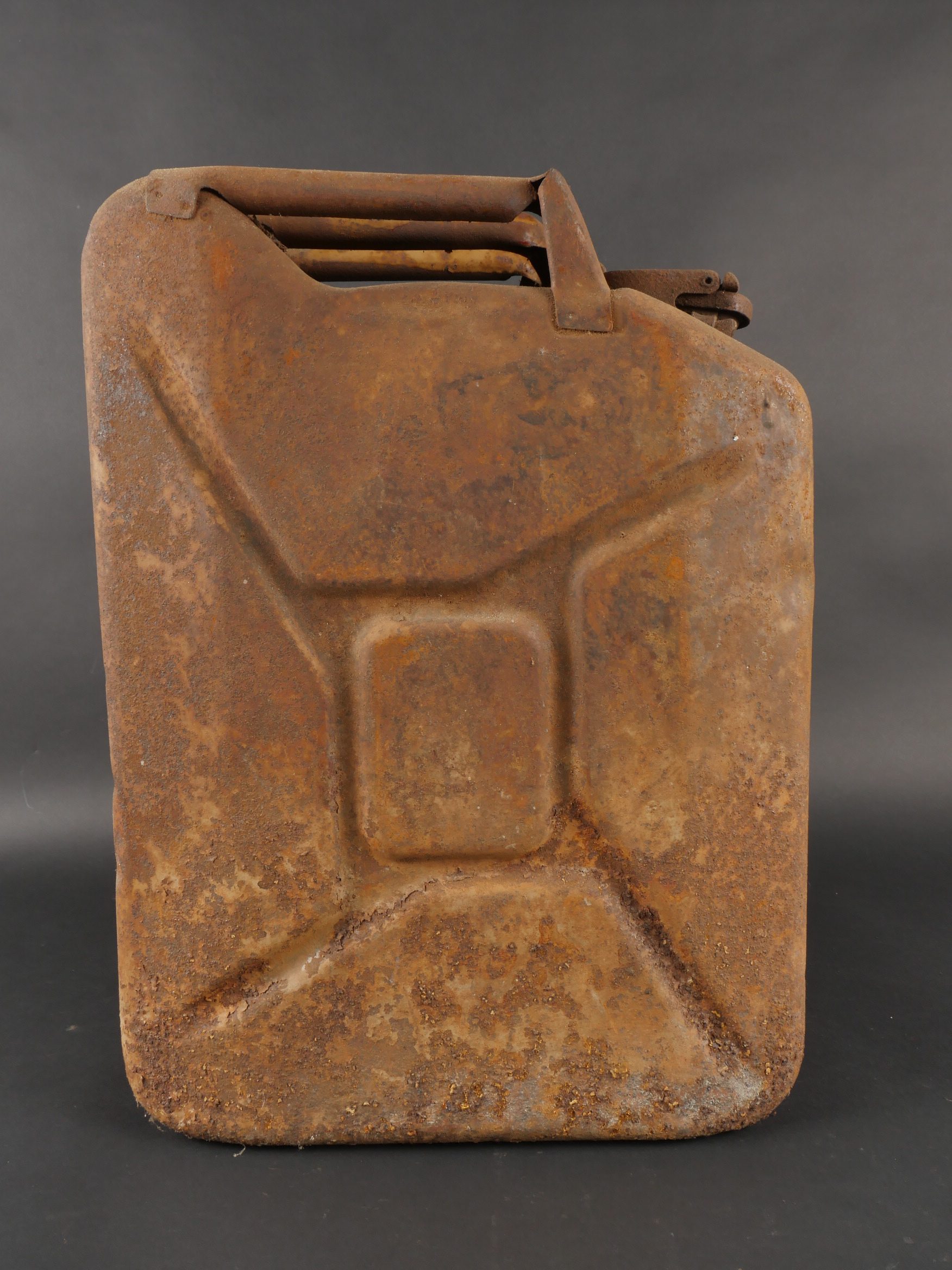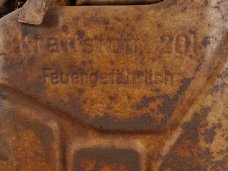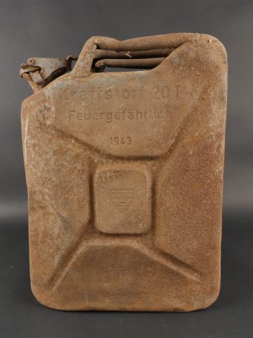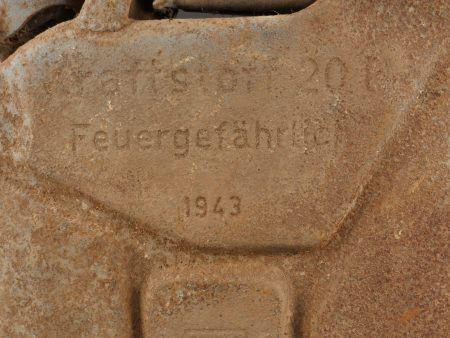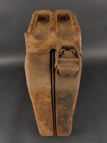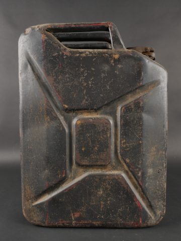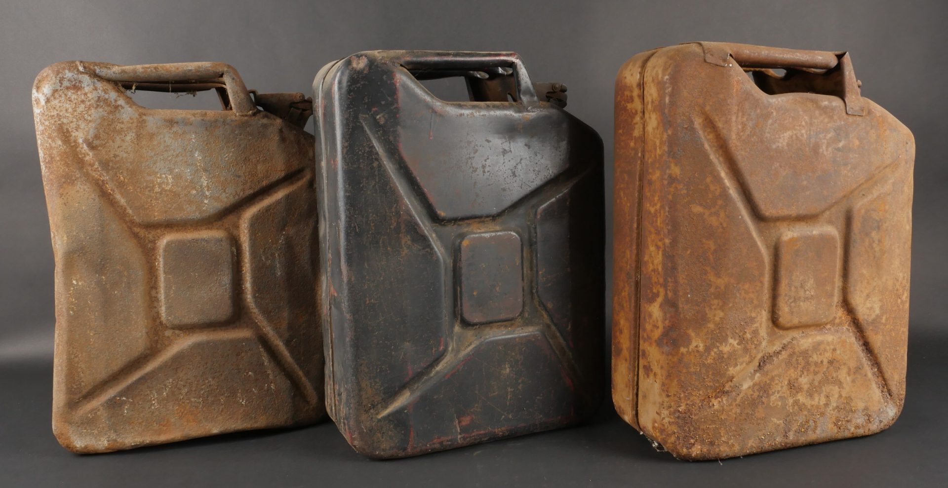 Détails de la vente >Lot de 3 jerrycans allemands. Jerrycans de carburant Wehrmacht, un beau en peinture noire daté 1942, un rouillé daté 1943 et un avec peinture sable daté 1943, corrosion, coups