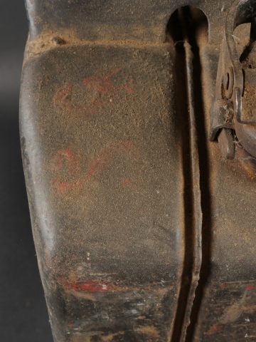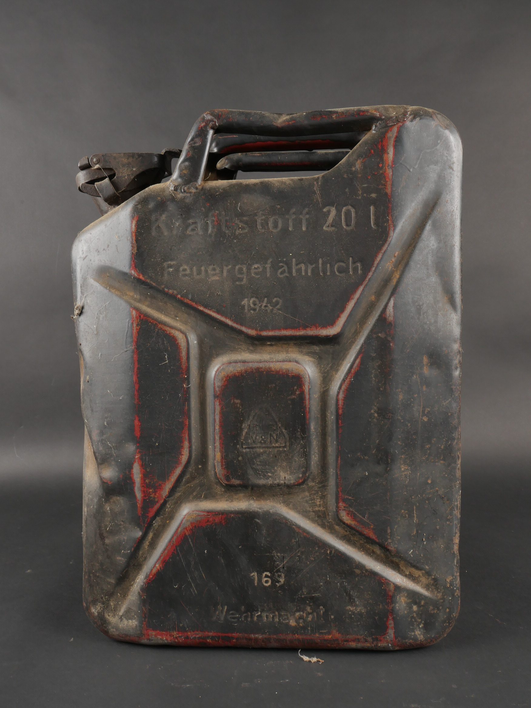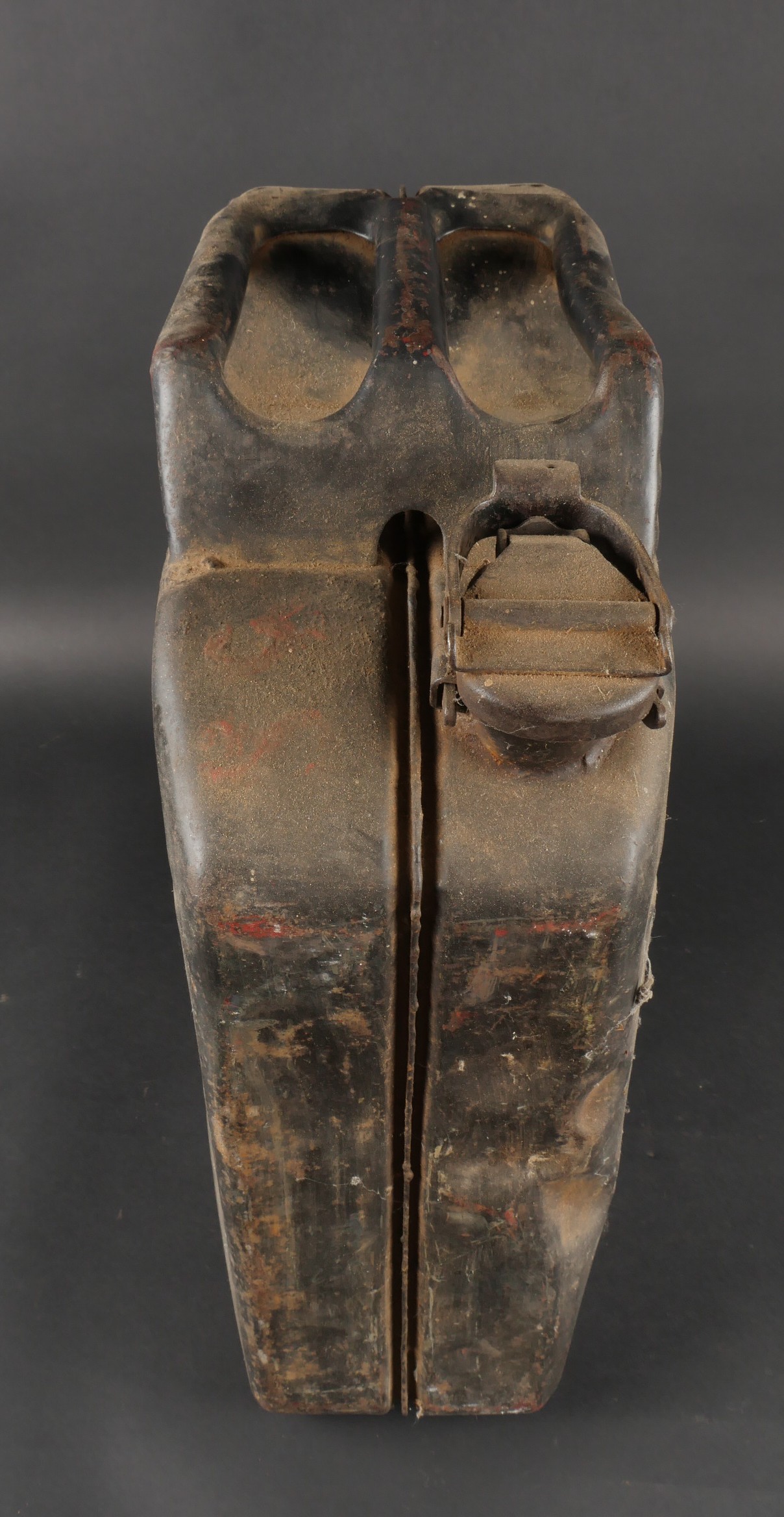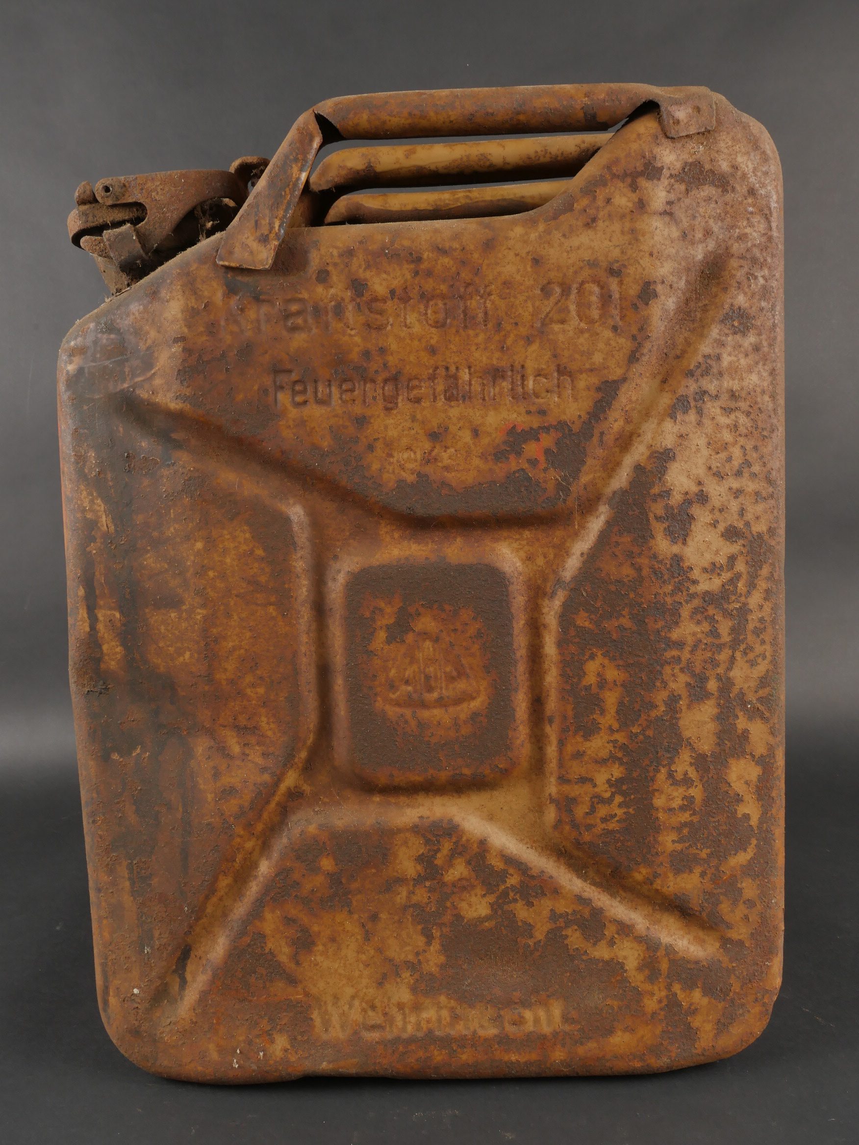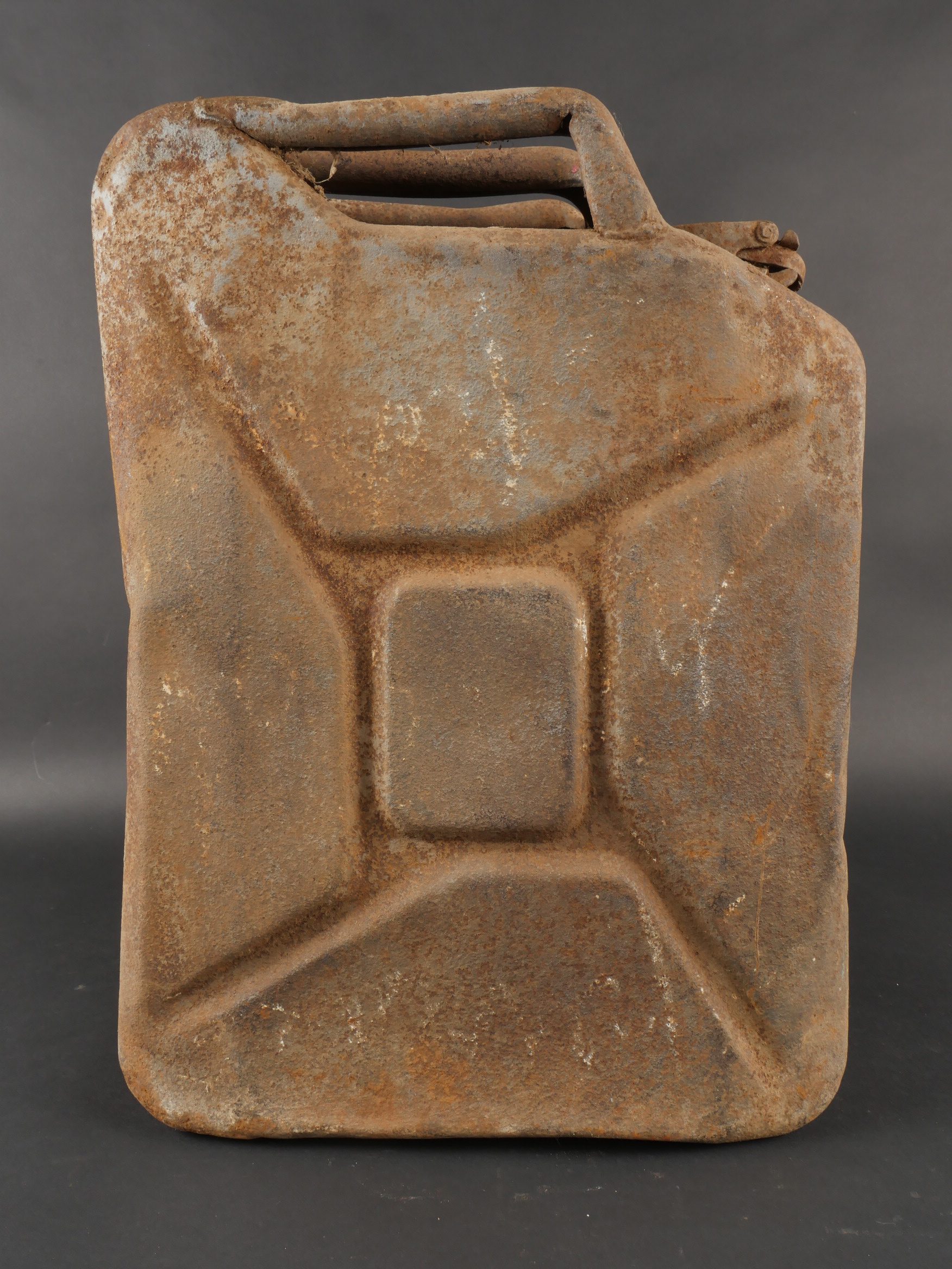 Détails de la vente >Lot de 3 jerrycans allemands. Jerrycans de carburant Wehrmacht, un beau en peinture noire daté 1942, un rouillé daté 1943 et un avec peinture sable daté 1943, corrosion, coups