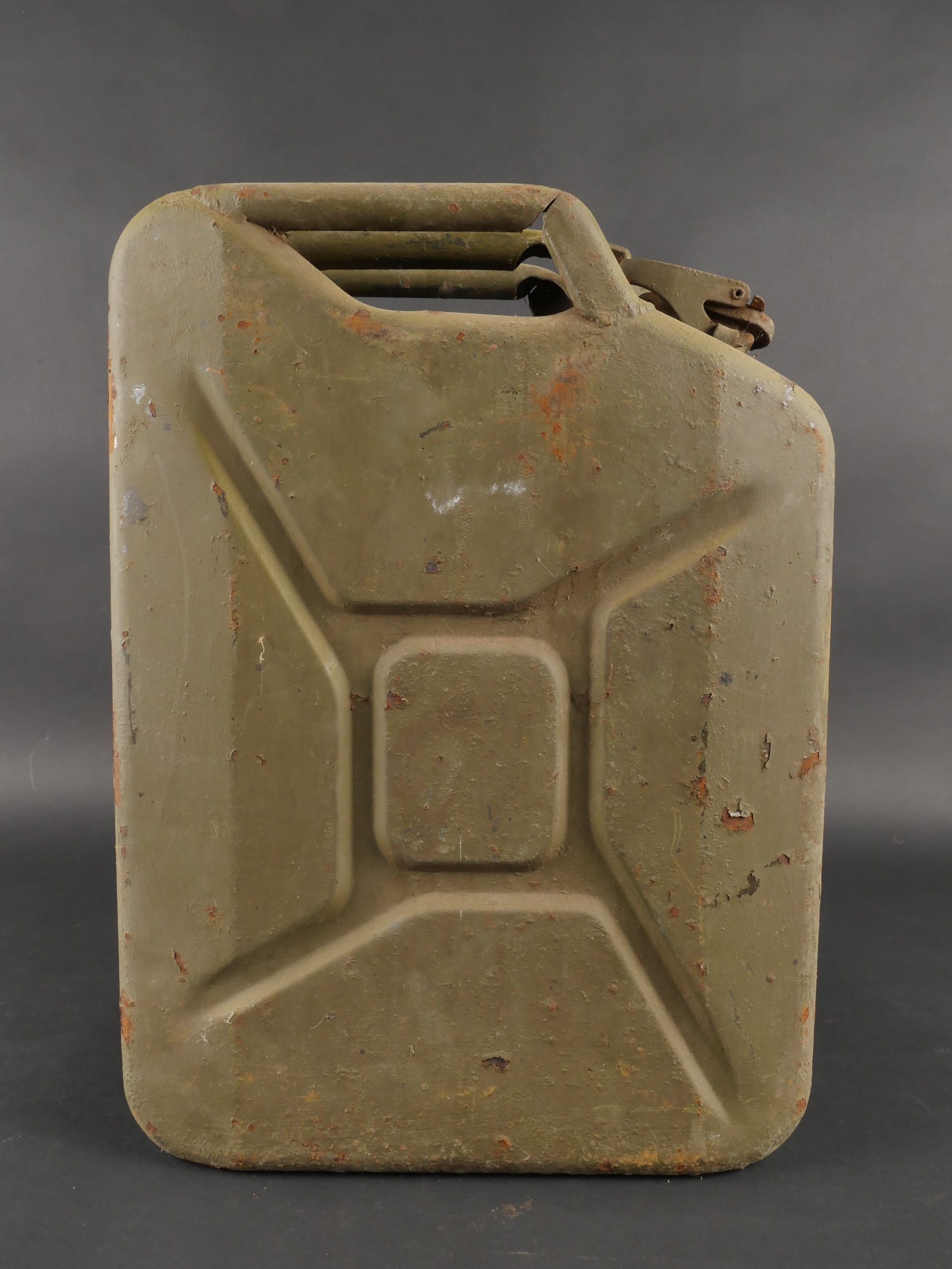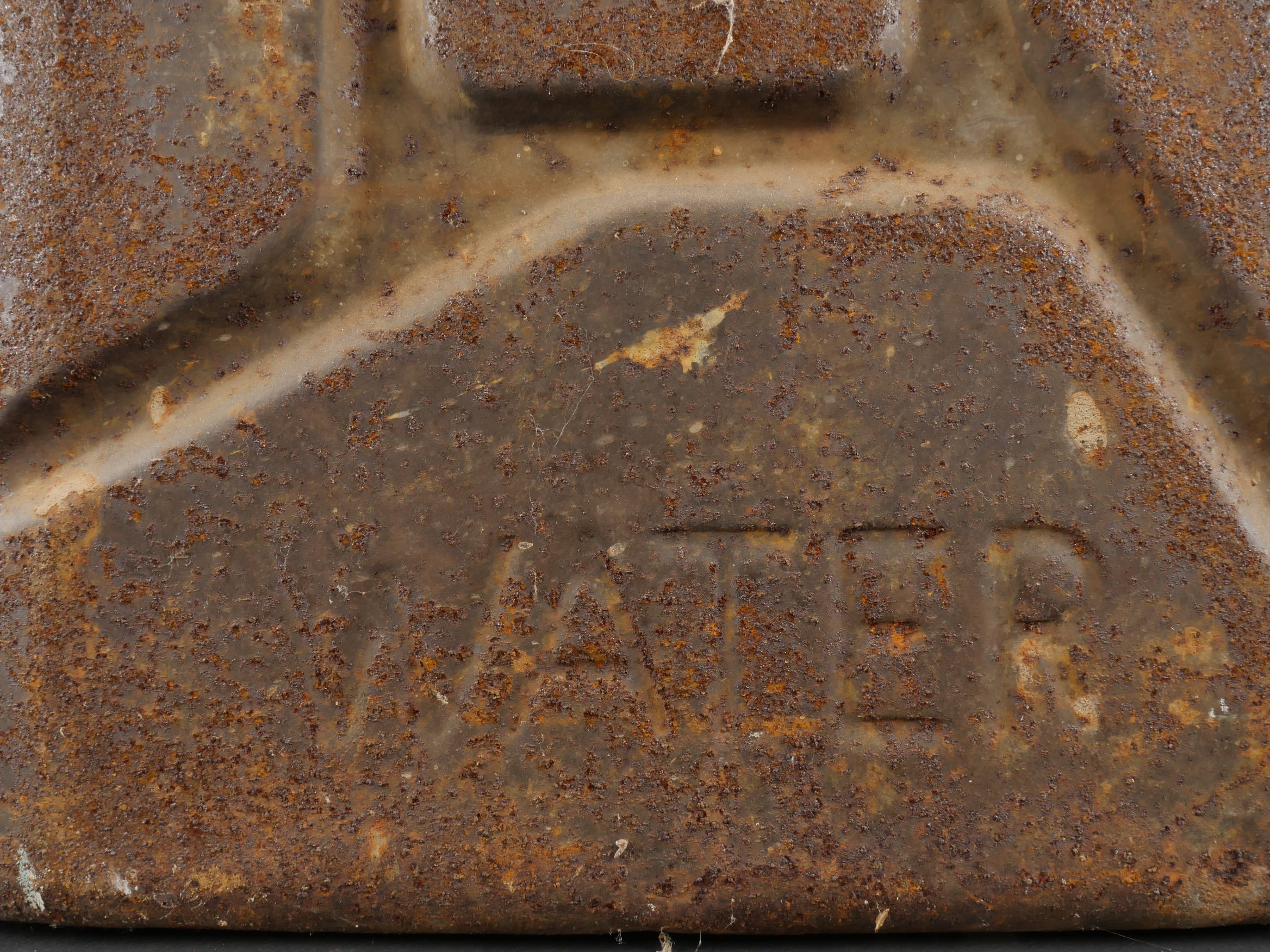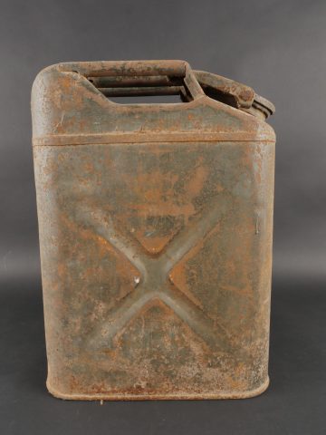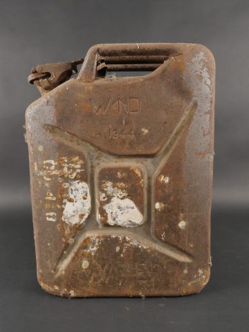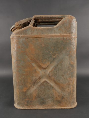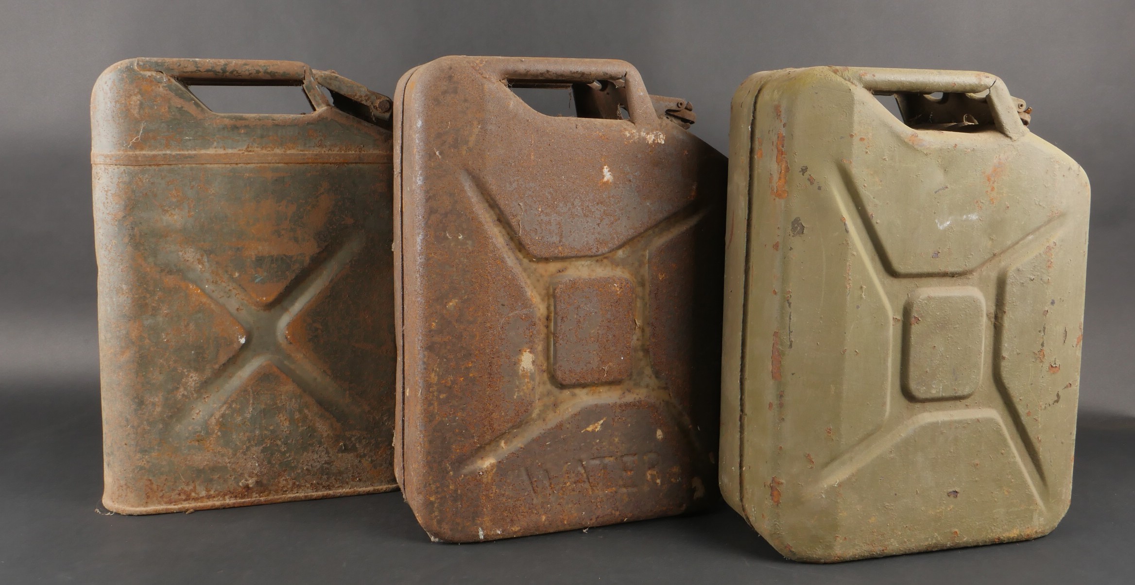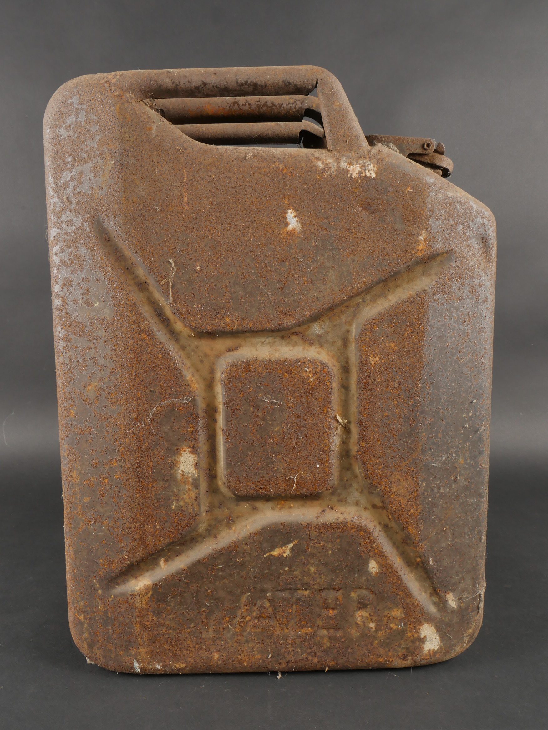 Détails de la vente >Lot de 3 jerrycans alliés? Un jerrycan US, un anglais pour de l’eau avec marquage à la peinture, et un repeint