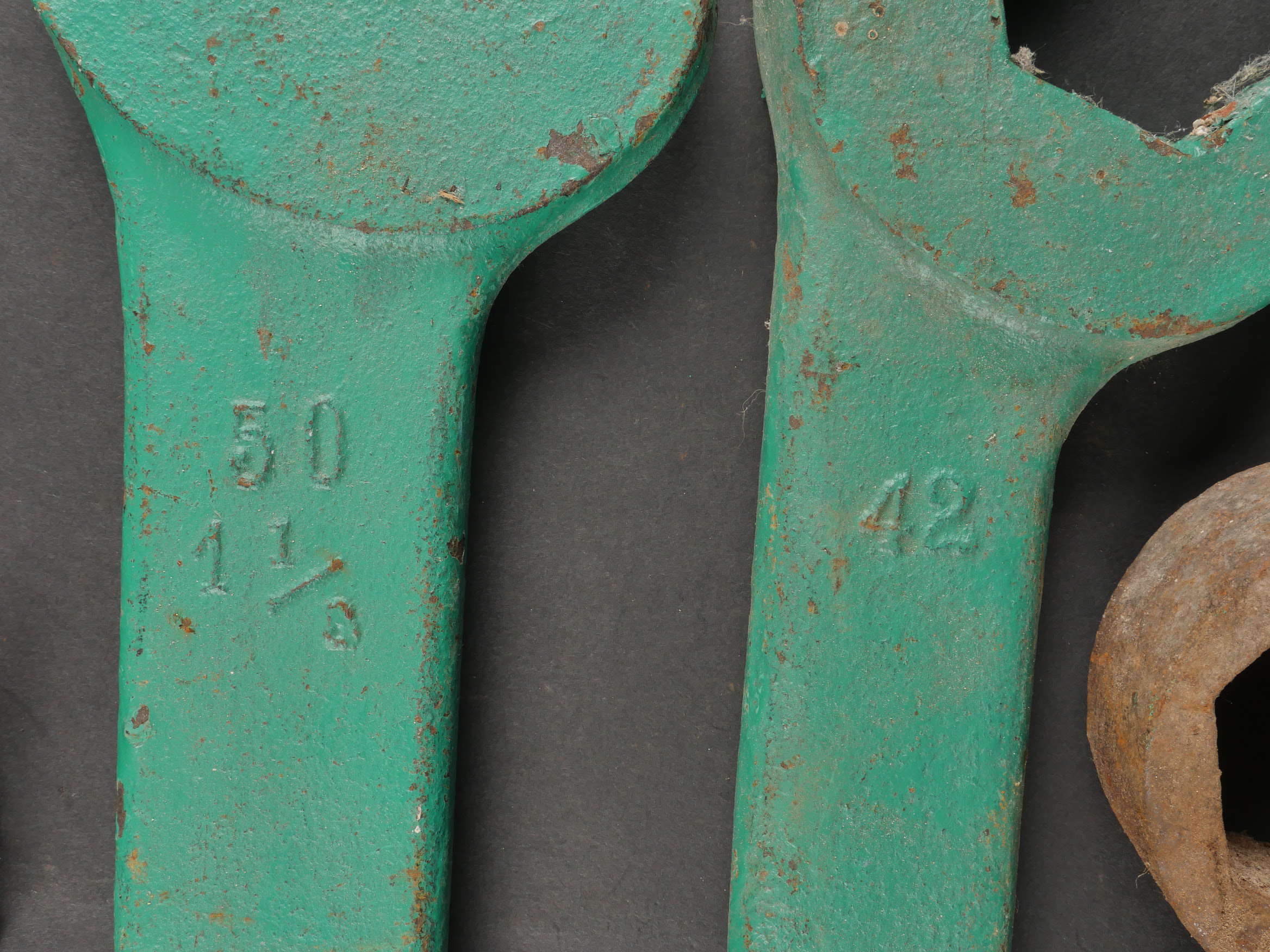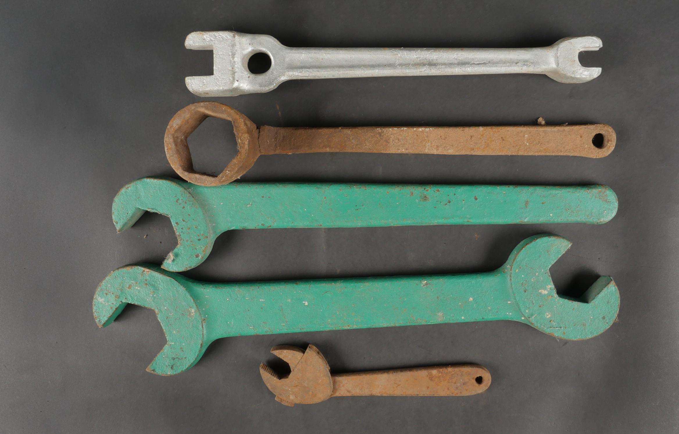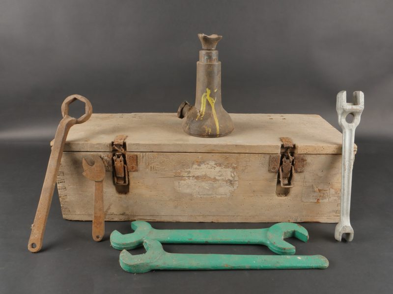lot de 5 clés et cric. Dans une caisse pour 2cm incendiaires avec une belle étiquette, clés et cric époque et usage à déterminer, provenance Bastogne