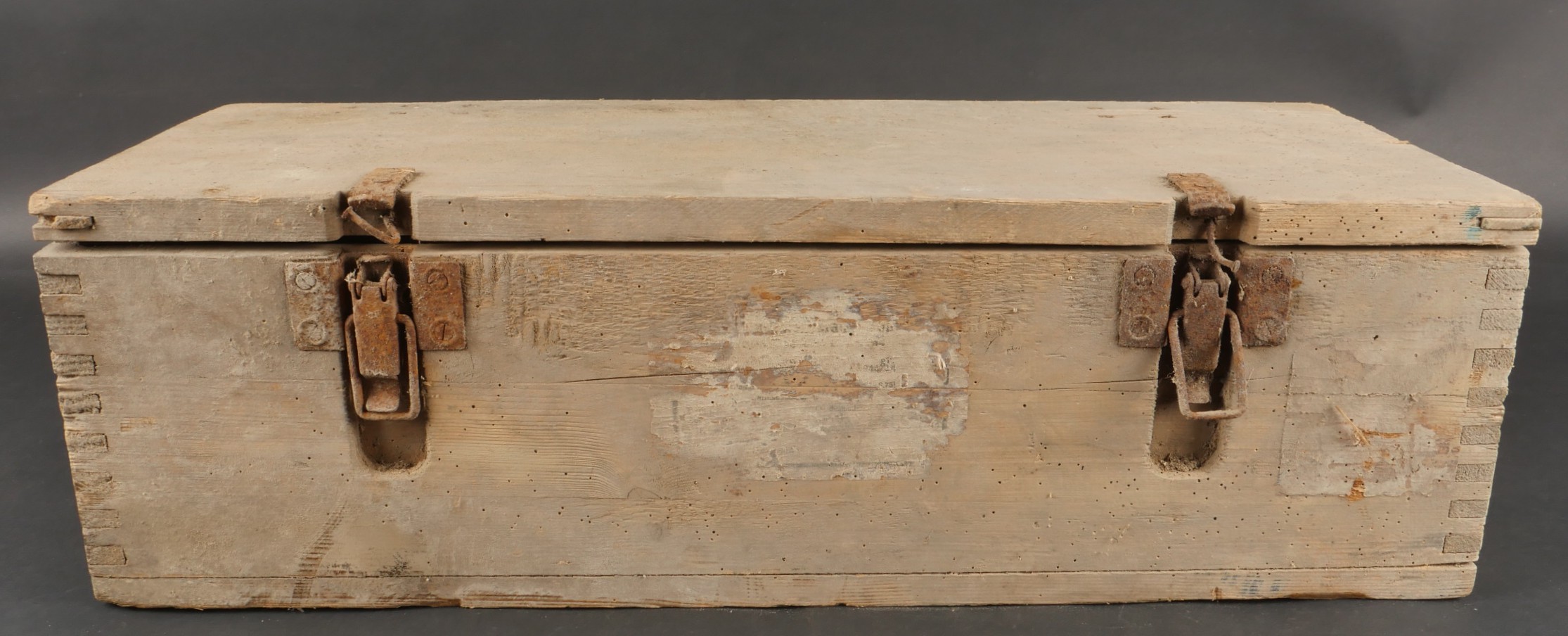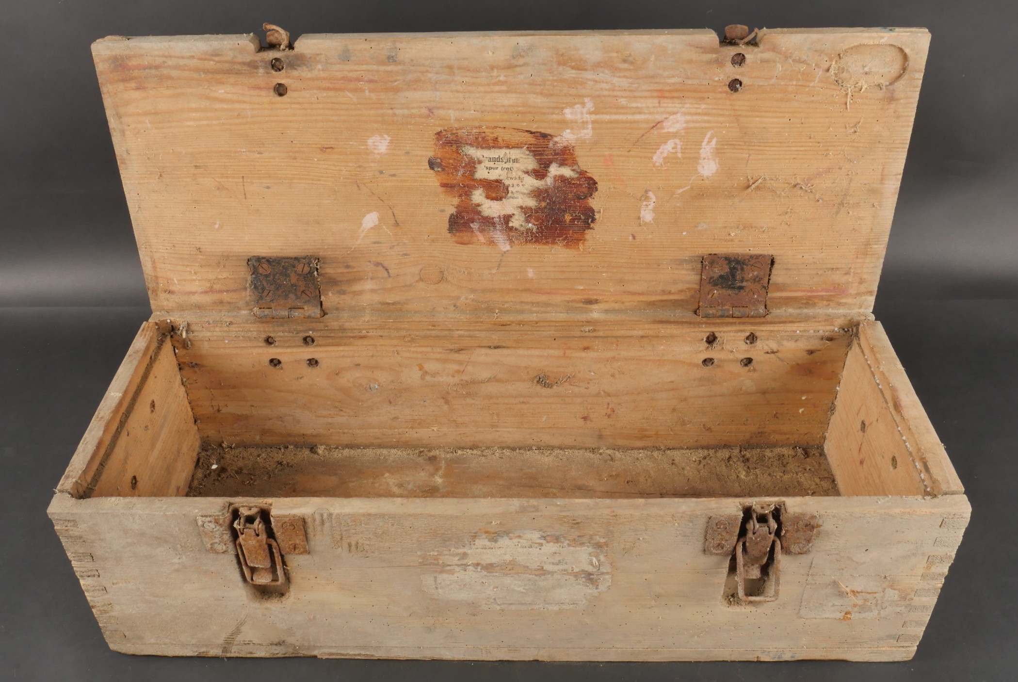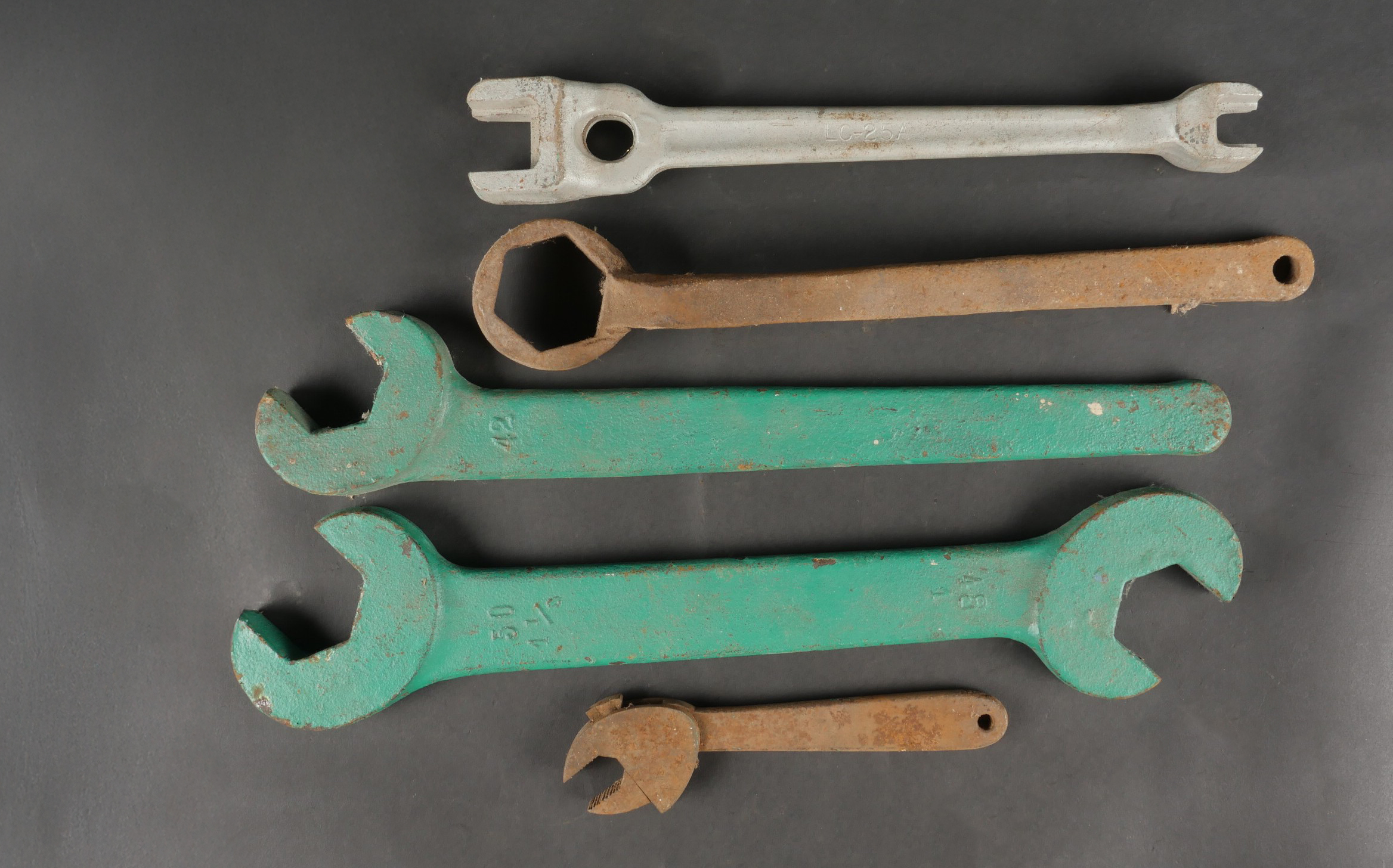 lot de 5 clés et cric. Dans une caisse pour 2cm incendiaires avec une belle étiquette, clés et cric époque et usage à déterminer, provenance Bastogne