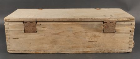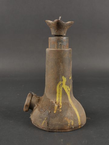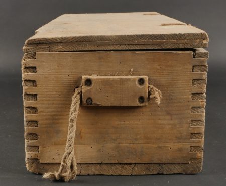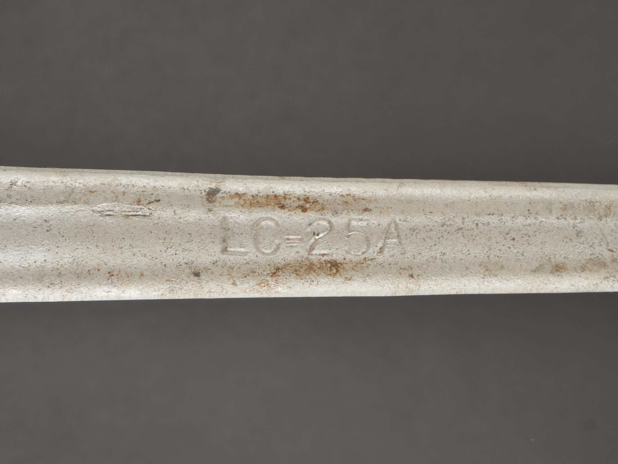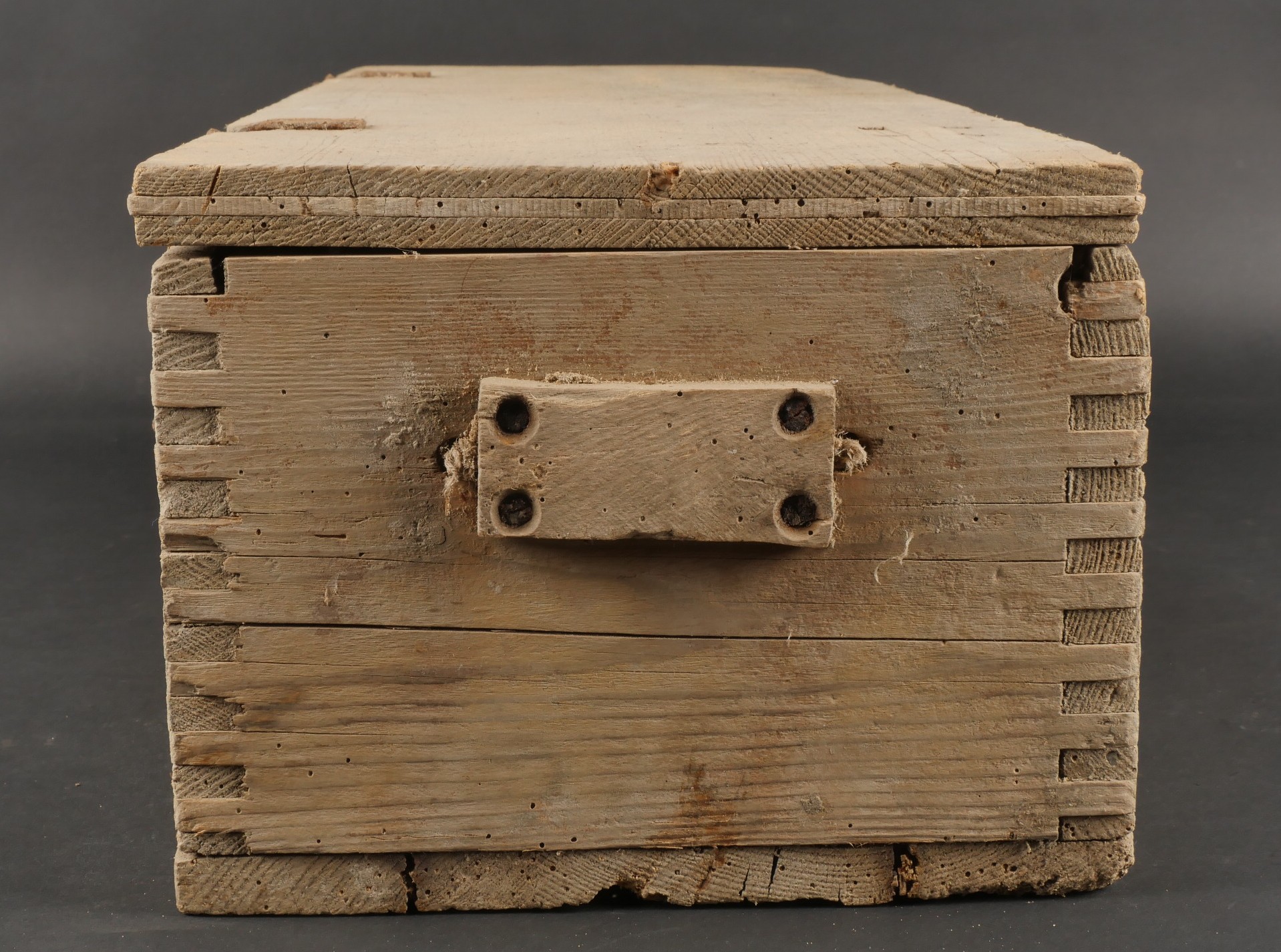 Détails de la vente >lot de 5 clés et cric. Dans une caisse pour 2cm incendiaires avec une belle étiquette, clés et cric époque et usage à déterminer, provenance Bastogne