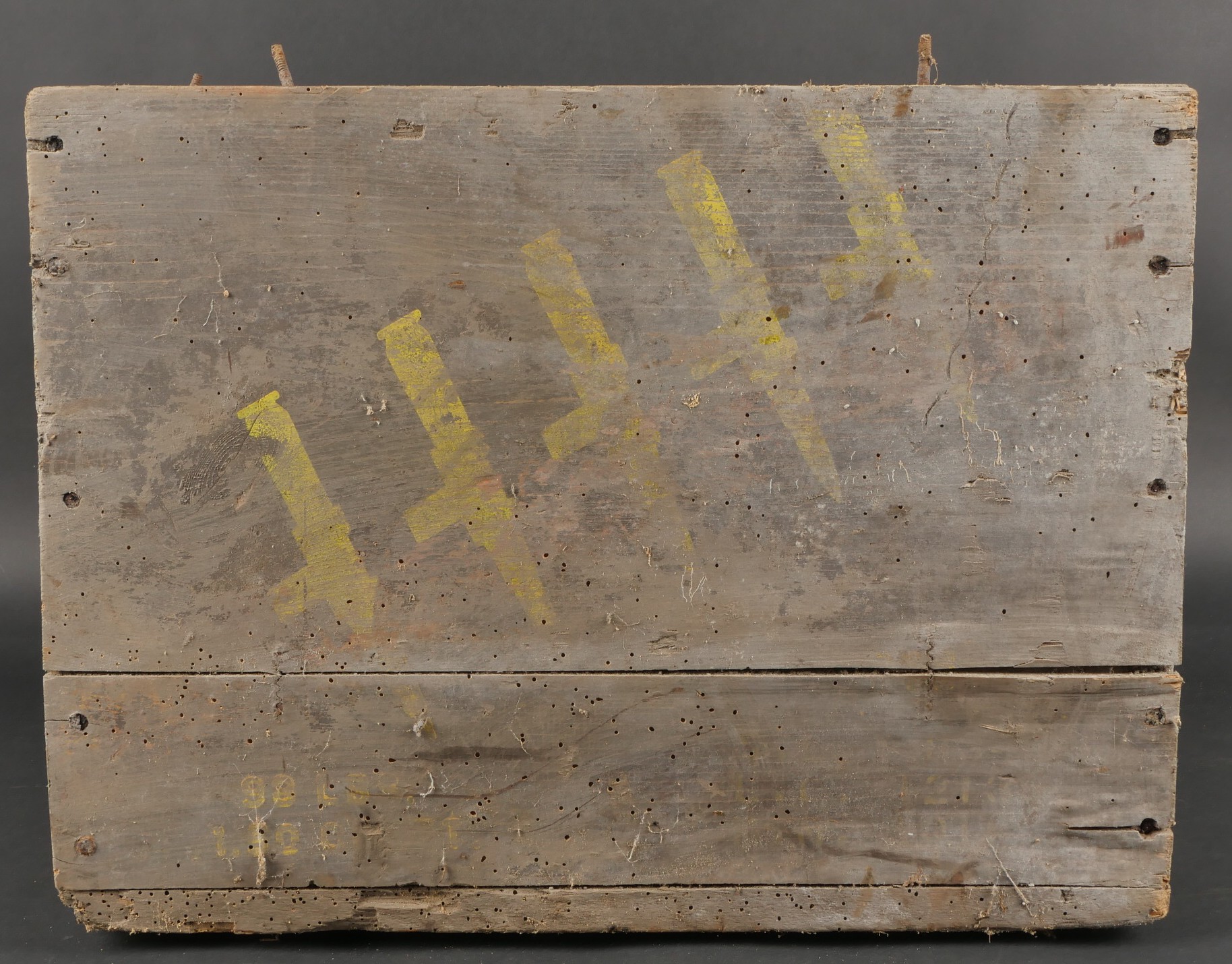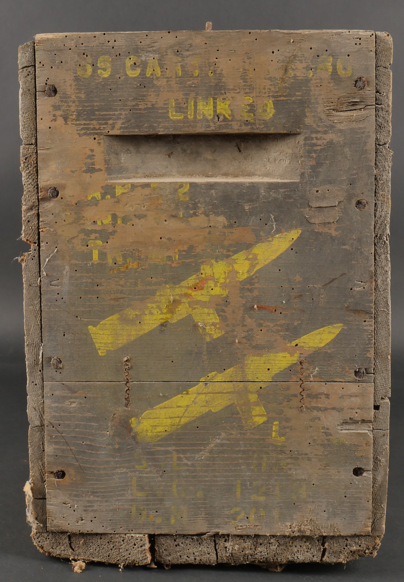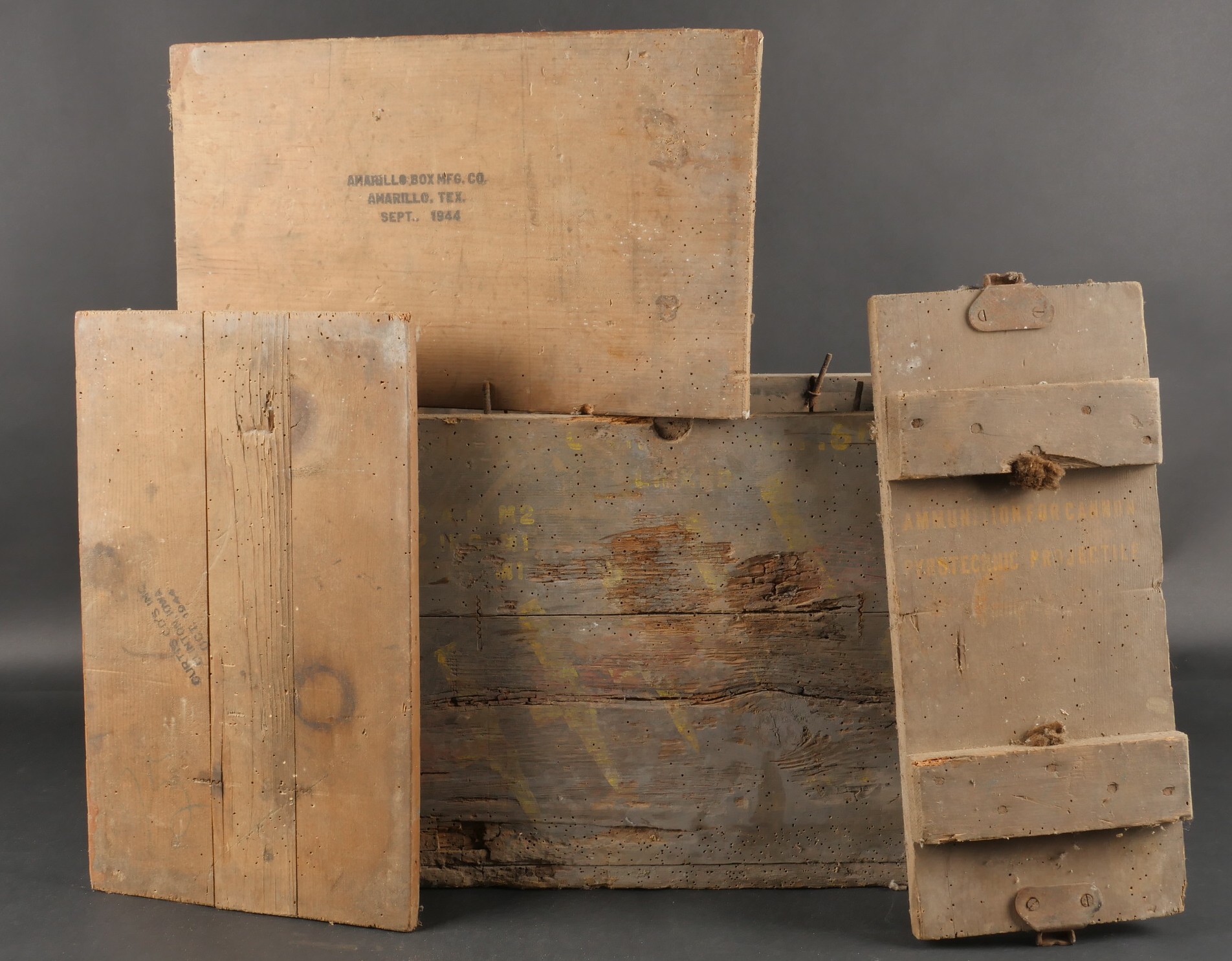 Lot de caisses et couvercles US. Caisse Cal.50 sans couvercle, couvercle de caisse de projectile, 2 couvercles datés septembre et octobre 1944