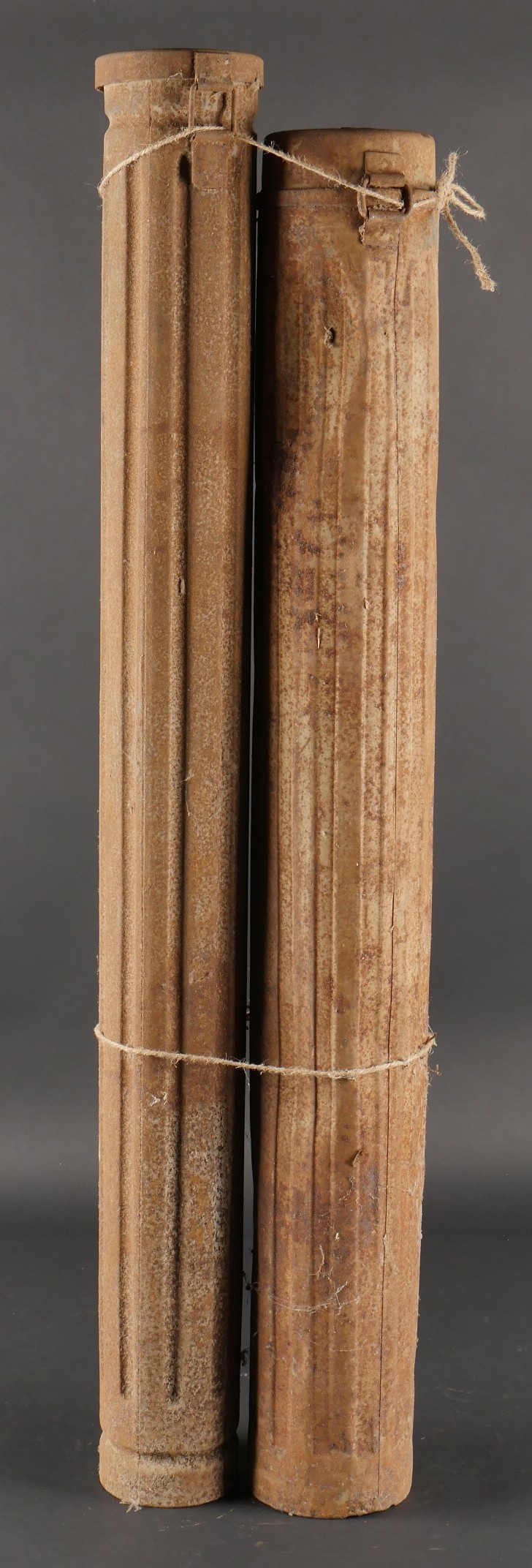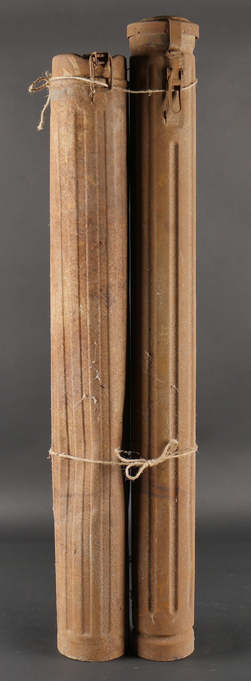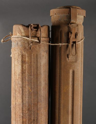 Lot de containers allemands PAK36 et 8,8 cm. En métal. Un pour 8,8 cm FLAK avec étiquette sous le couvercle, restes de peinture sable et de marquages. Un pour 7,62 cm PAK36 (r) avec étiquettes