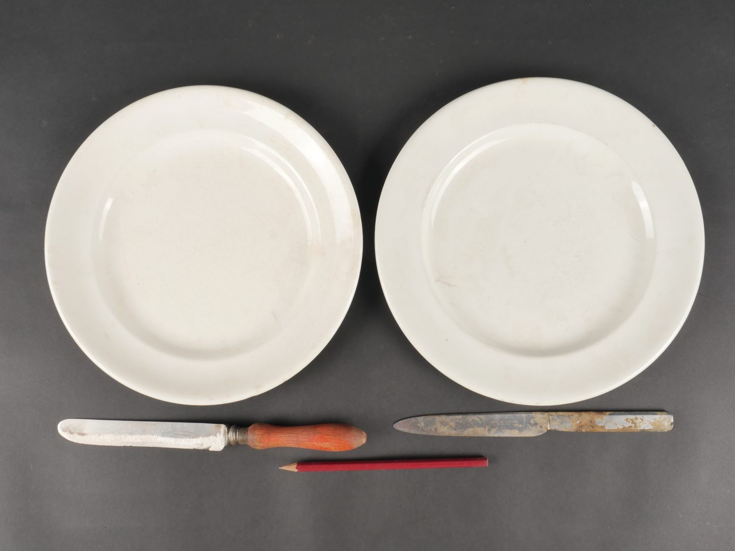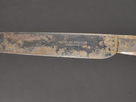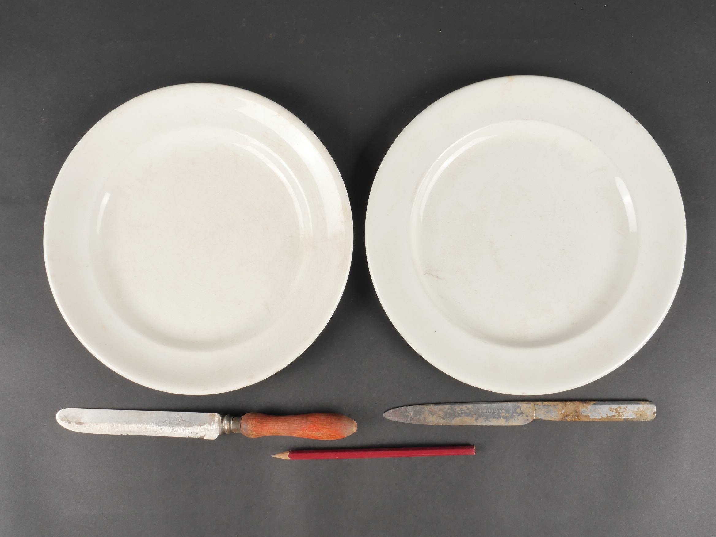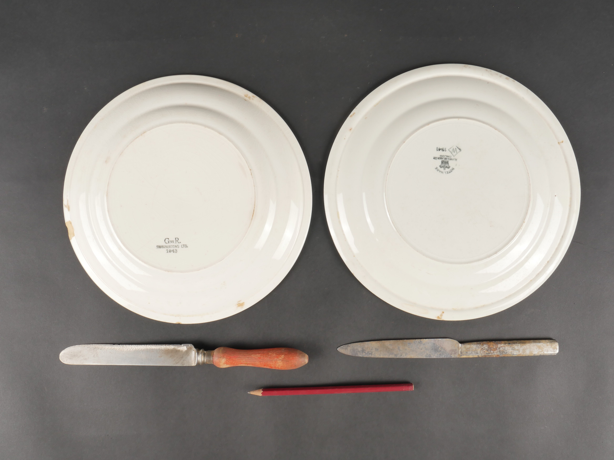 Lot d’objets civils amenés par les GI’s. Très intéressant lot d’objets récupérés par les soldats américains et emmenés avec eux sur le terrain, comprenant relique d’un briquet du terrain marqué LONDON 1944 avec initiales, un couteau Sheffield, un couteau marqué Hôtel de France à Sézanne, 2 assiettes d’Hotels anglais datées 1941 et l’autre CREST HOTEL 1943 et un crayon de bois.