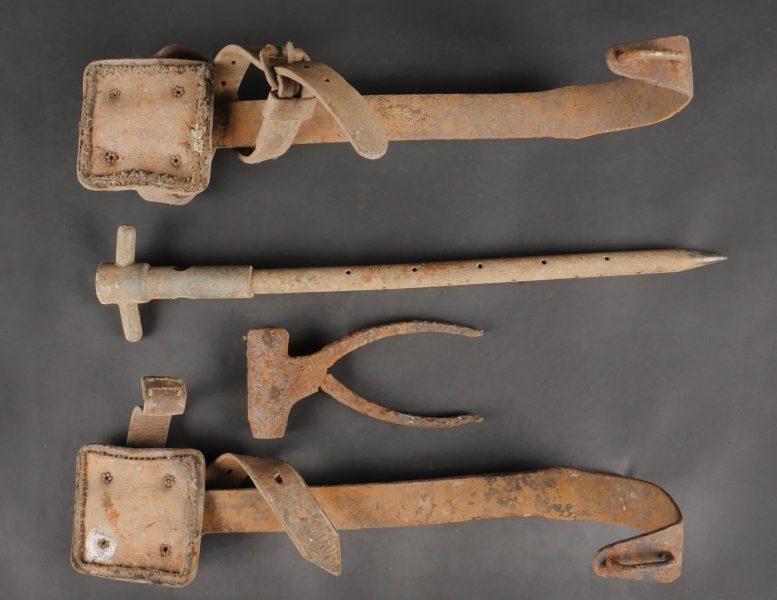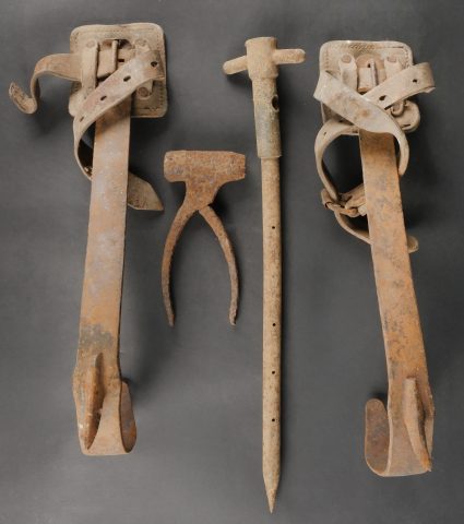 Détails de la vente >Lot télégraphiste et Pionnier allemand. Paire de grimpettes de télégraphiste téléphoniste, piquet de terre, et pince à sertir du terrain