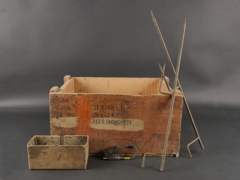 Lot US Signal Corps caisse et dispositif d’alarme. Rare caisse en bois pour batteries Signal Corps, bien marquée avec son étiquette. 2 piquets et un couvercle de boîte de Flare trip Mk... en savoir plus
