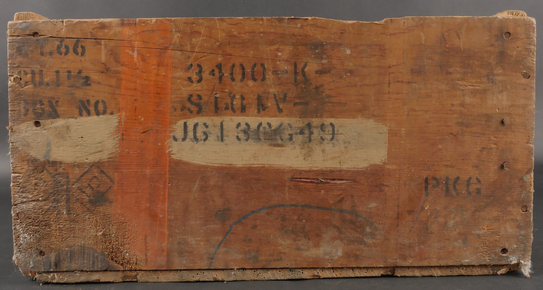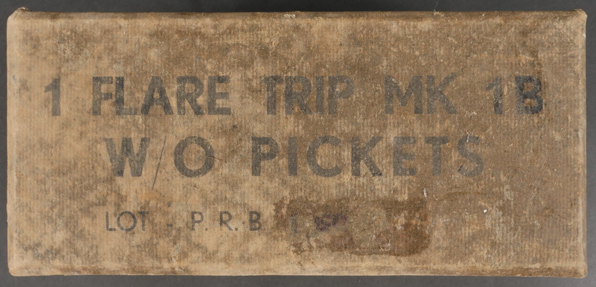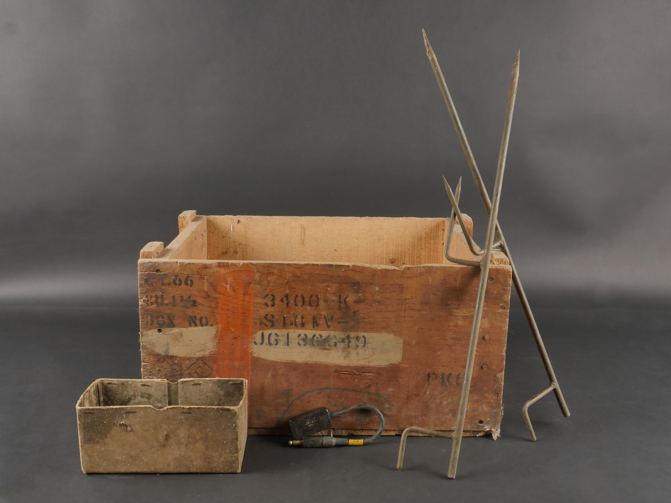 Lot US Signal Corps caisse et dispositif d’alarme. Rare caisse en bois pour batteries Signal Corps, bien marquée avec son étiquette. 2 piquets et un couvercle de boîte de Flare trip Mk 1B, dispositif d’alarme lumineux. Un connecteur ou transformateur à identifier.