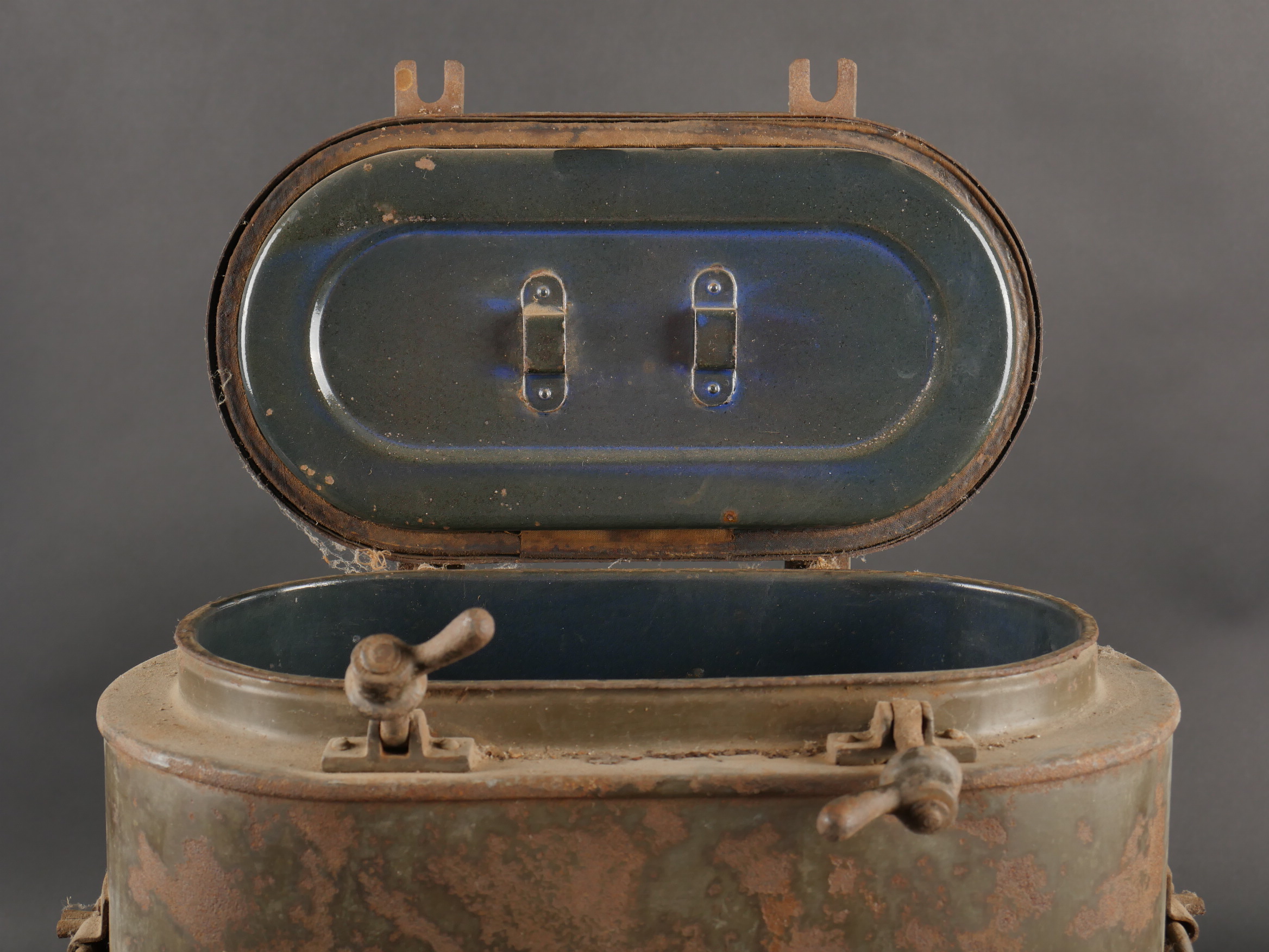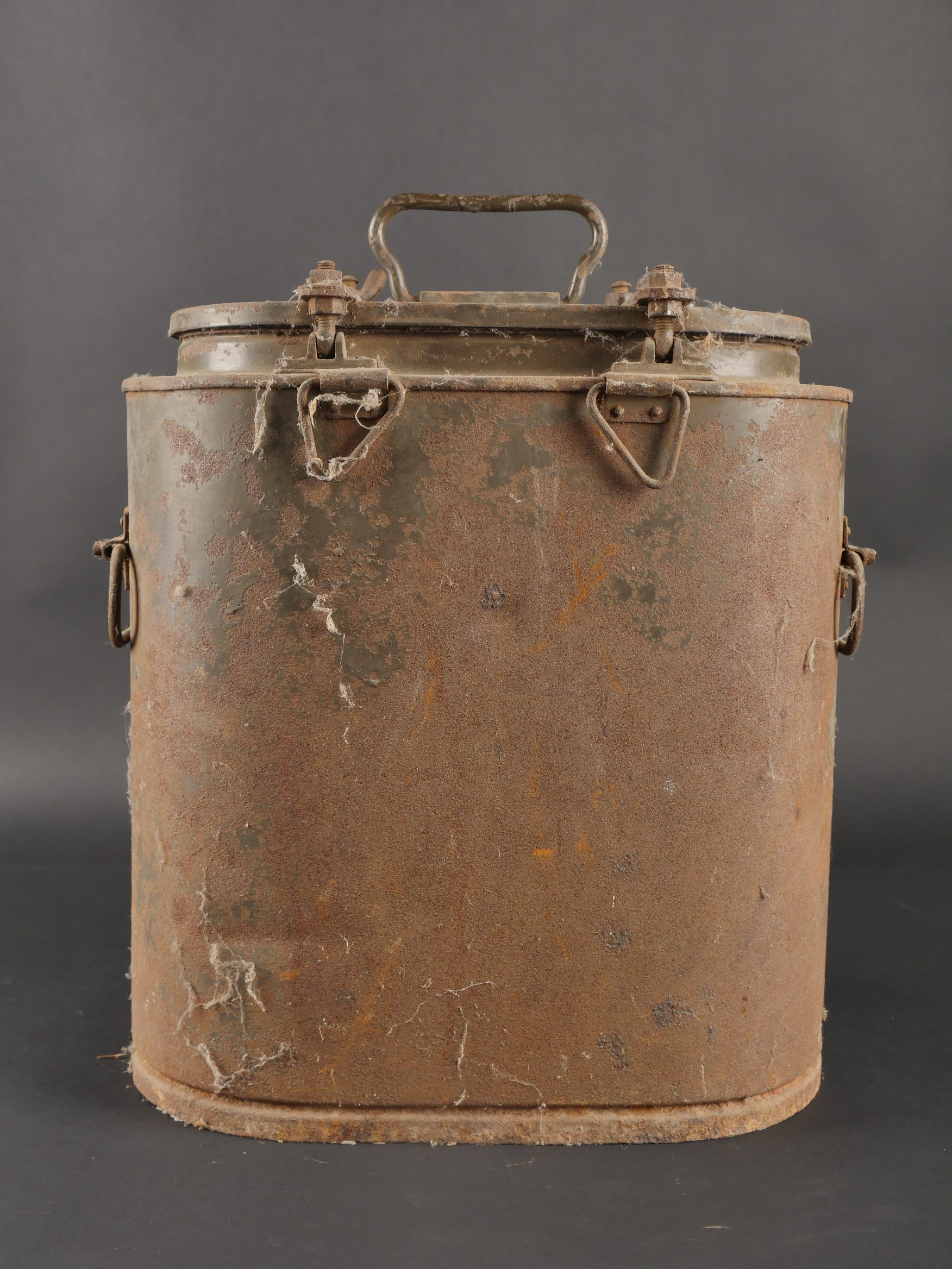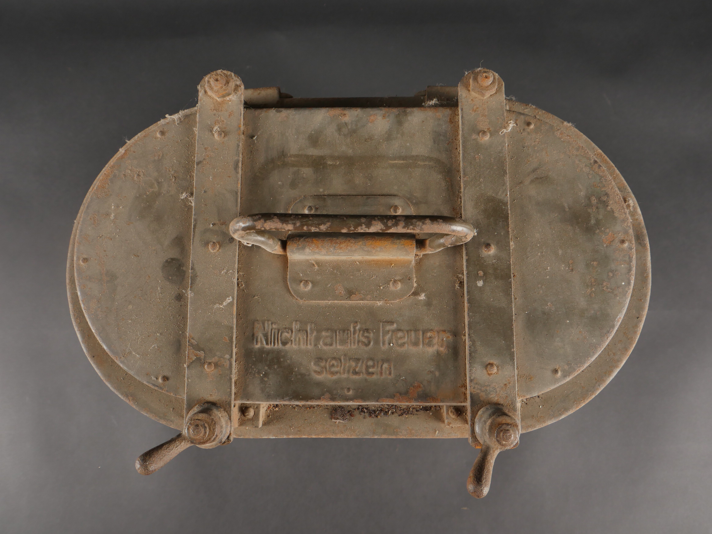Détails de la vente >Norvégienne allemande. En fer peint feldgrau. Très beau couvercle, rouille sur les côtés. Intérieur émaillé bleu très propre.