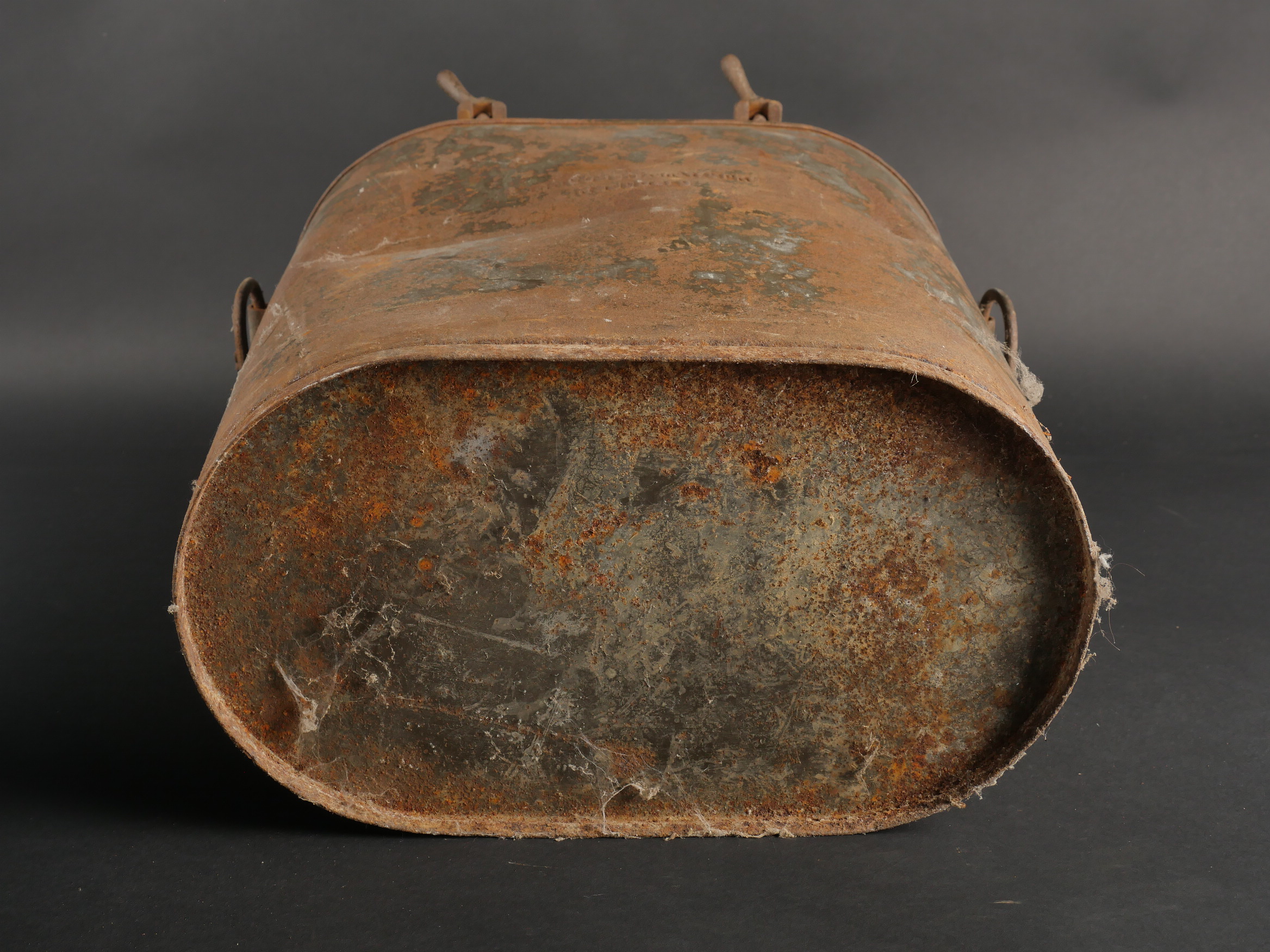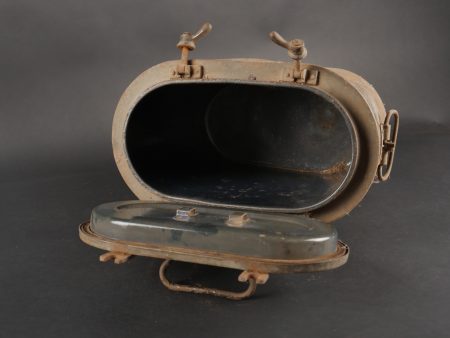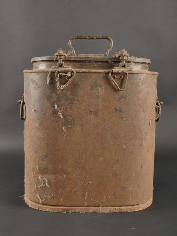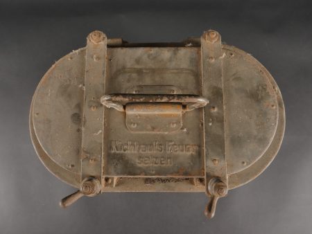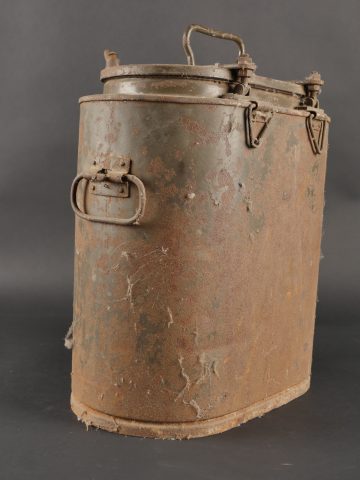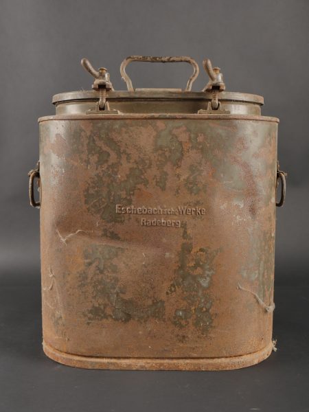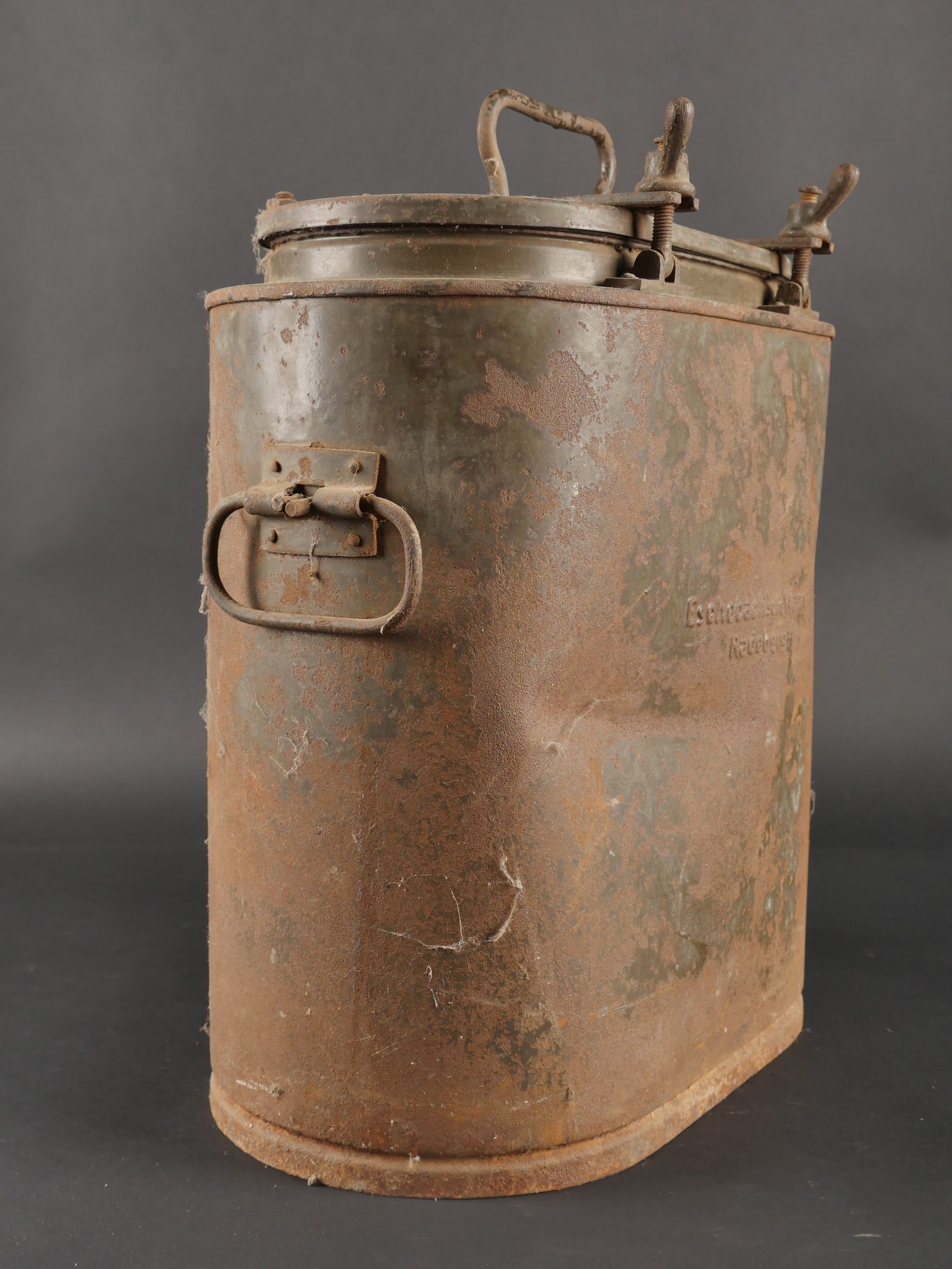 Détails de la vente >Norvégienne allemande. En fer peint feldgrau. Très beau couvercle, rouille sur les côtés. Intérieur émaillé bleu très propre.