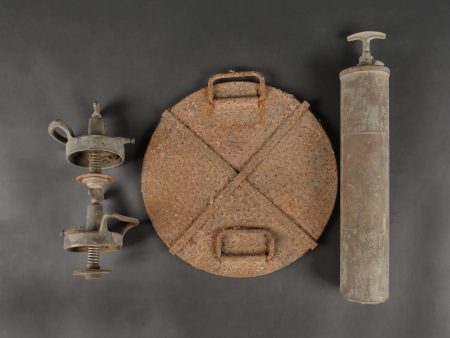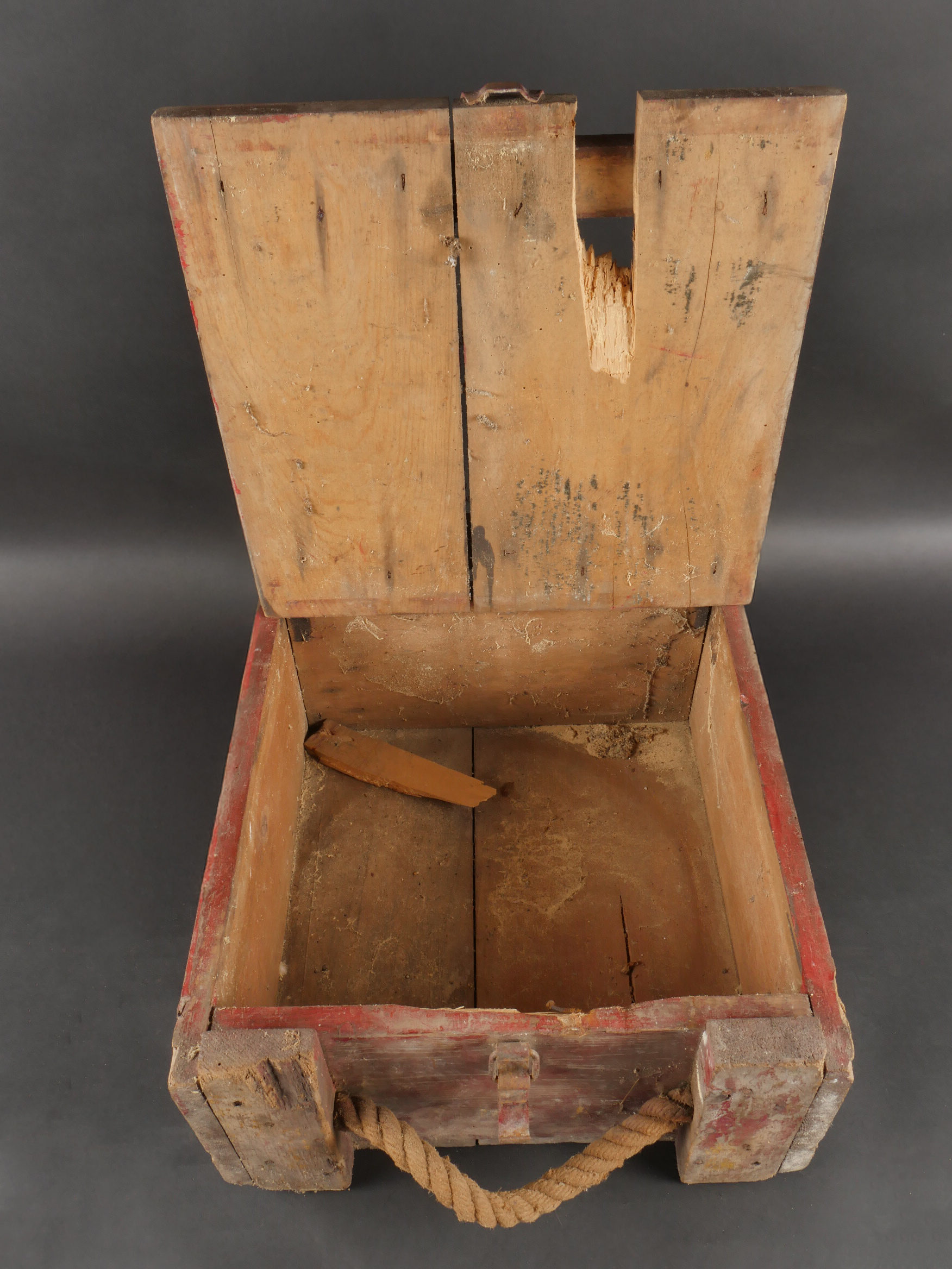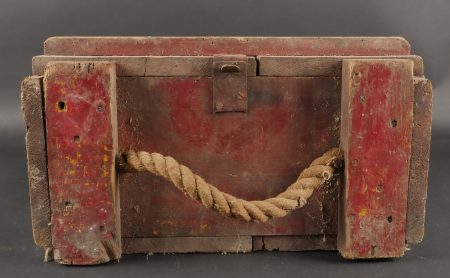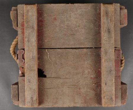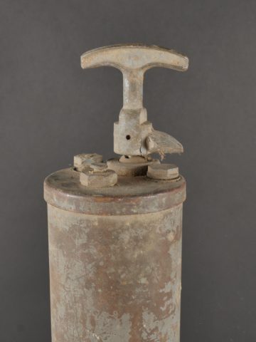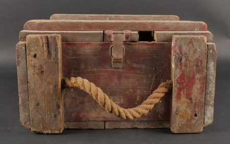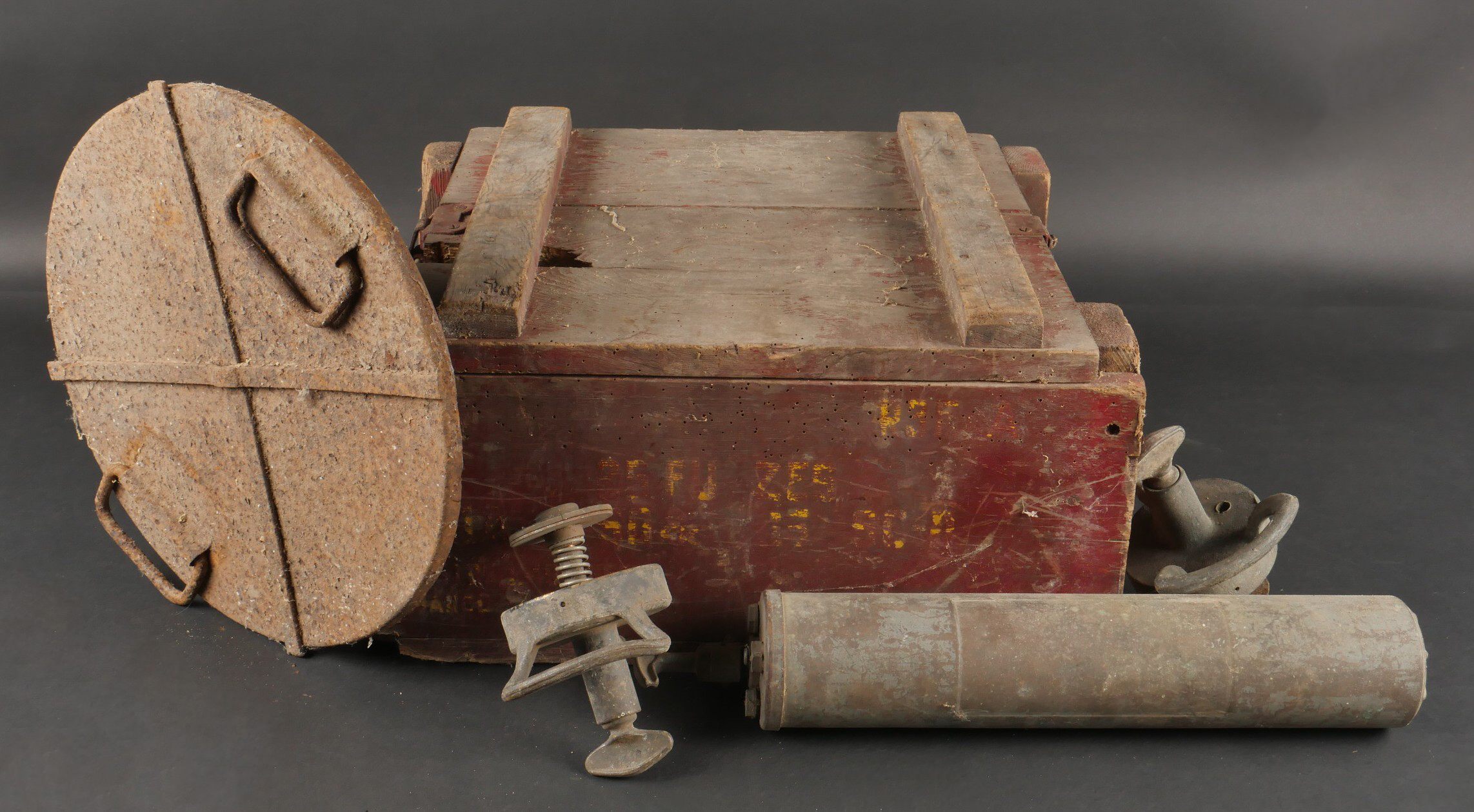 Détails de la vente >Pulvérisateur de décontamination US et caisse. Pulvérisateur, 2 têtes de pulvérisateur ou extincteur à identifier, caisse pour 25 fusées M51A et un couvercle de container