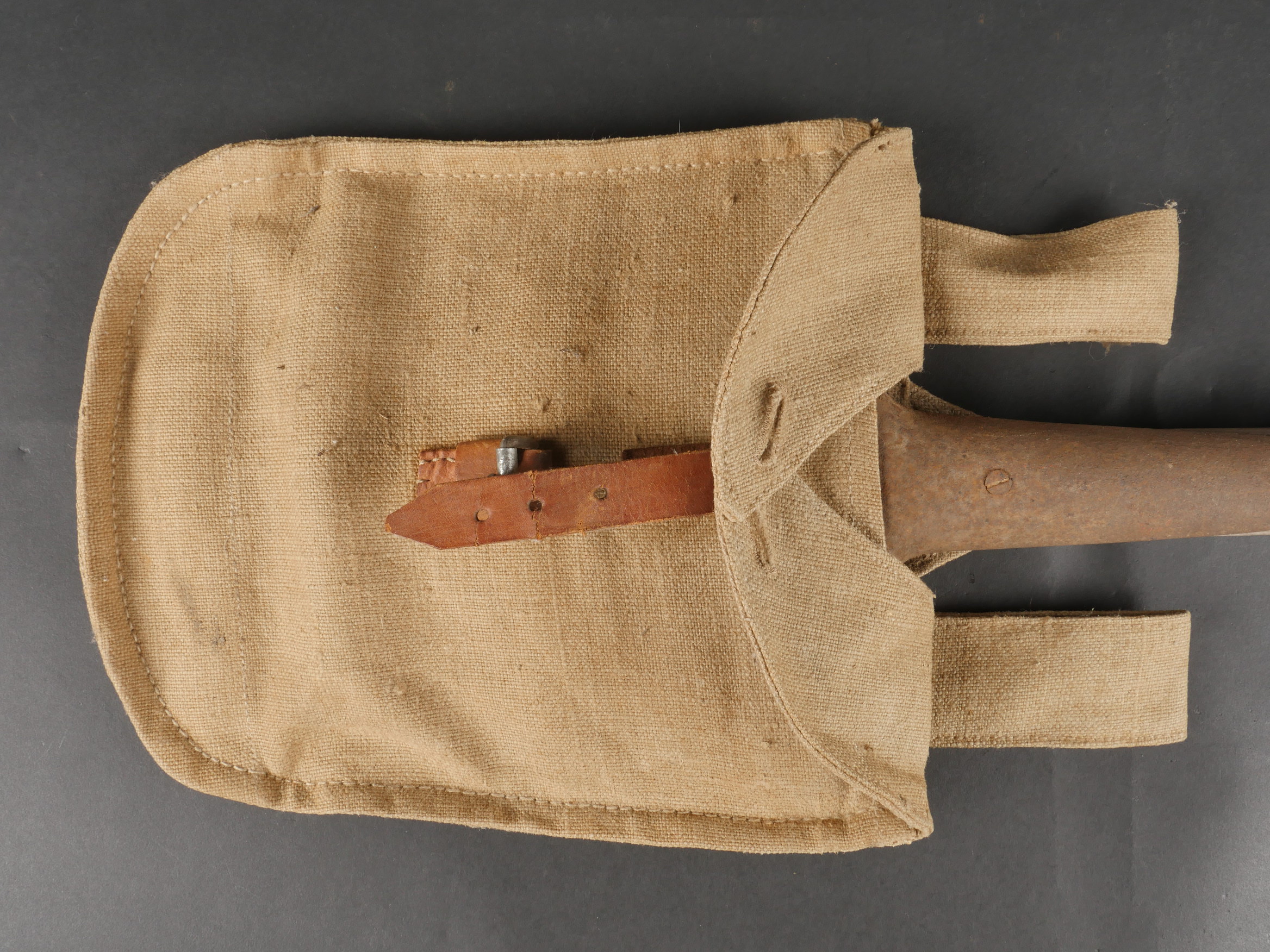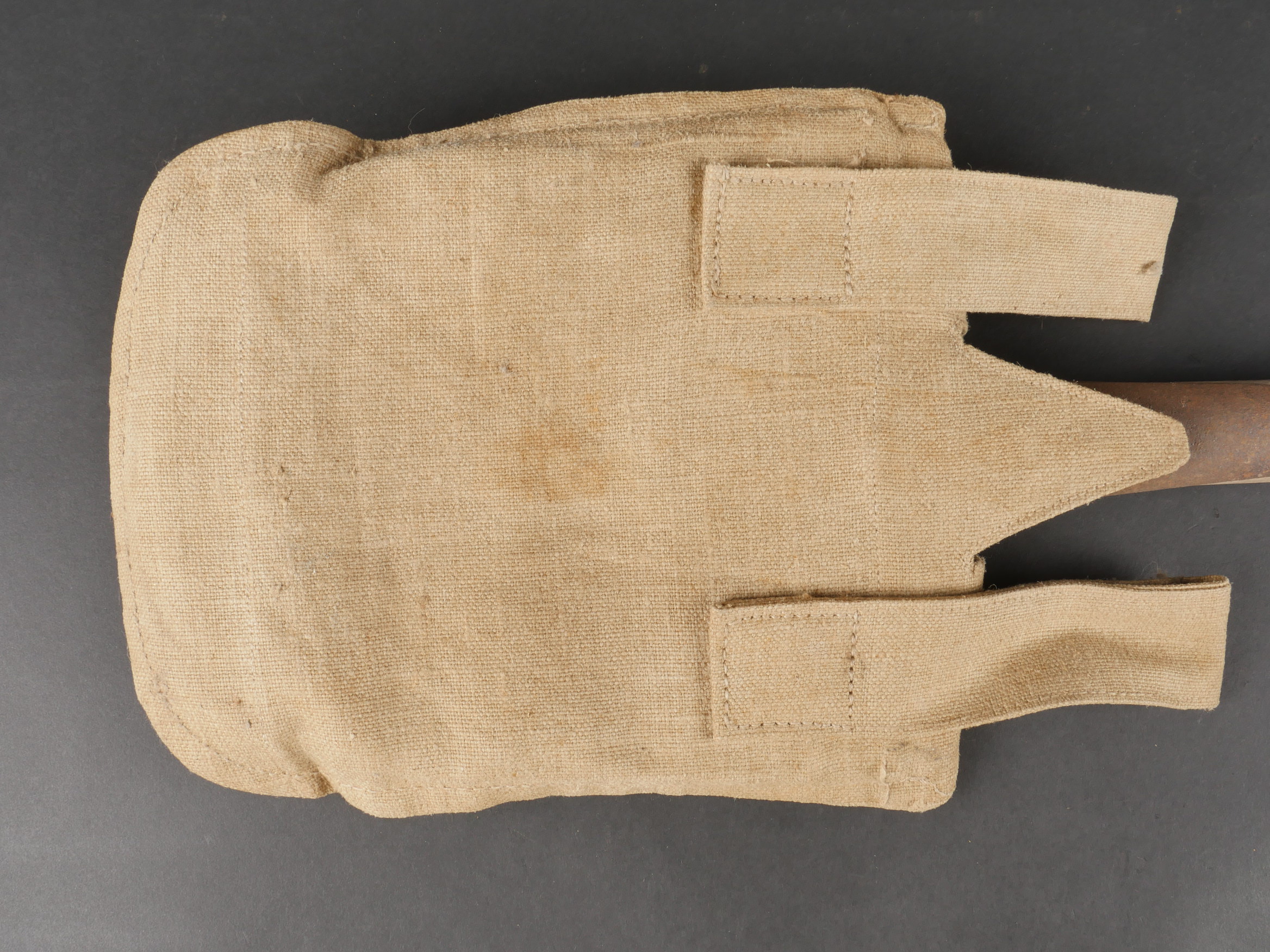 Russie housse de pelle en toile. Housse en toile écrue avec plusieurs marquages, avec à l’intérieur une pelle de parc allemande. Authenticité non garantie.