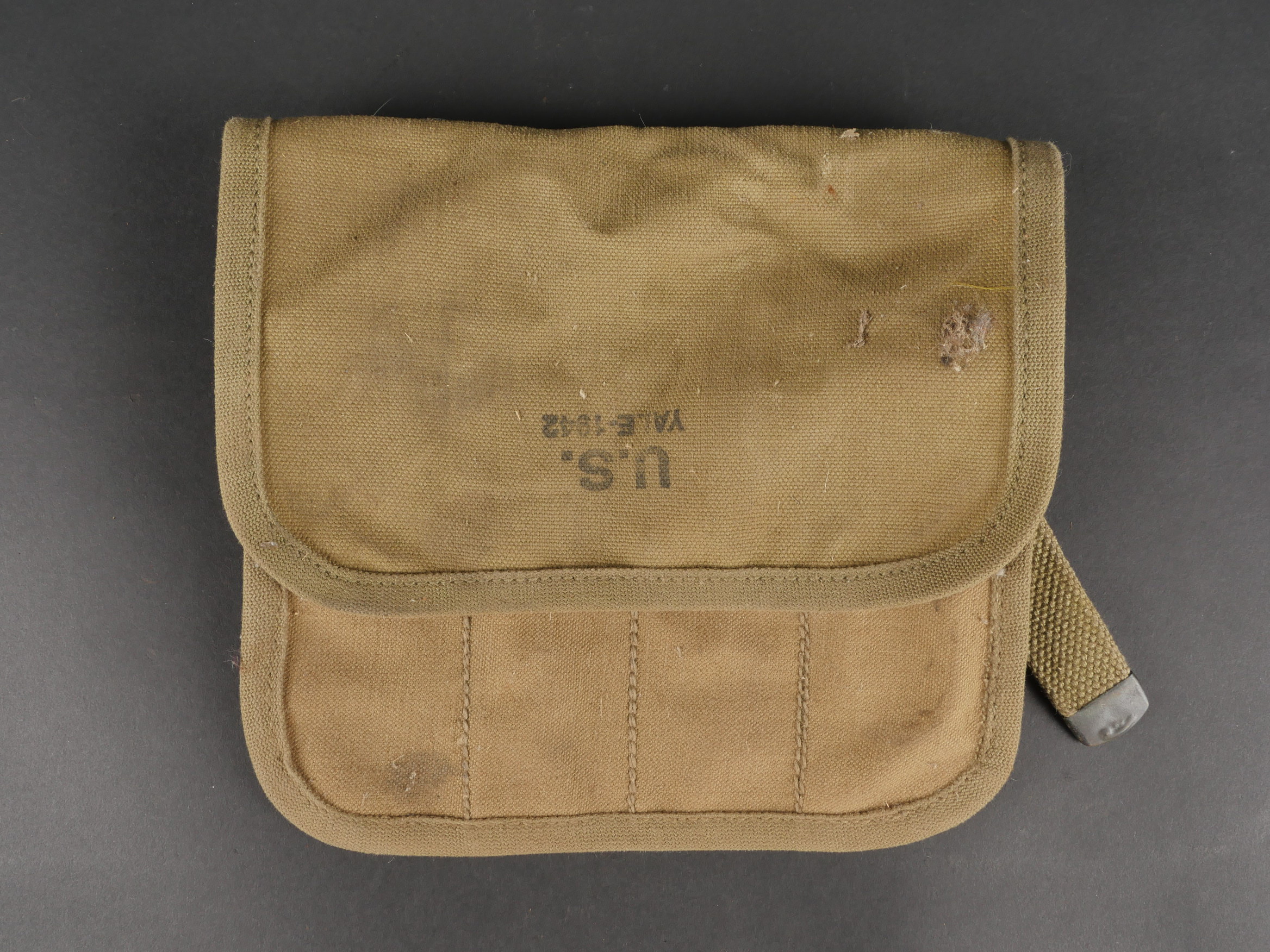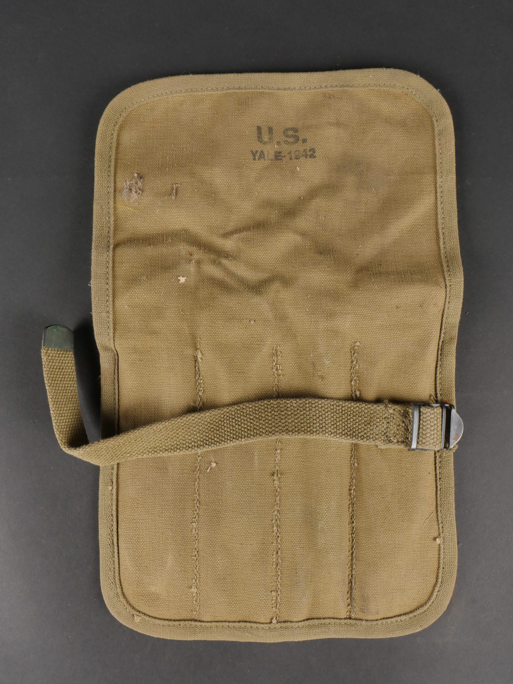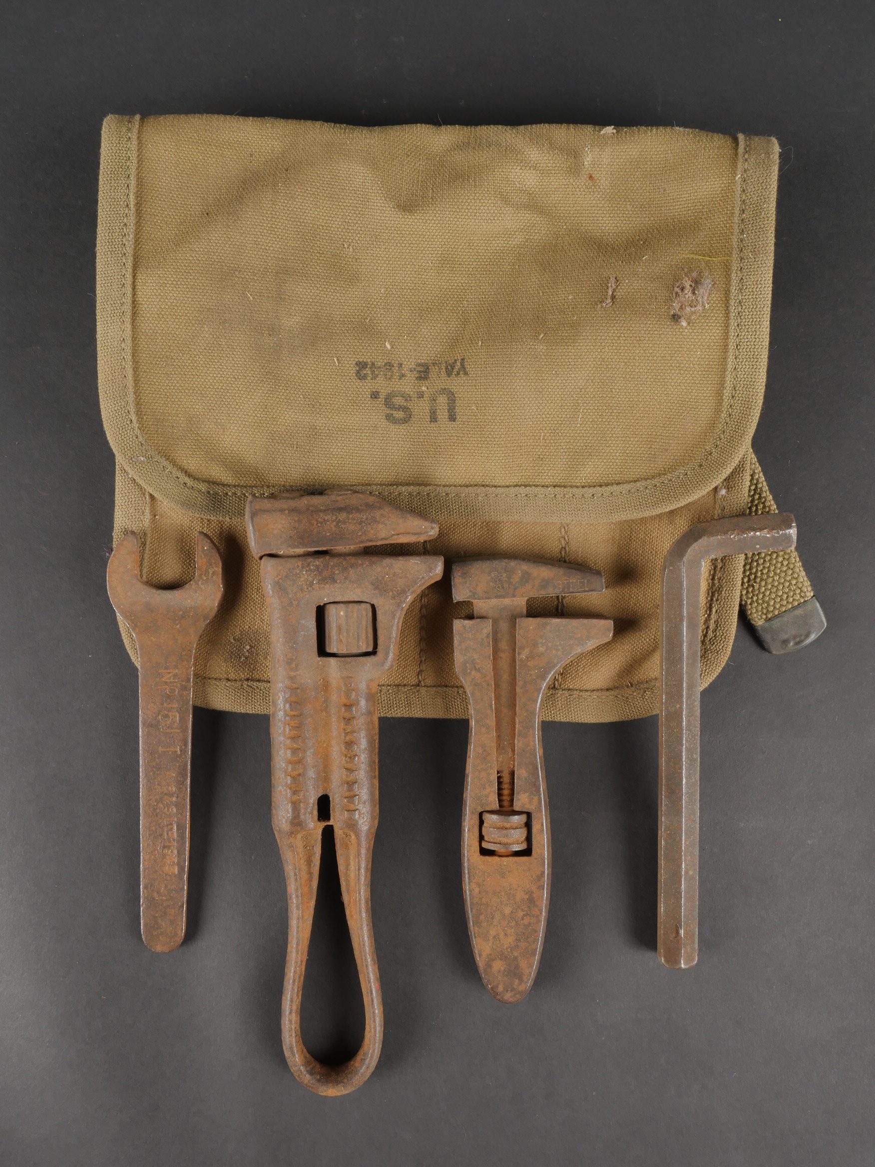 Détails de la vente >Trousse d’outillage US . Trousse en toile datée 1942 avec 2 clés à mollette, clé plate, clé coudée.